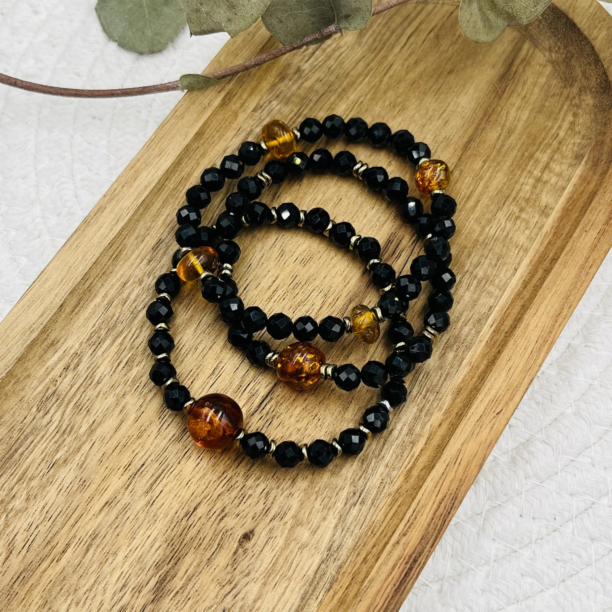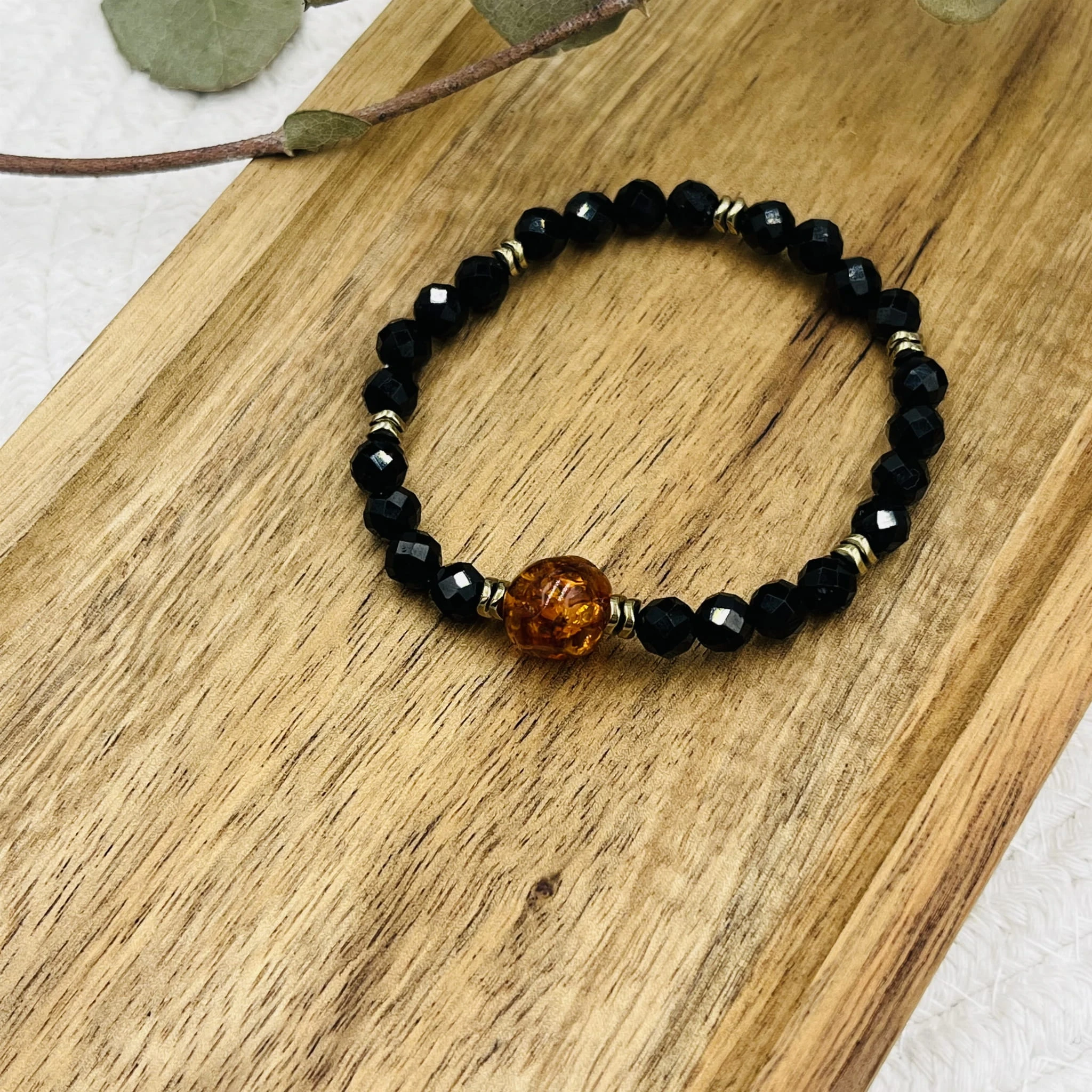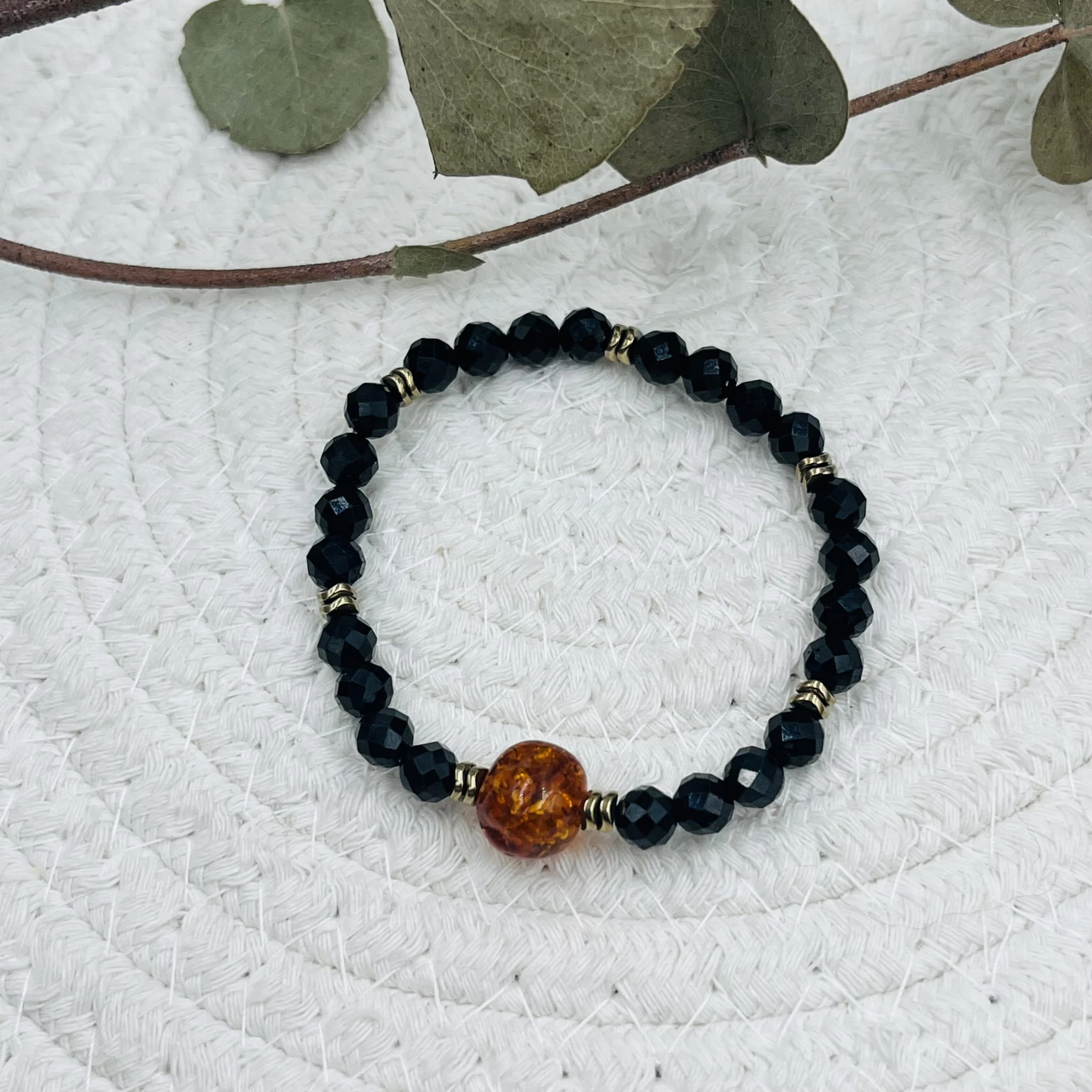 Ręcznie wykonana bransoletka na elastycznej gumce z czarnego turmalinu 6 mm, bursztynu bałtyckiego 10 mm oraz złotego hematytu w formie płaskich elementów. Wyraziste zestawienie głębokiej czerni i ciepłego bursztynu tworzy elegancką, naturalną kompozycję.