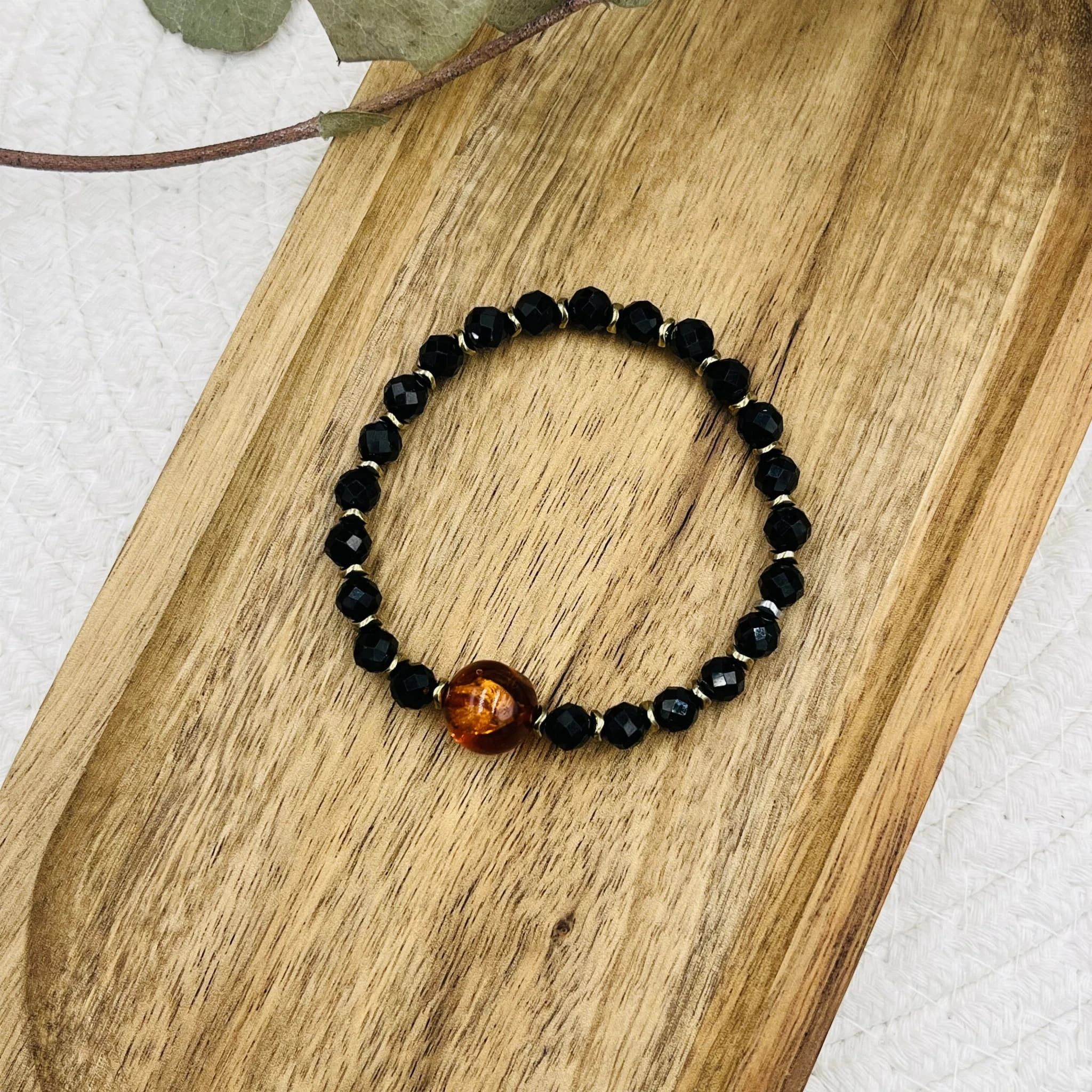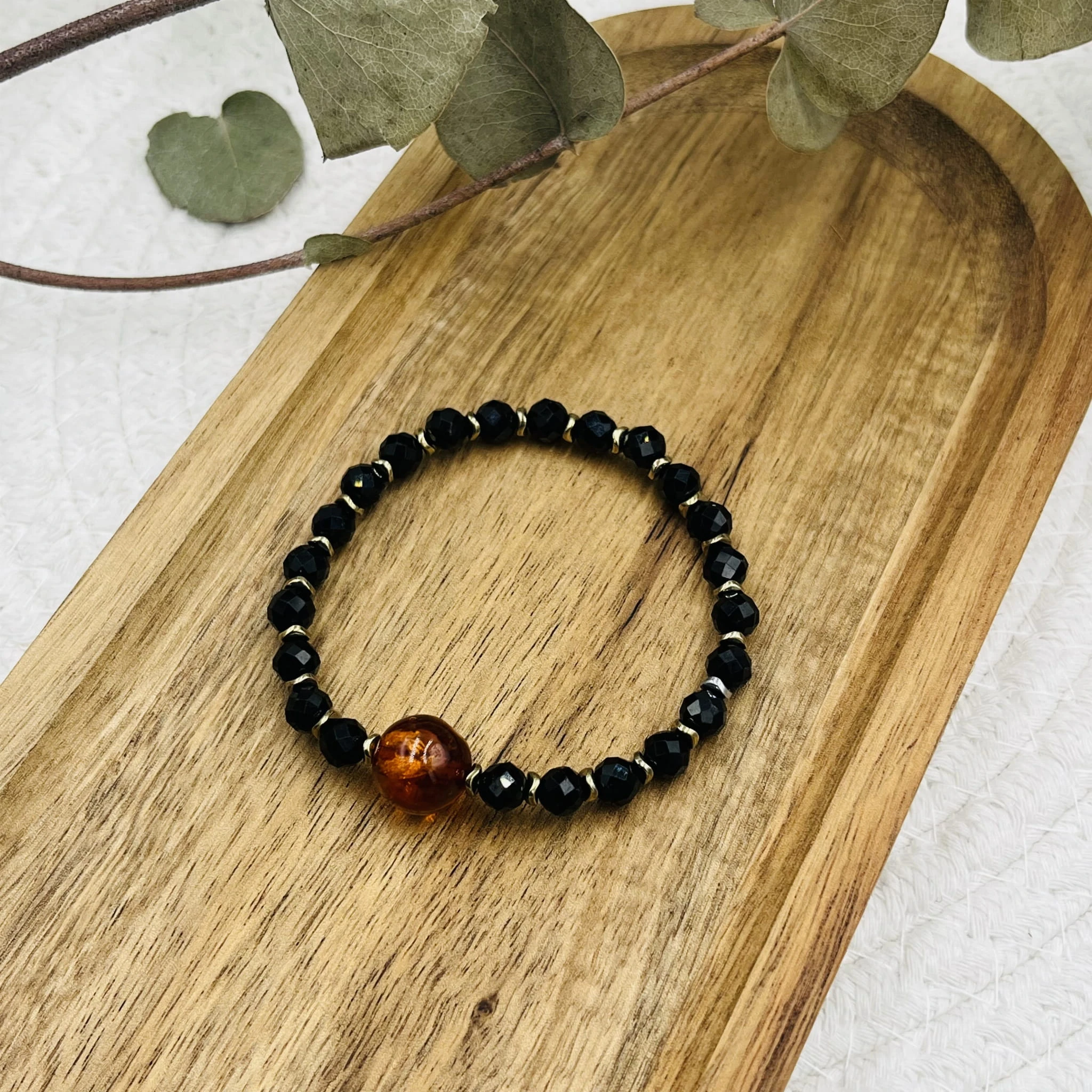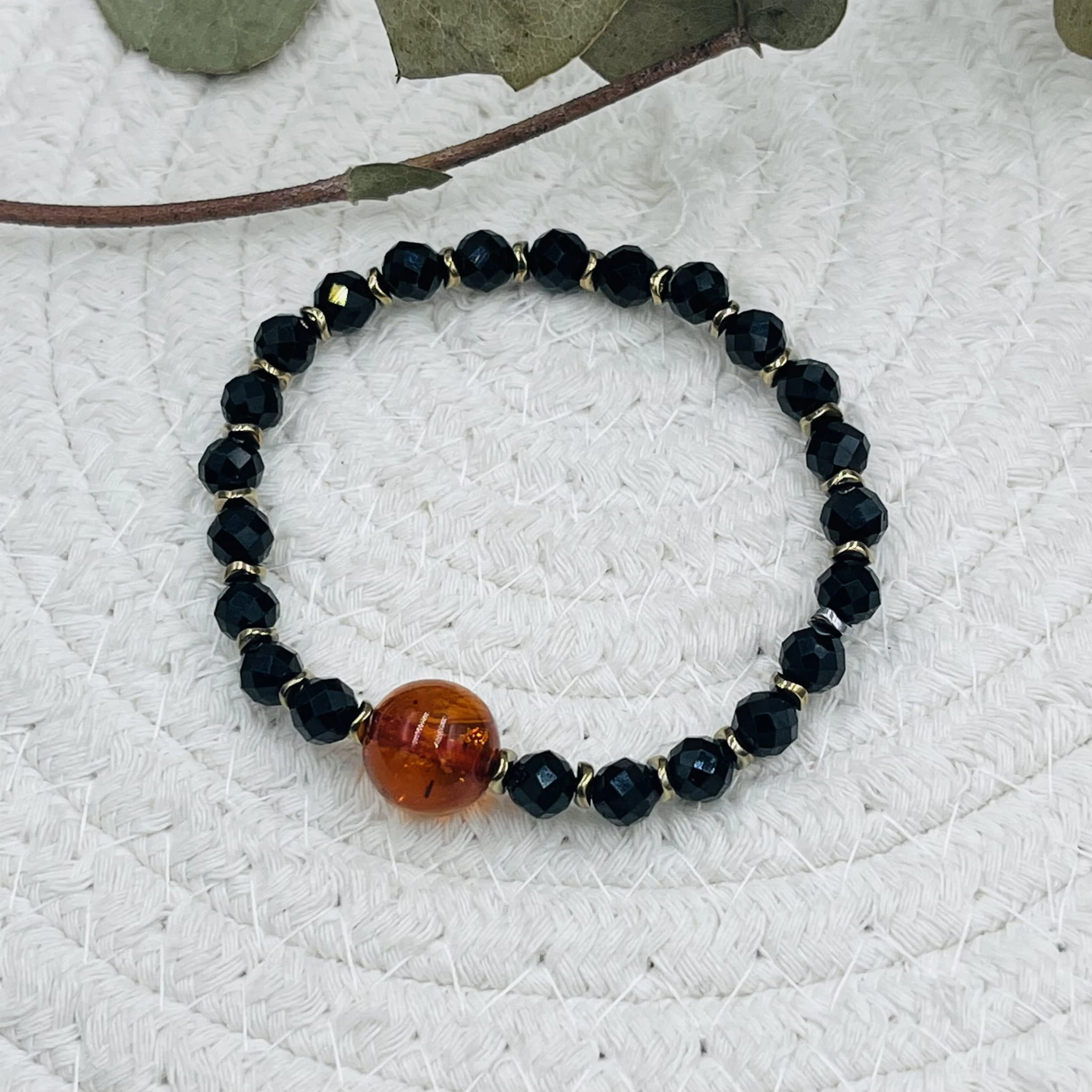 Ręcznie wykonana bransoletka na elastycznej gumce z czarnego turmalinu 6 mm, bursztynu bałtyckiego 10 mm oraz złotego hematytu w formie płaskich elementów. Wyraziste zestawienie głębokiej czerni i ciepłego bursztynu tworzy elegancką, naturalną kompozycję.