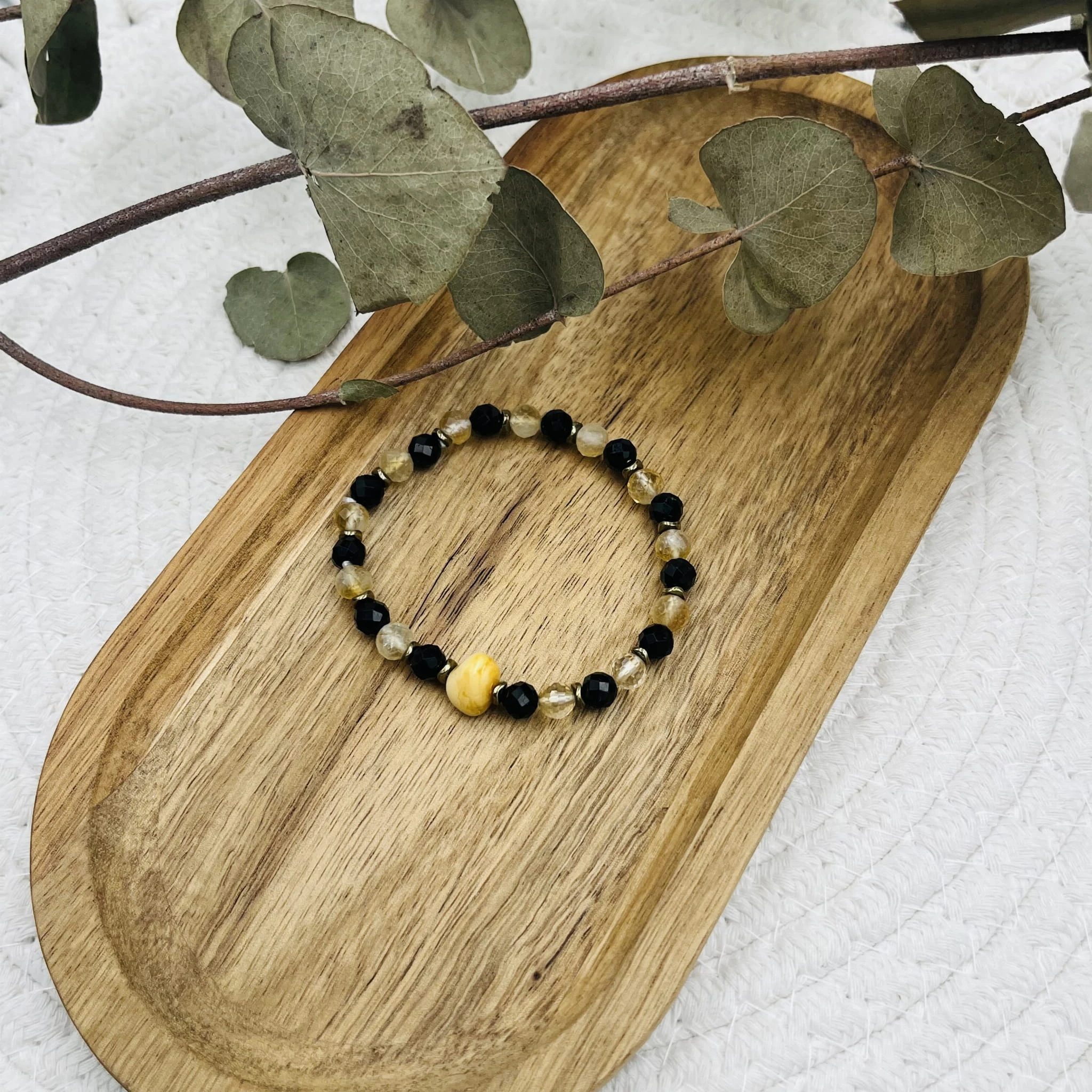 Ręcznie wykonana bransoletka damska na elastycznej gumce z fasetowanego czarnego turmalinu 6 mm, fasetowanego cytrynu 6 mm, bursztynu bałtyckiego oraz złotego hematytu. Połączenie głębokiej czerni, ciepłego bursztynu i jasnych tonów cytrynu tworzy elegancką, naturalną kompozycję.