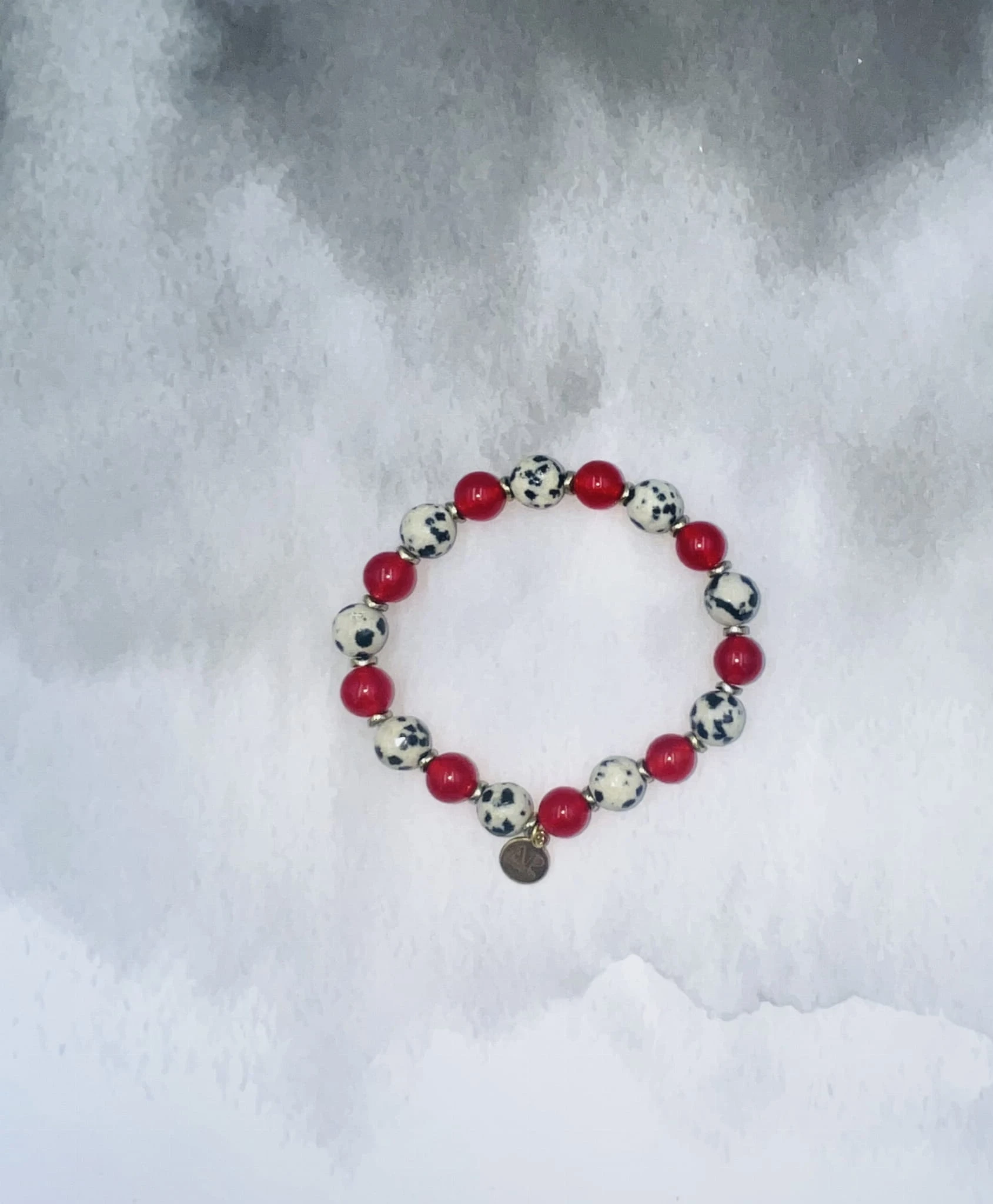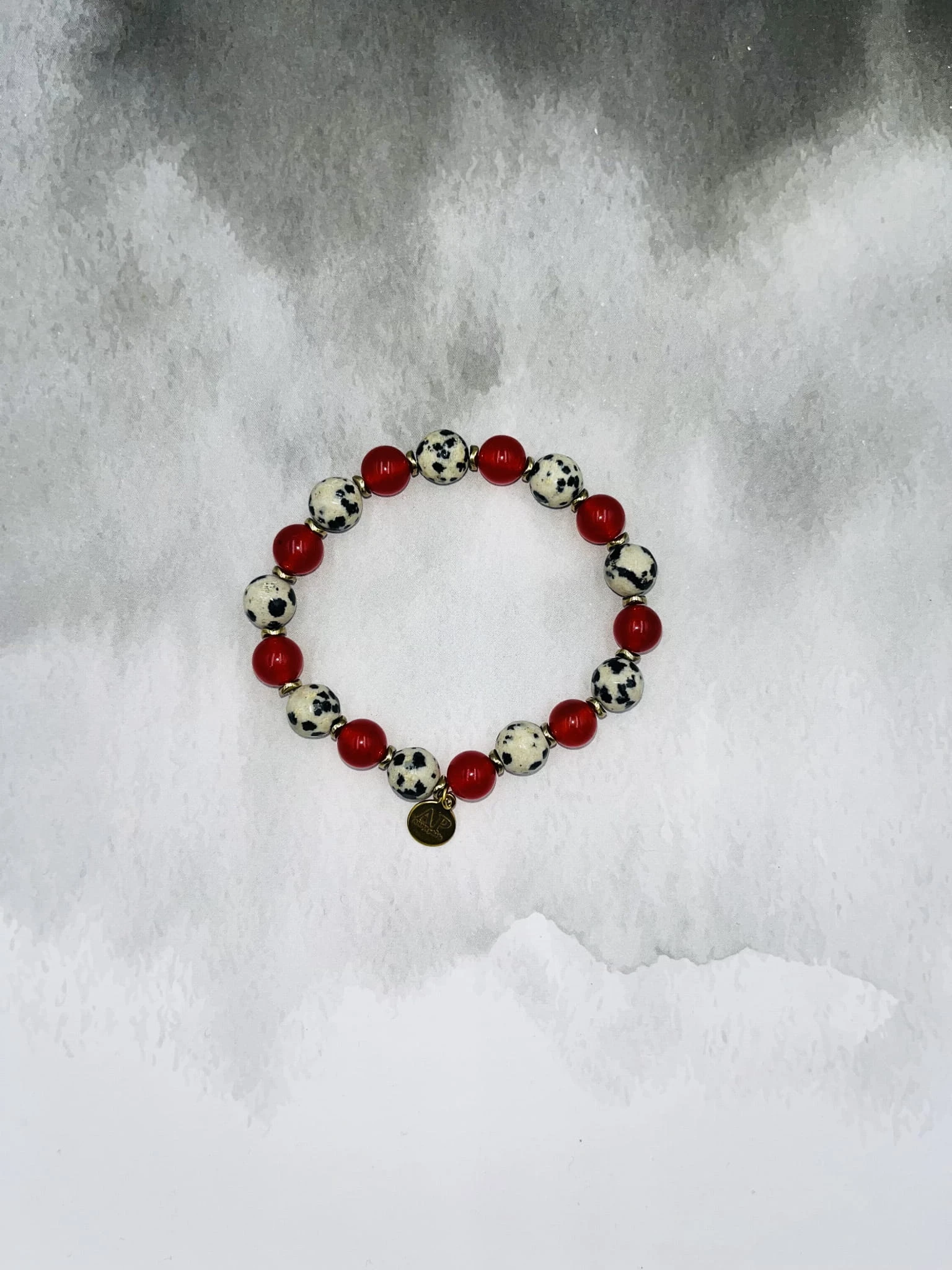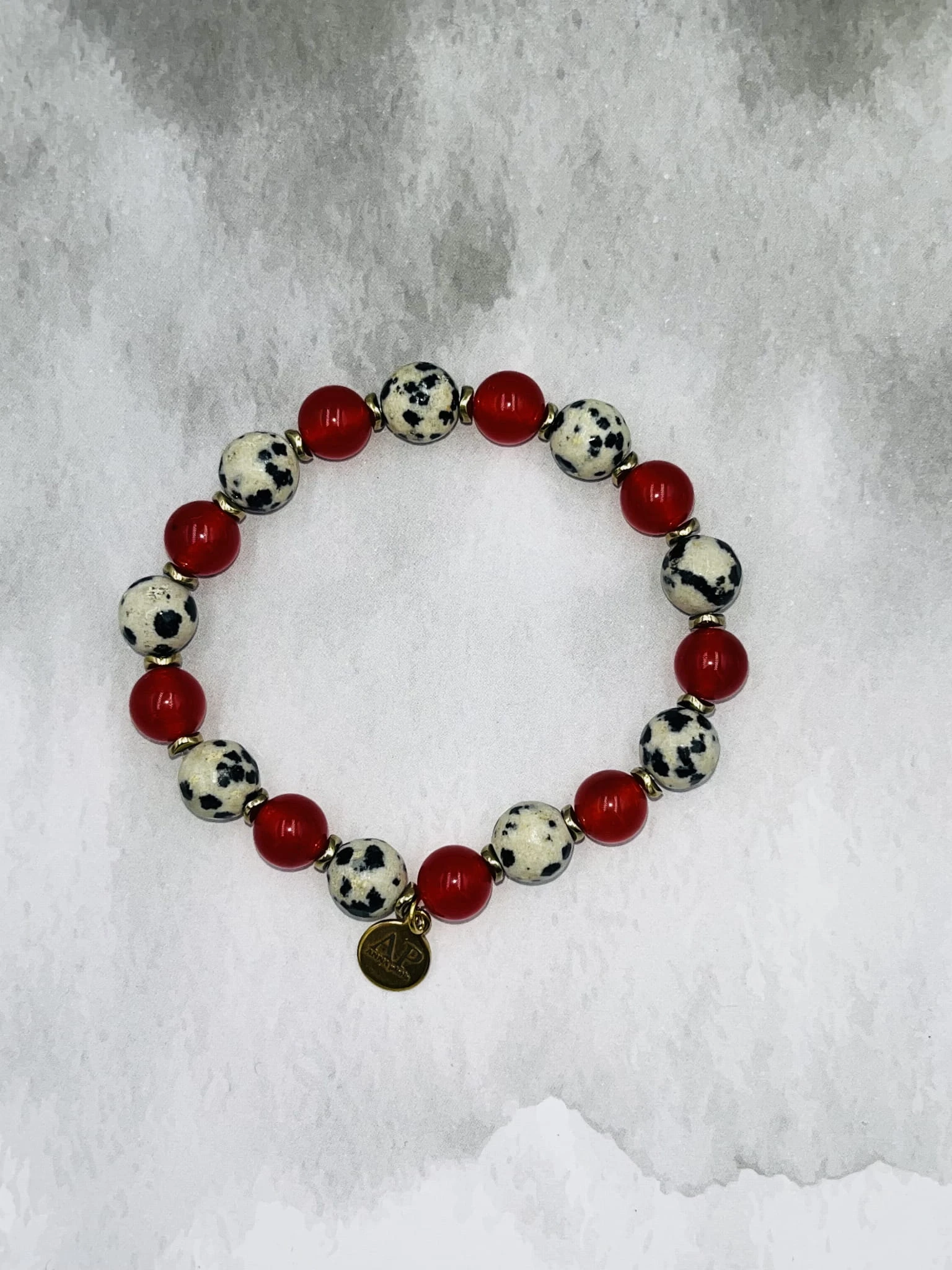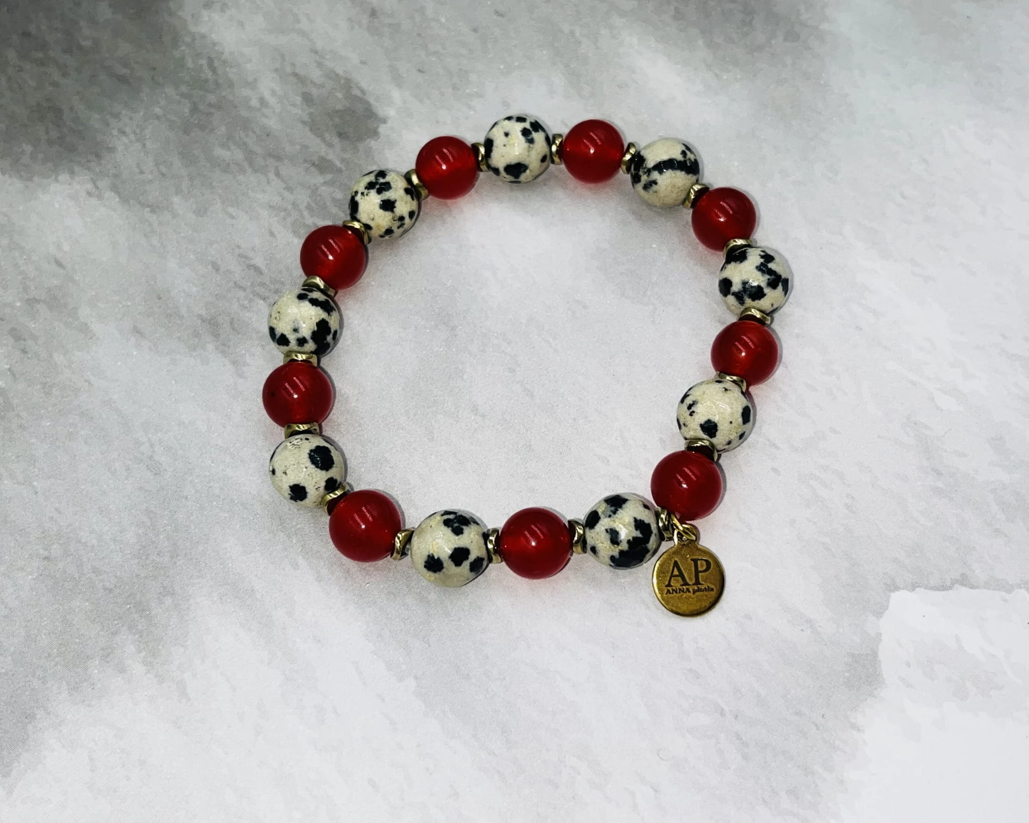 Ręcznie wykonana bransoletka damska na elastycznej gumce z fasetowanego jaspisu dalmatyńskiego 8 mm, gładkiego czerwonego agatu 6 mm oraz złotego hematytu. Kontrast jasnego, nakrapianego kamienia z głęboką czerwienią tworzy elegancką i wyrazistą kompozycję.