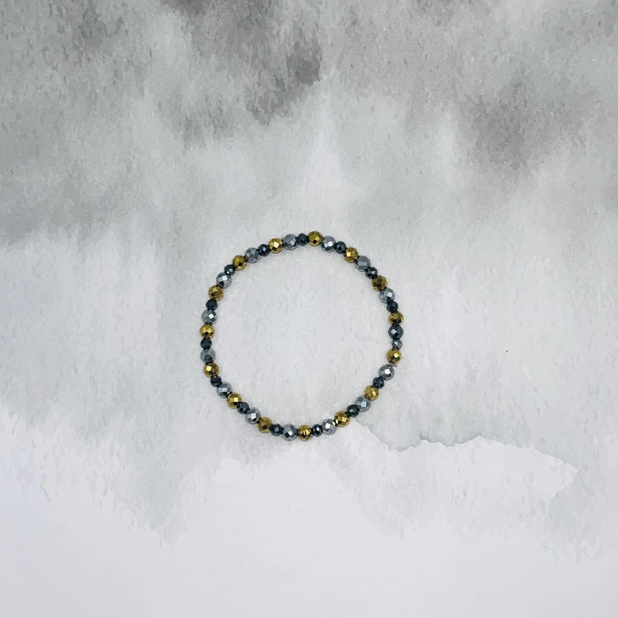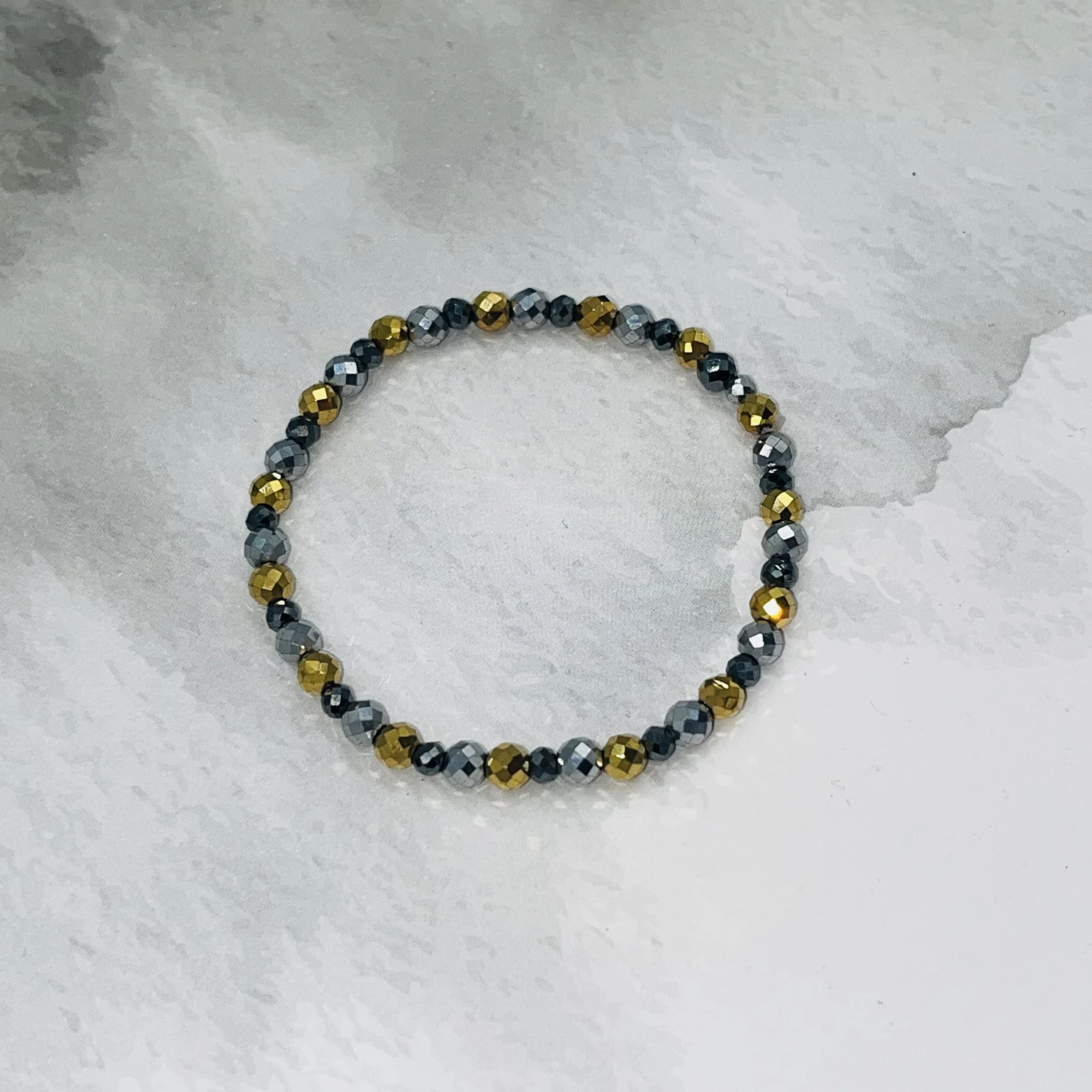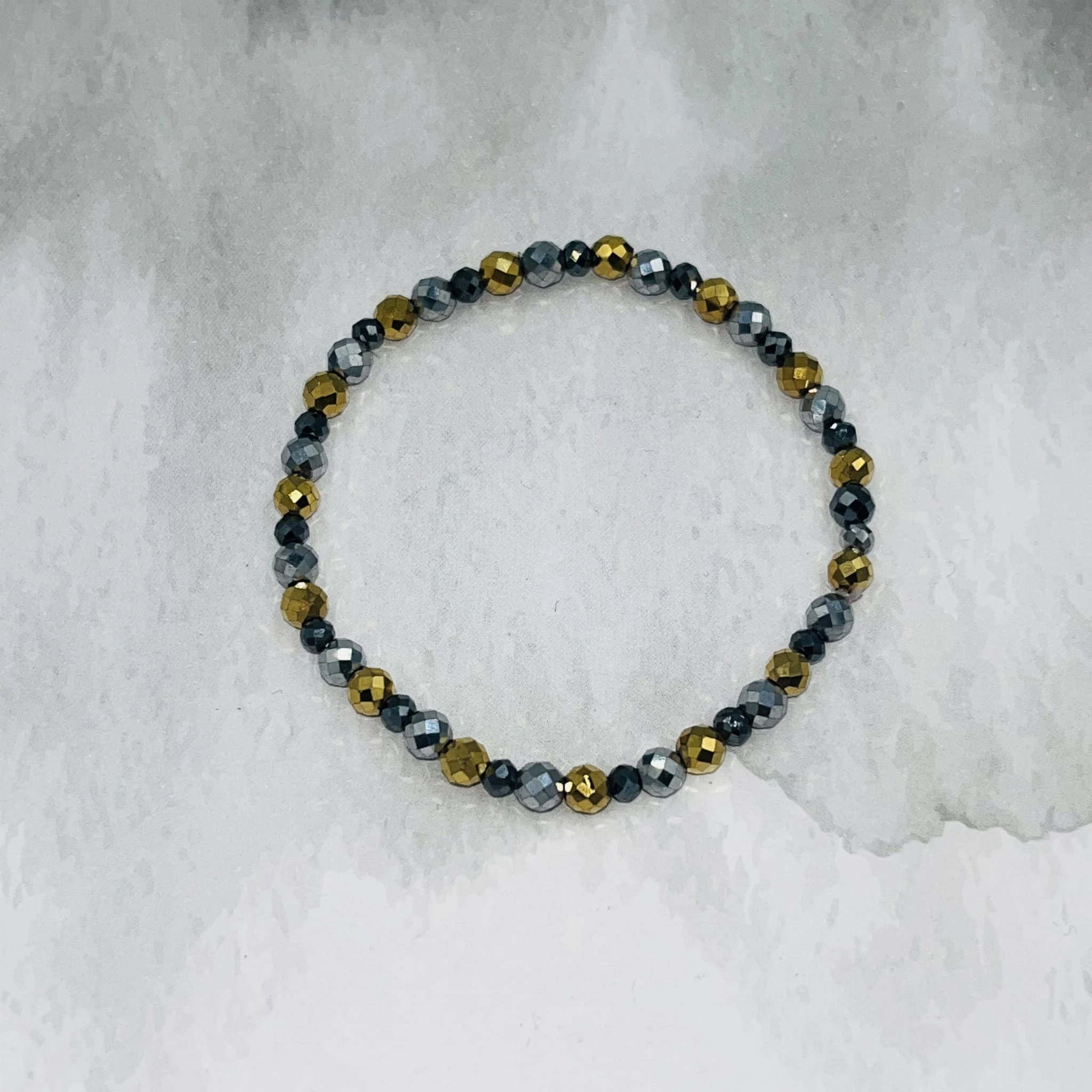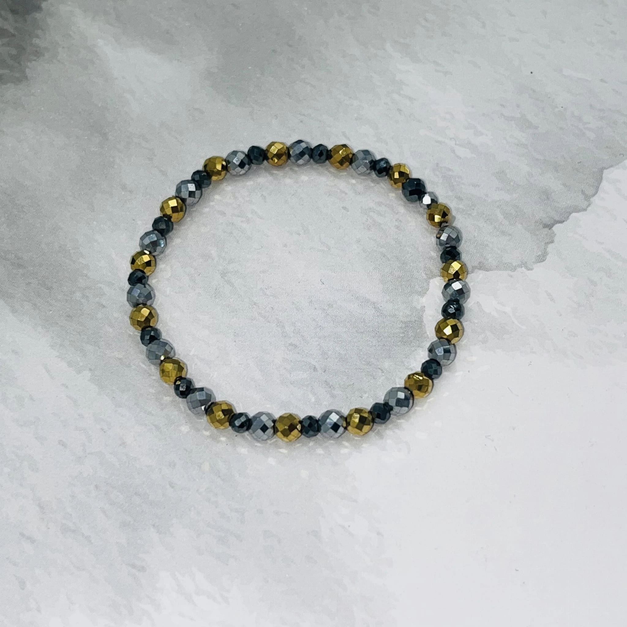 Bransoletka wykonana z fasetowanego hematytu w trzech kolorach: złotym, srebrnym oraz grafitowym tworzy harmonijną i nowoczesną kompozycję. Kamienie o średnicy 4 mm w odcieniu złotym i srebrnym stanowią główny element biżuterii, natomiast grafitowy hematyt o wielkości 3 mm dodaje subtelnego kontrastu i głębi.