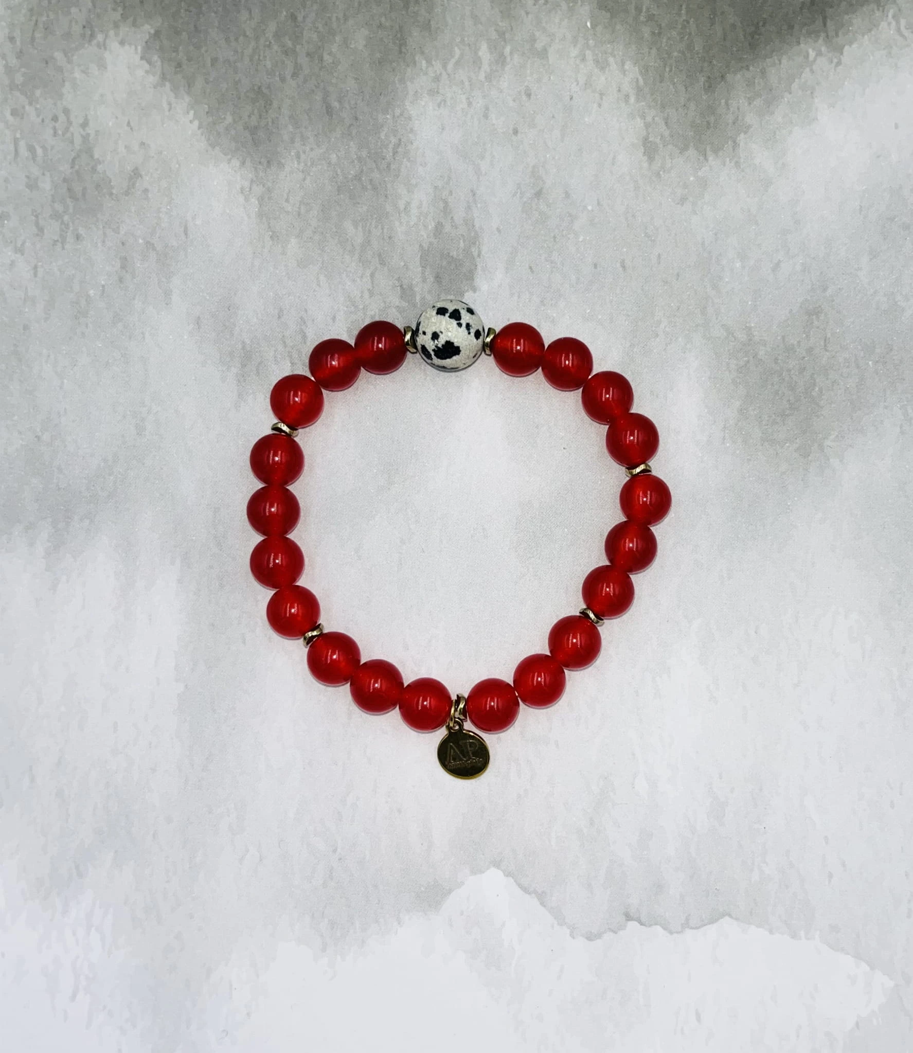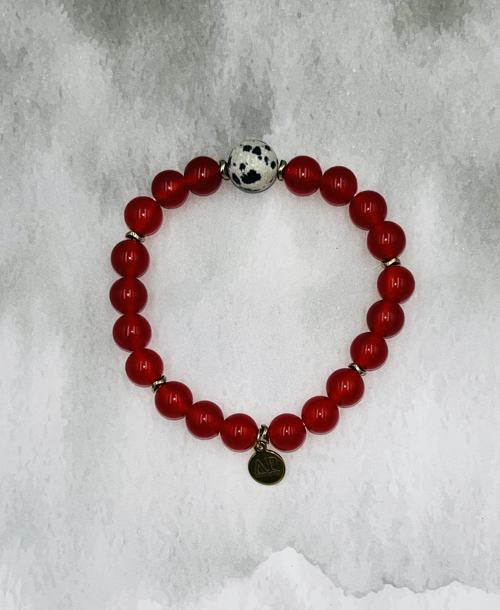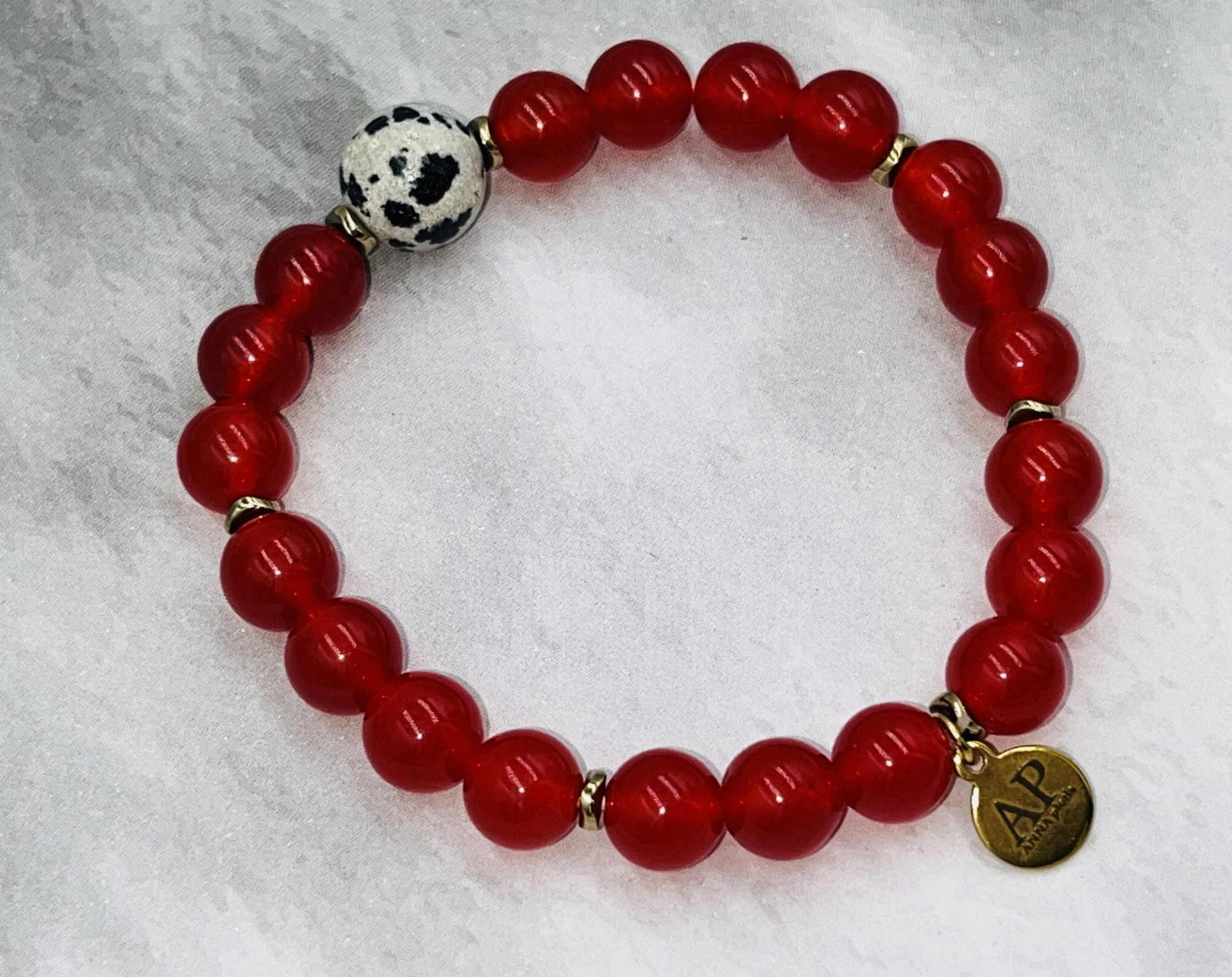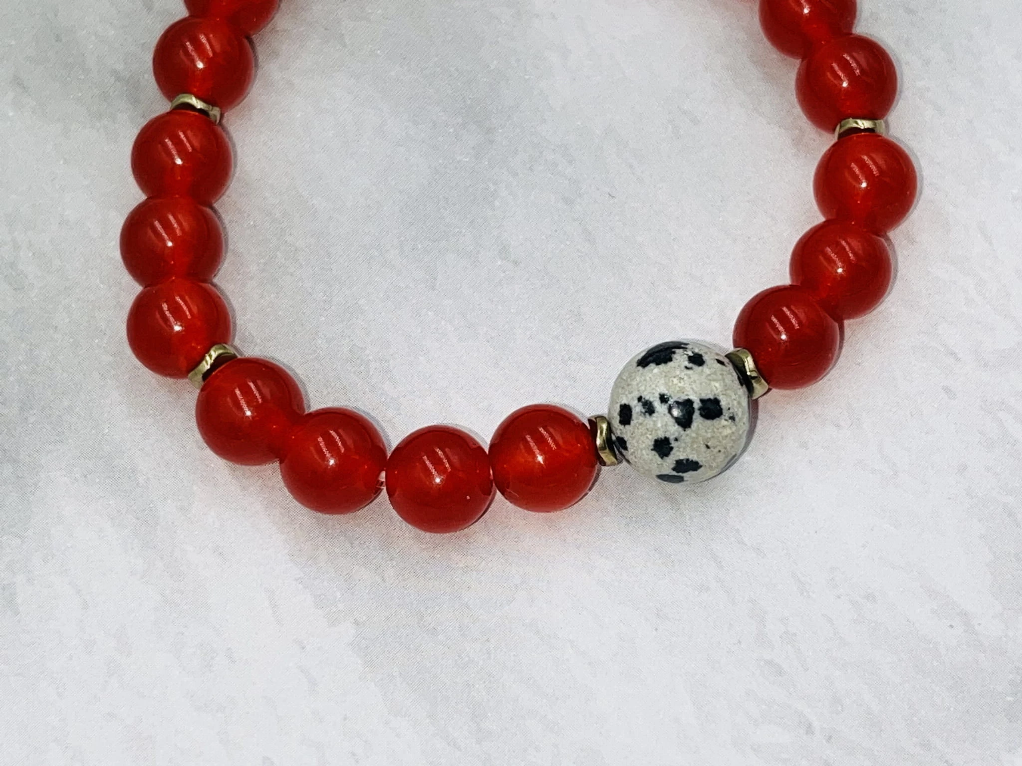 Ręcznie wykonana bransoletka damska na elastycznej gumce z gładkiego czerwonego agatu 6 mm, jaspisu dalmatyńskiego 10 mm oraz złotego hematytu. Intensywna czerwień połączona z wyrazistym, nakrapianym kamieniem tworzy elegancką i dynamiczną kompozycję.