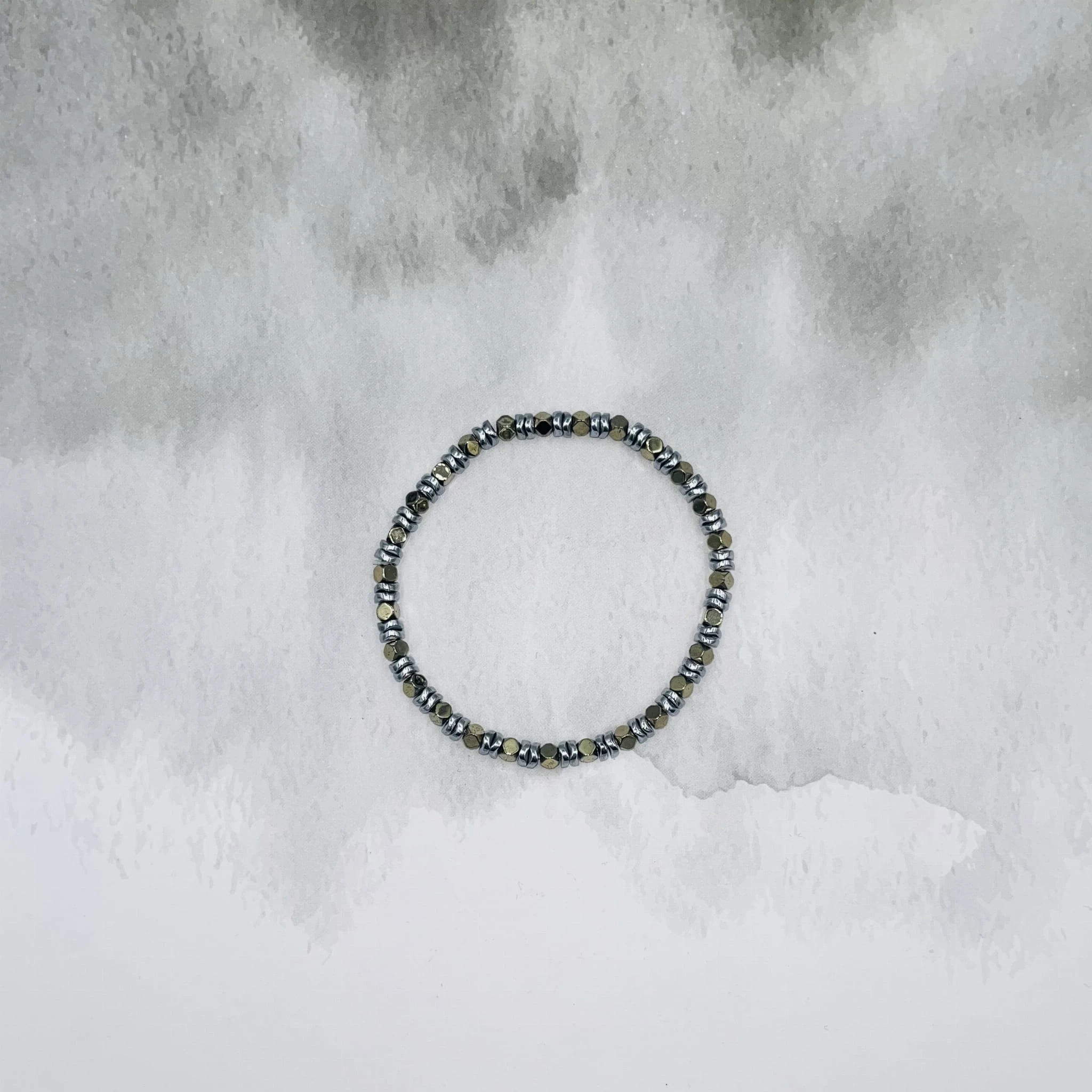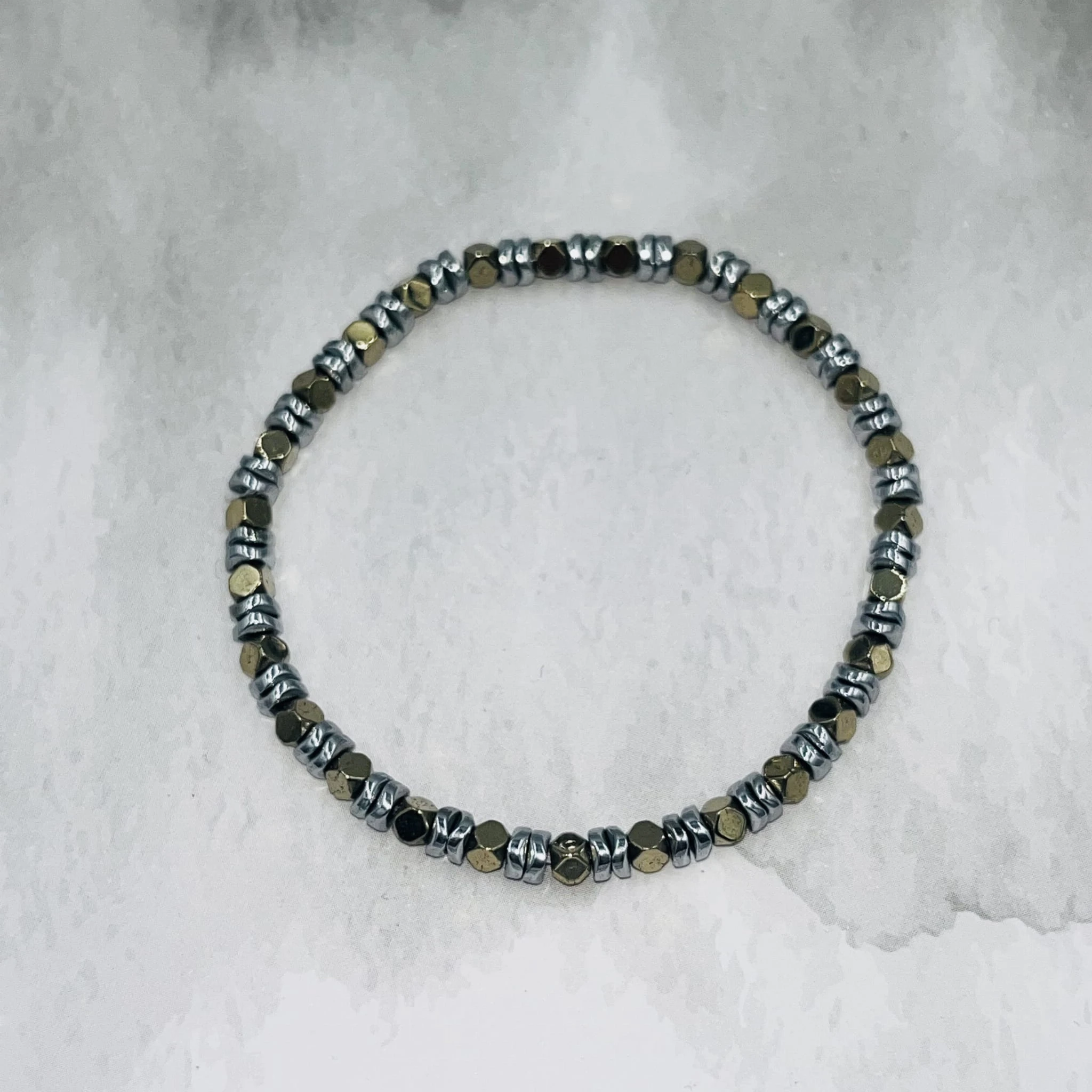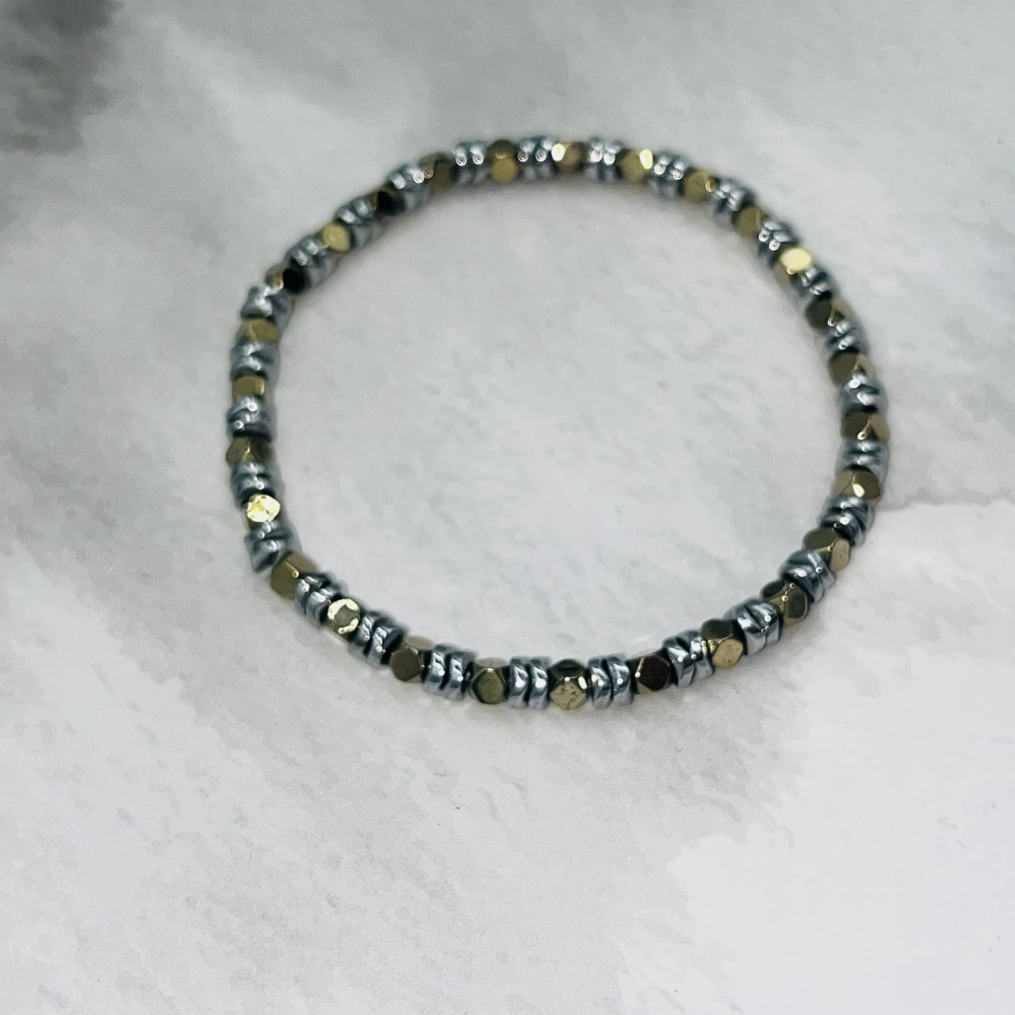 Ręcznie wykonana bransoletka damska na elastycznej gumce z hematytu w dwóch odcieniach: srebrnym w formie płaskich dysków oraz złotym w formie kostek. Połączenie geometrycznych kształtów i metalicznego połysku tworzy nowoczesną, elegancką kompozycję.