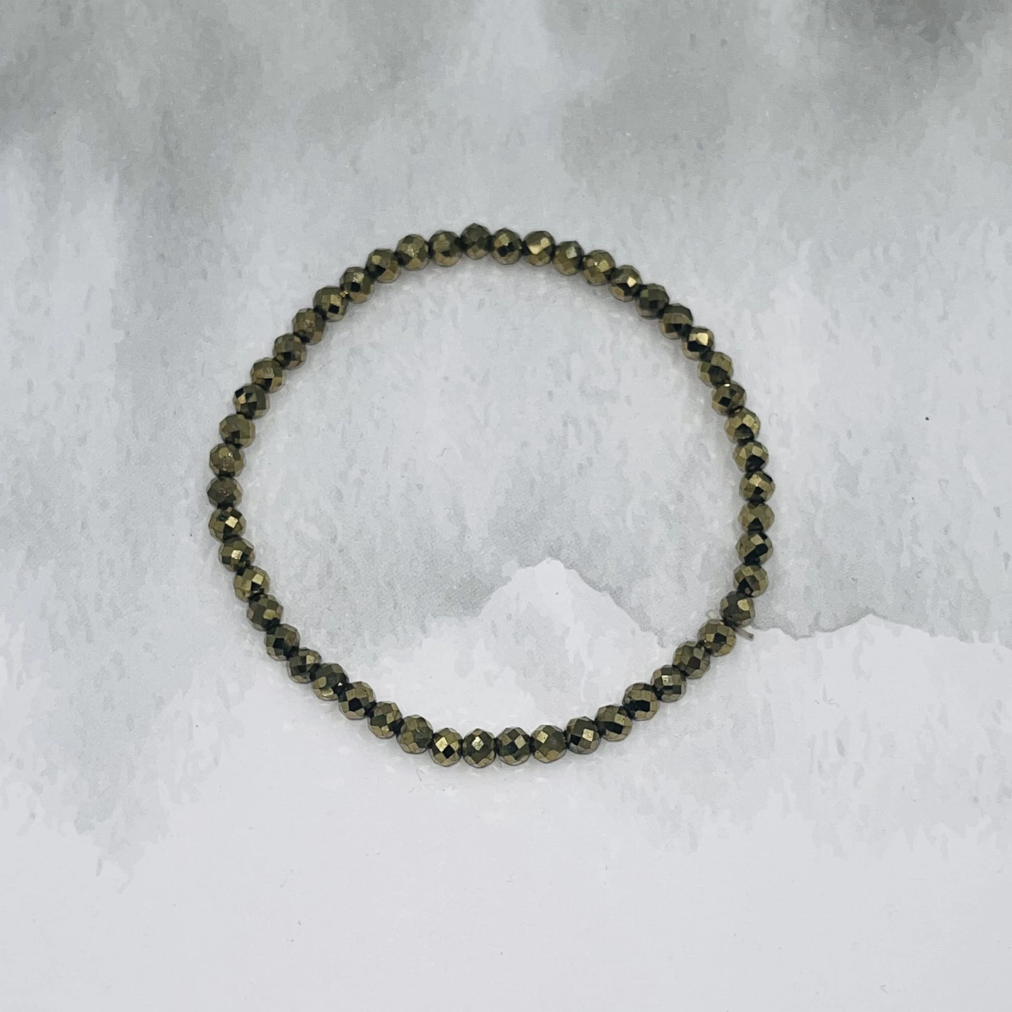 Bransoletka wykonana z fasetowanego hematytu w złotym odcieniu o średnicy 4 mm wyróżnia się delikatną i elegancką formą. Szlifowane powierzchnie kamieni subtelnie odbijają światło, nadając biżuterii lekki, metaliczny połysk.