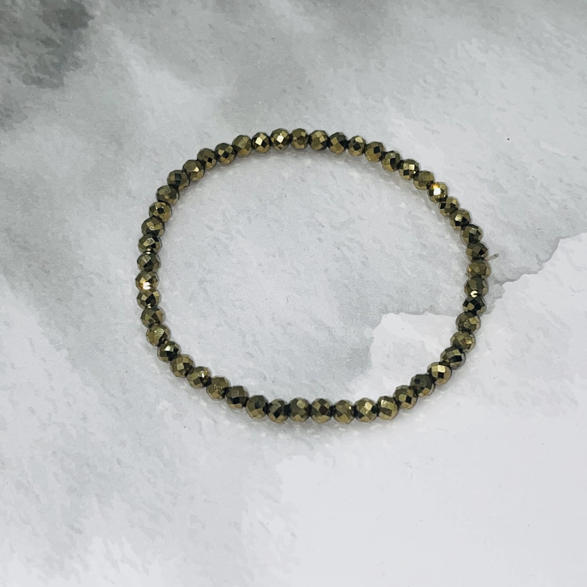 Ręcznie wykonana bransoletka damska na elastycznej gumce z fasetowanego hematytu w złotym odcieniu o średnicy 4 mm. Subtelny połysk i drobna forma kamieni tworzą elegancki, minimalistyczny dodatek.