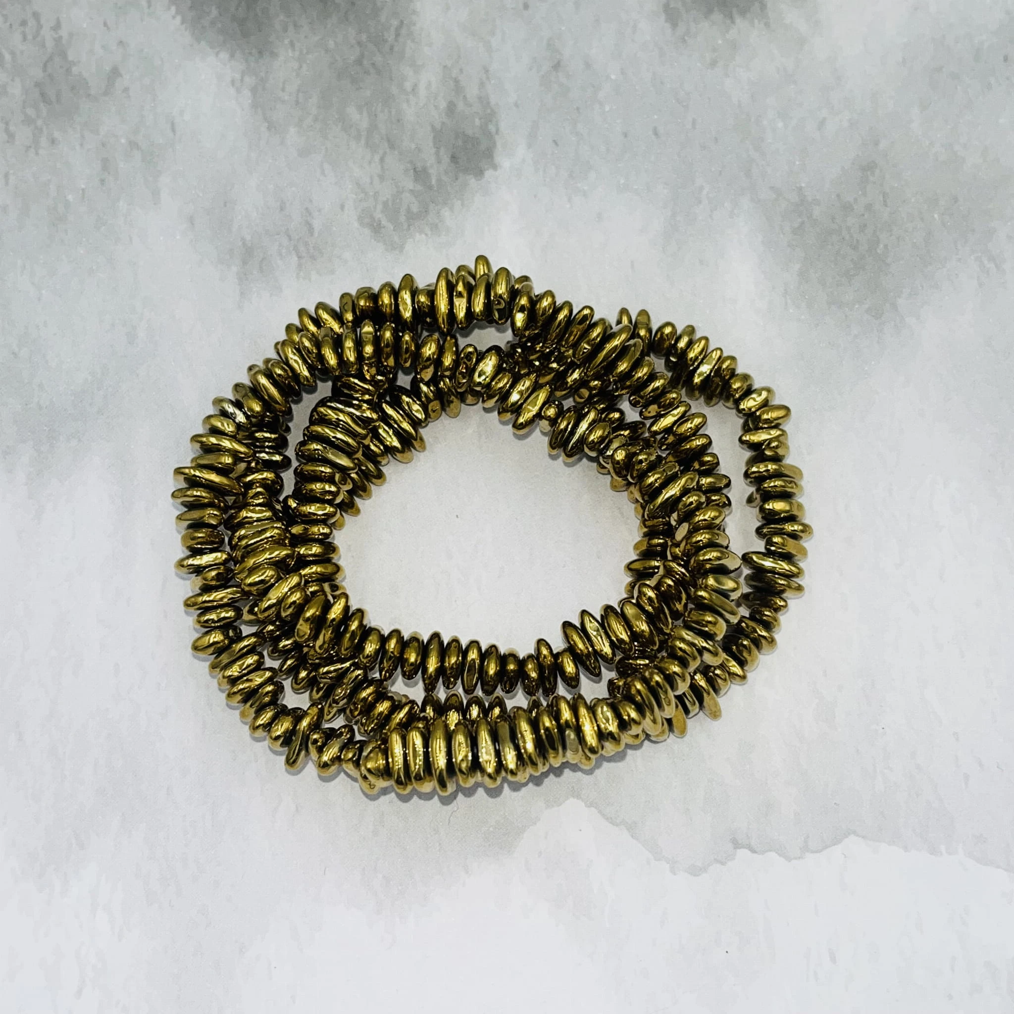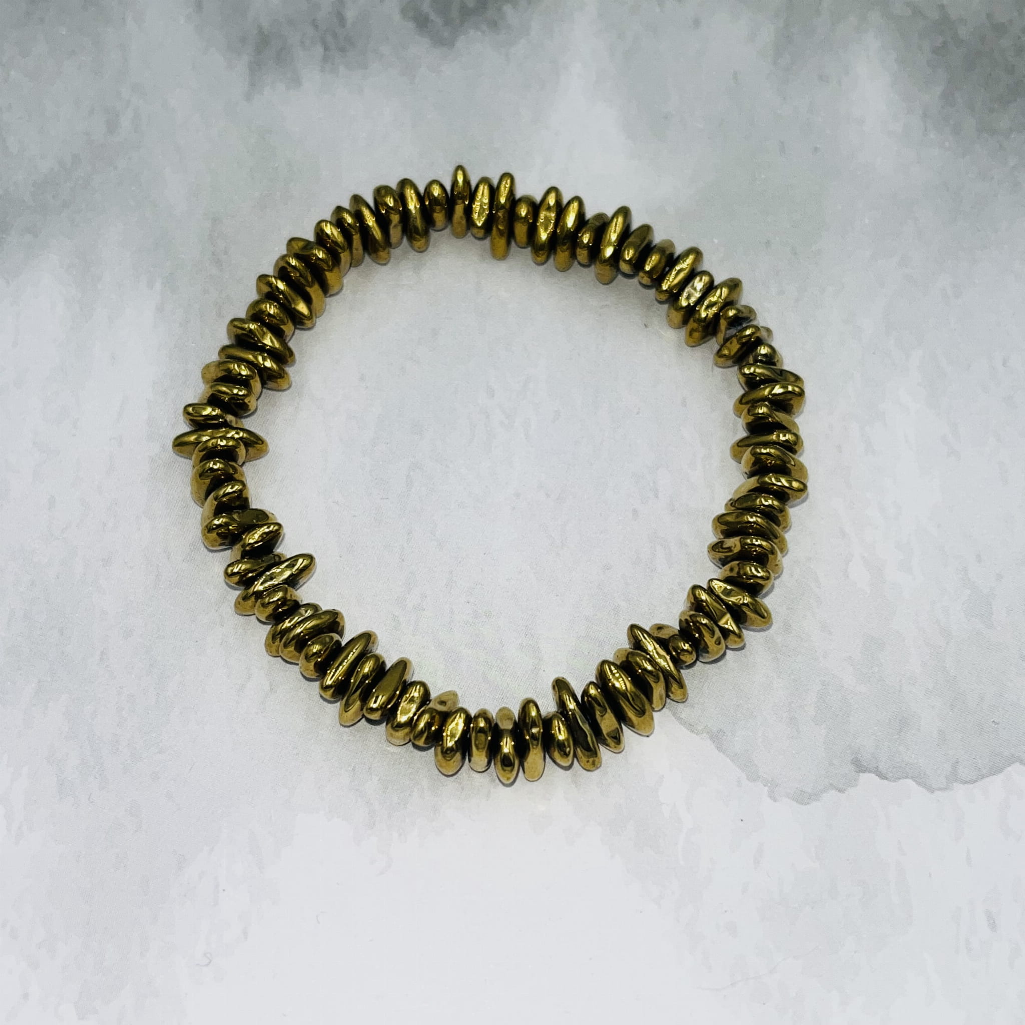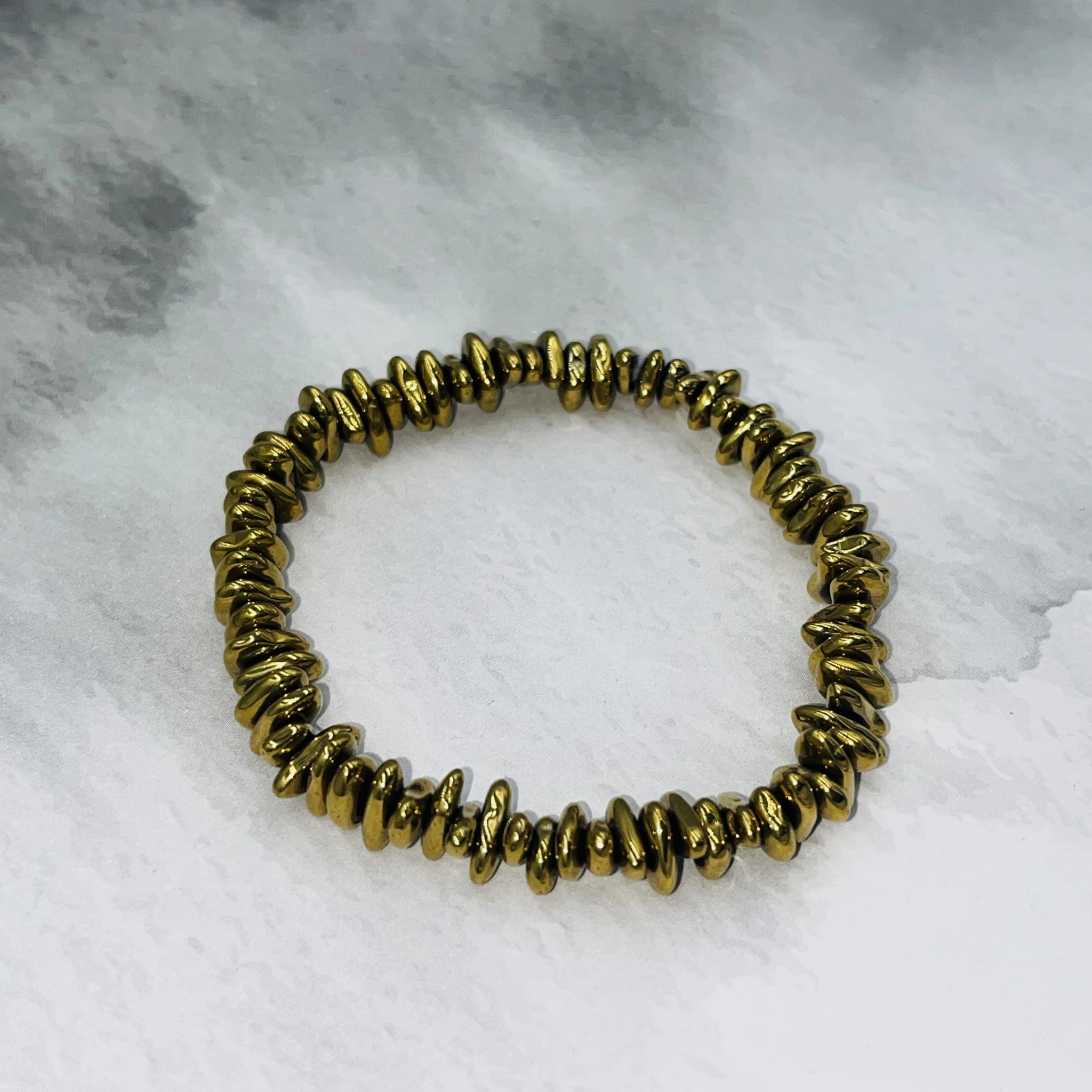 Ręcznie wykonana bransoletka damska na elastycznej gumce z hematytu wzłotym odcieniu o nieregularnym kształcie przypominającym naturalne kamyczki. Metaliczny połysk i organiczna forma tworzą nowoczesny, elegancki akcent stylizacji.