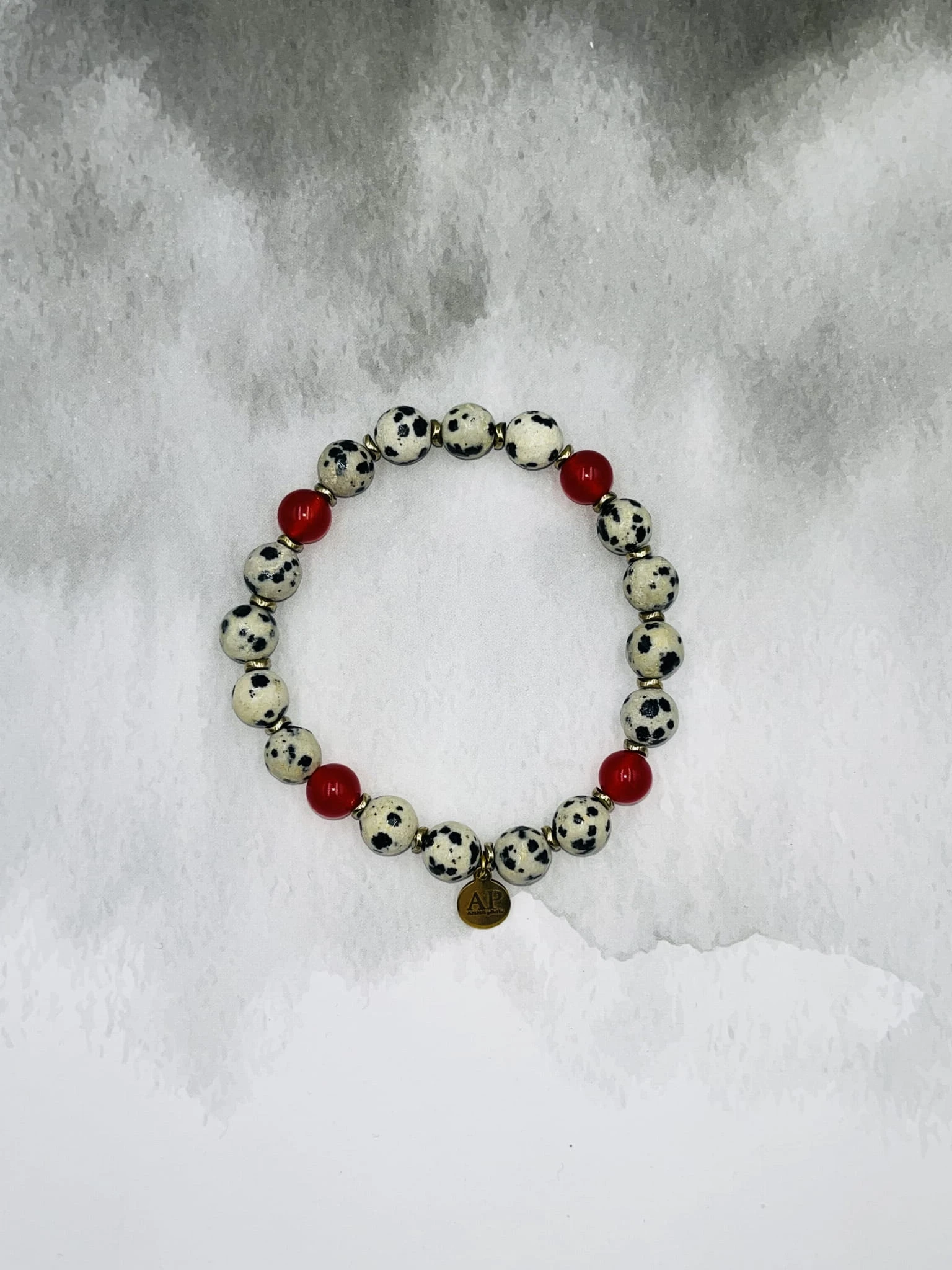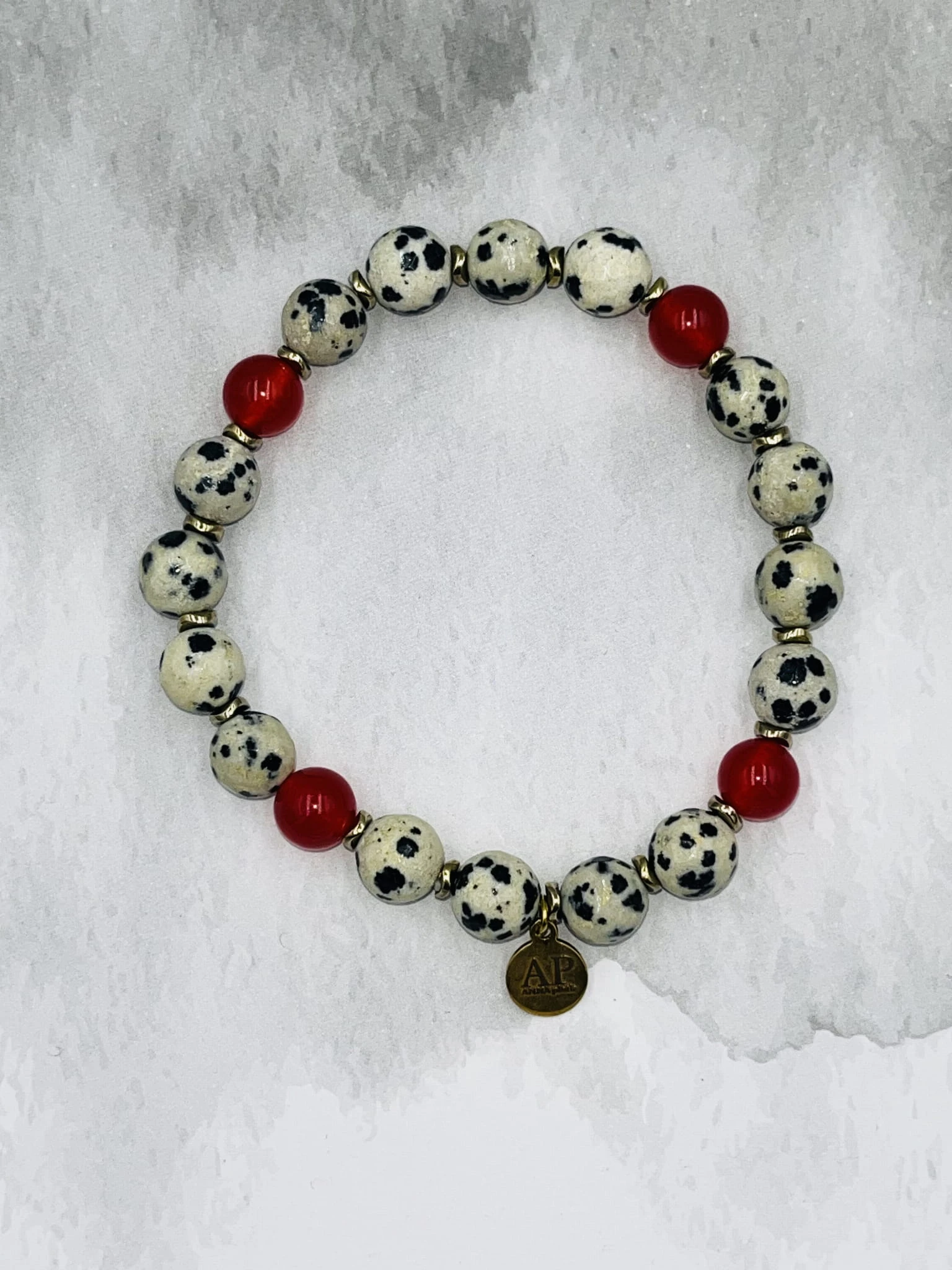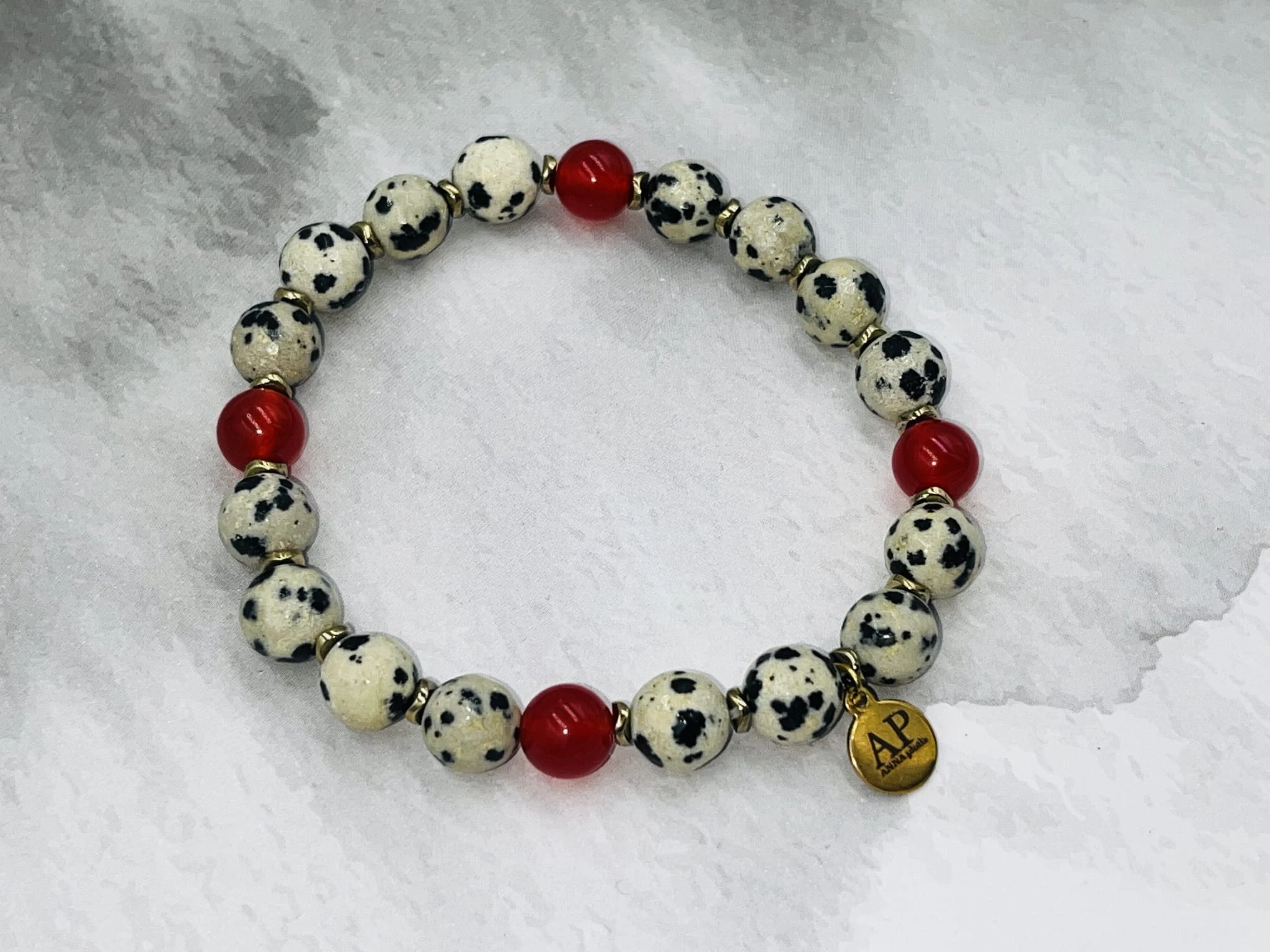 Ręcznie wykonana bransoletka damska na elastycznej gumce z fasetowanego jaspisu dalmatyńskiego 8 mm, gładkiego czerwonego agatu 6 mm oraz złotego hematytu. Kontrast jasnego, nakrapianego kamienia z głęboką czerwienią tworzy elegancką i wyrazistą kompozycję.