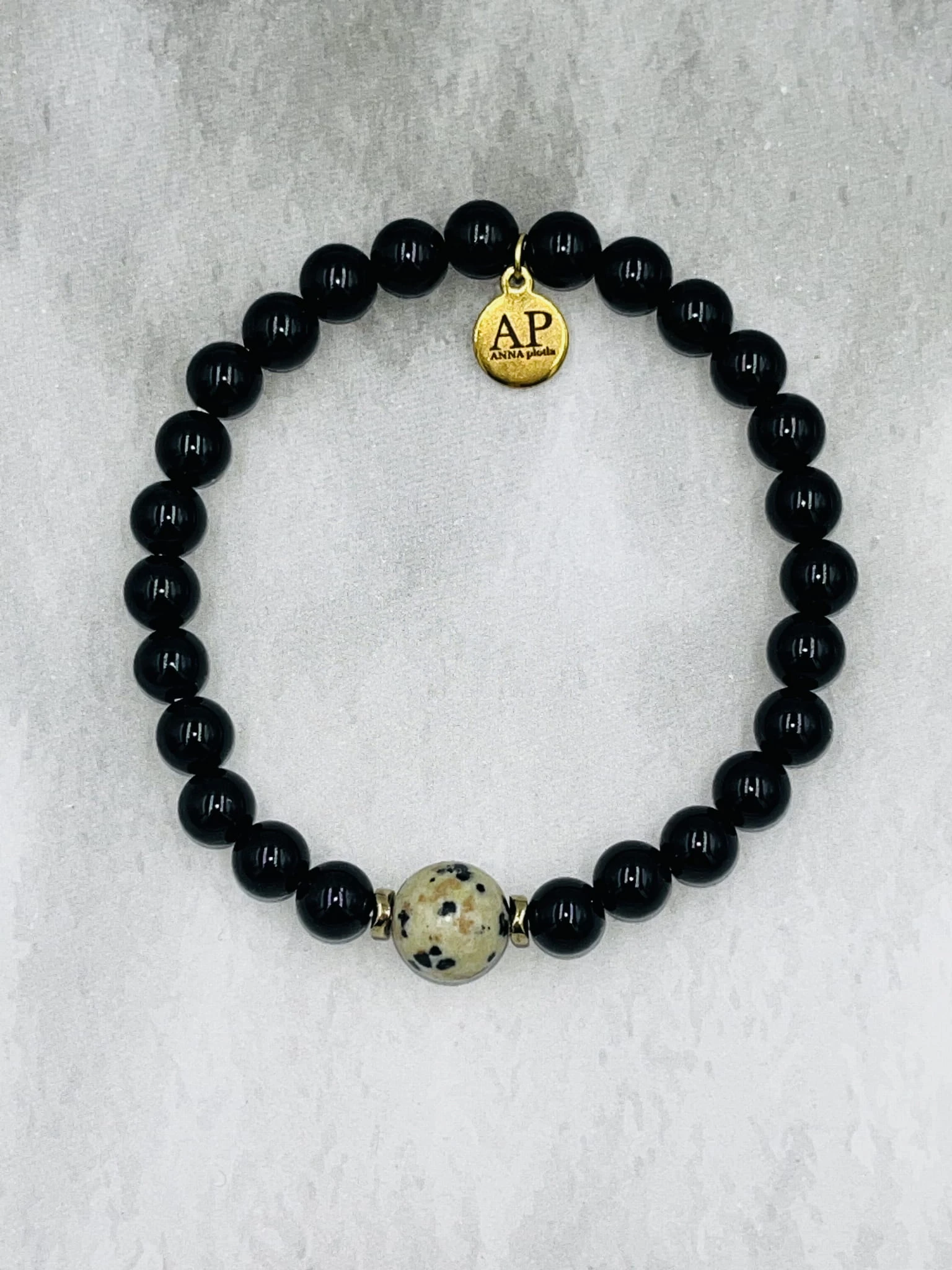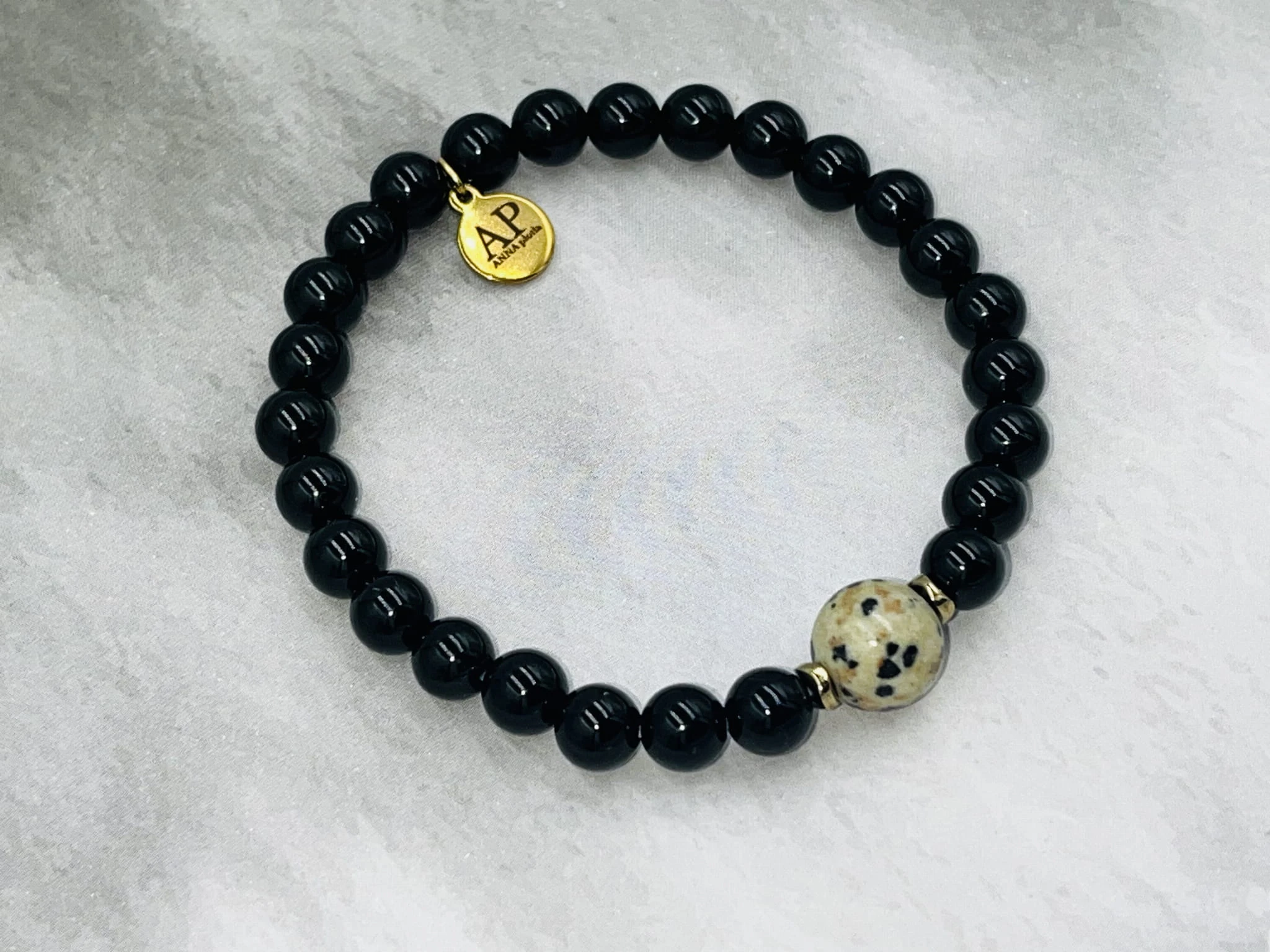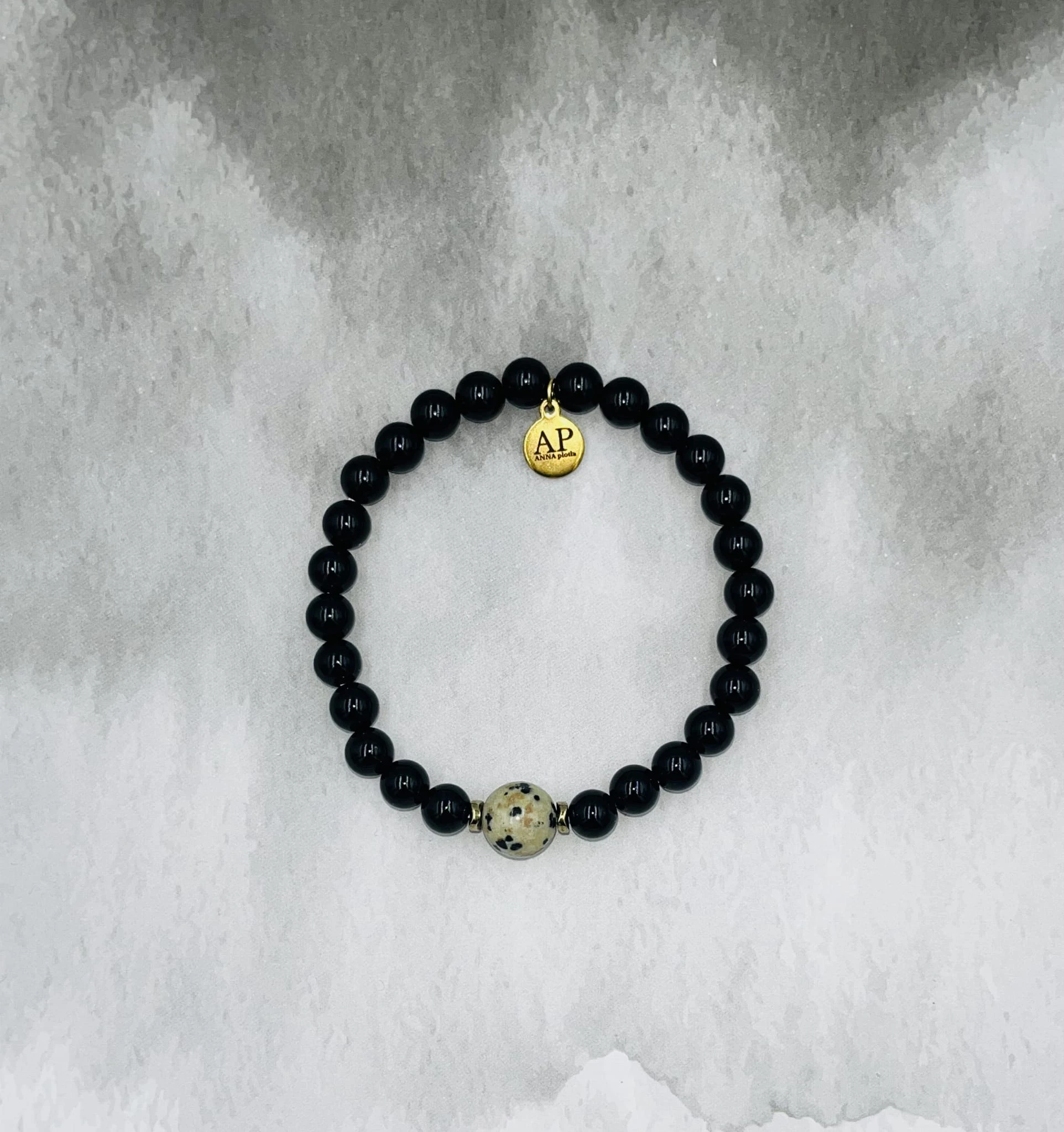 Centralnym akcentem kompozycji jest pojedynczy jaspis dalmatyński 8 mm, którego jasna barwa z charakterystycznymi ciemnymi plamkami przyciąga uwagę i wprowadza nowoczesny kontrast. Złoty hematyt dopełnia całość metalicznym, eleganckim detalem. Bransoletka nawleczona jest na elastyczną gumkę, dzięki czemu jest wygodna w codziennym noszeniu.