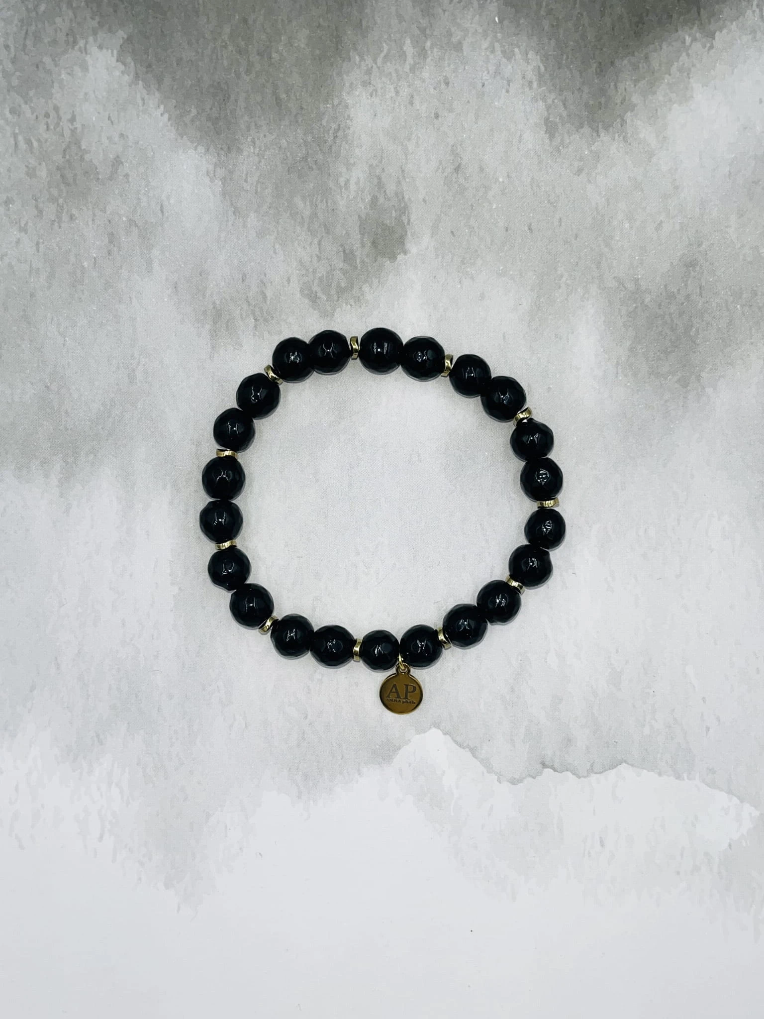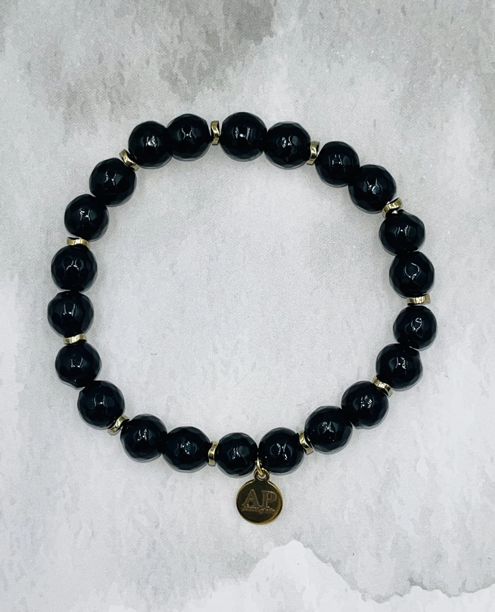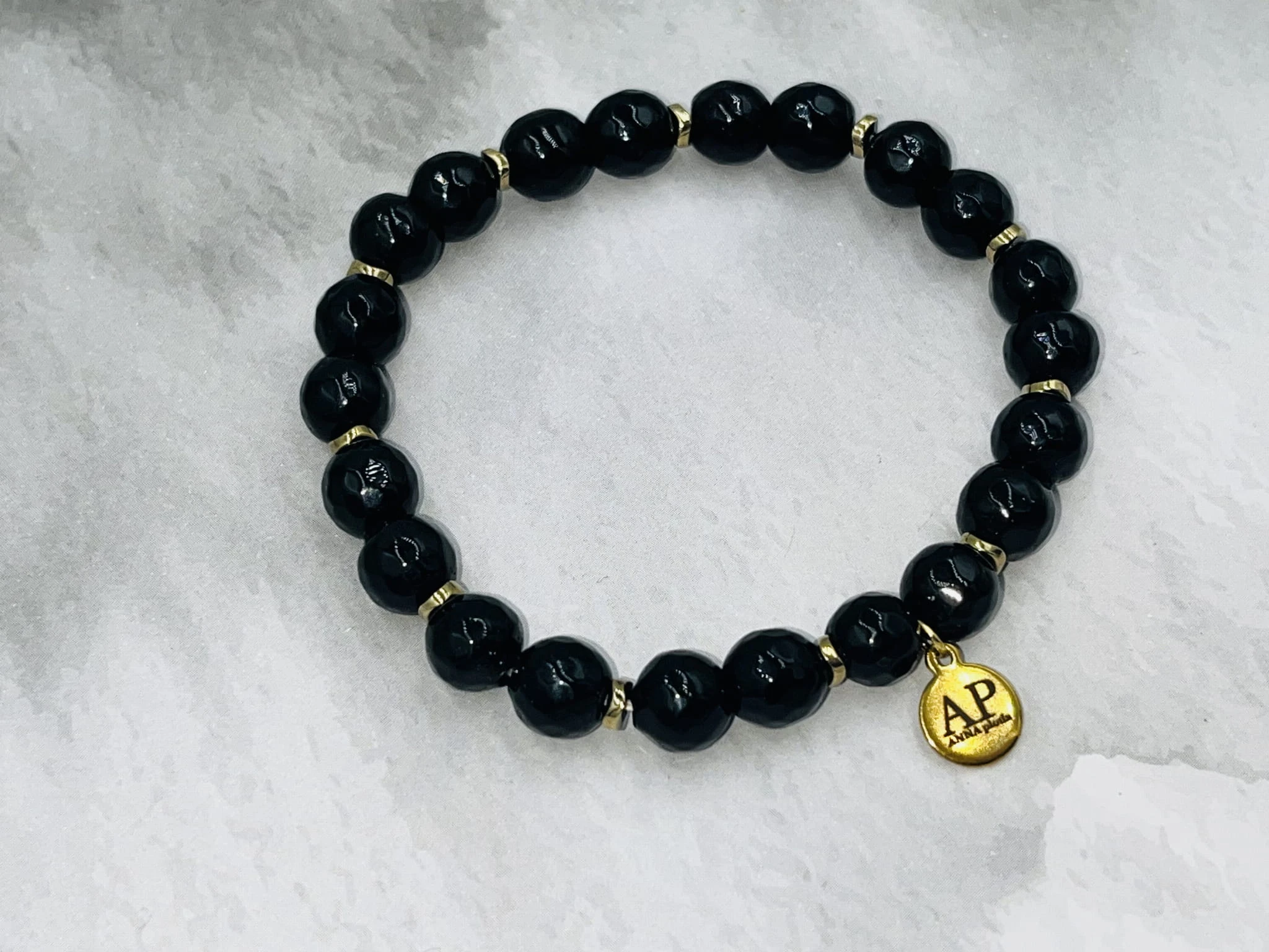 Ręcznie wykonana bransoletka damska na elastycznej gumce z onyksu 8 mm i złotego hematytu. Klasyczna czerń połączona ze złotym akcentem tworzy elegancką, ponadczasową kompozycję. Subtelny dodatek do stylizacji codziennych i wieczorowych.