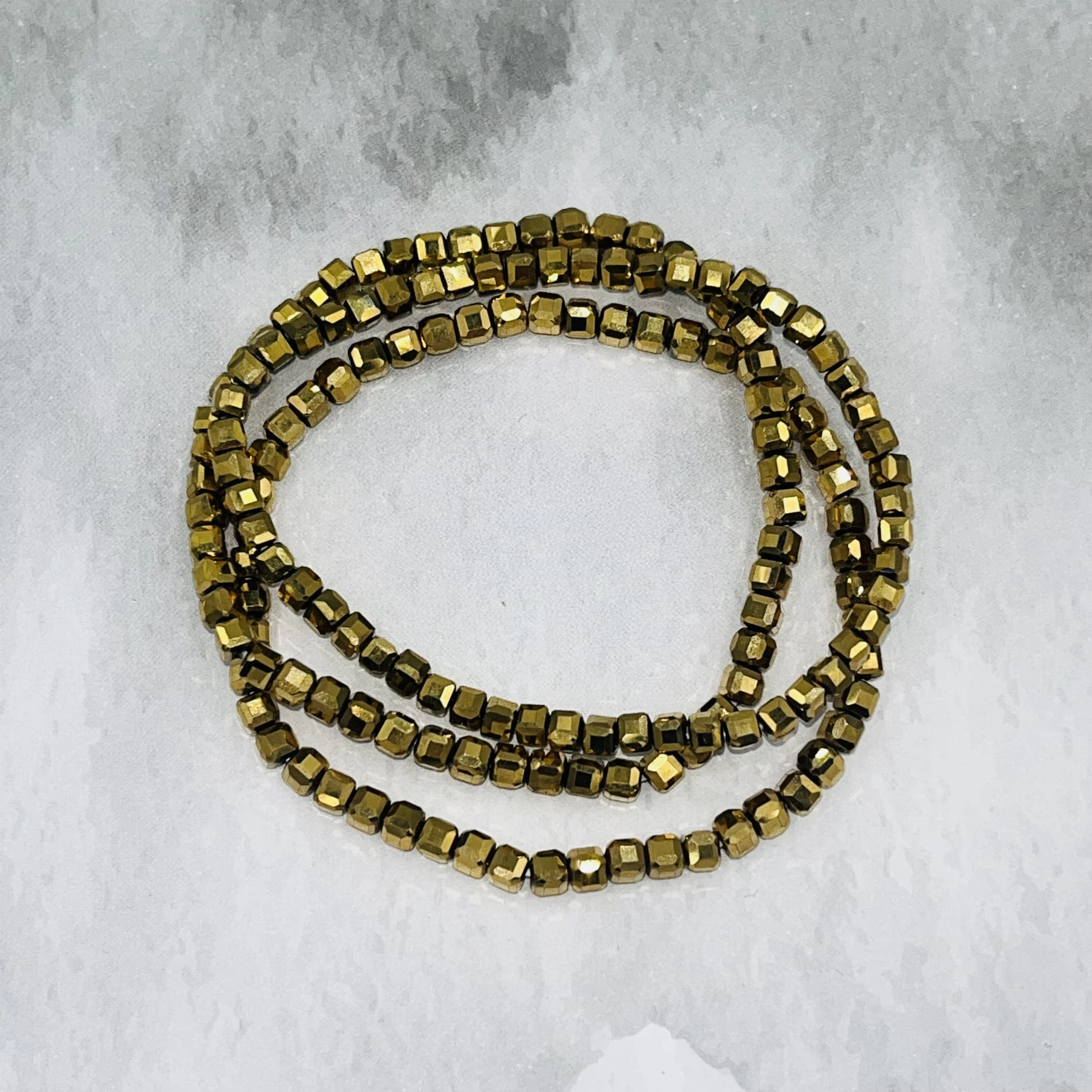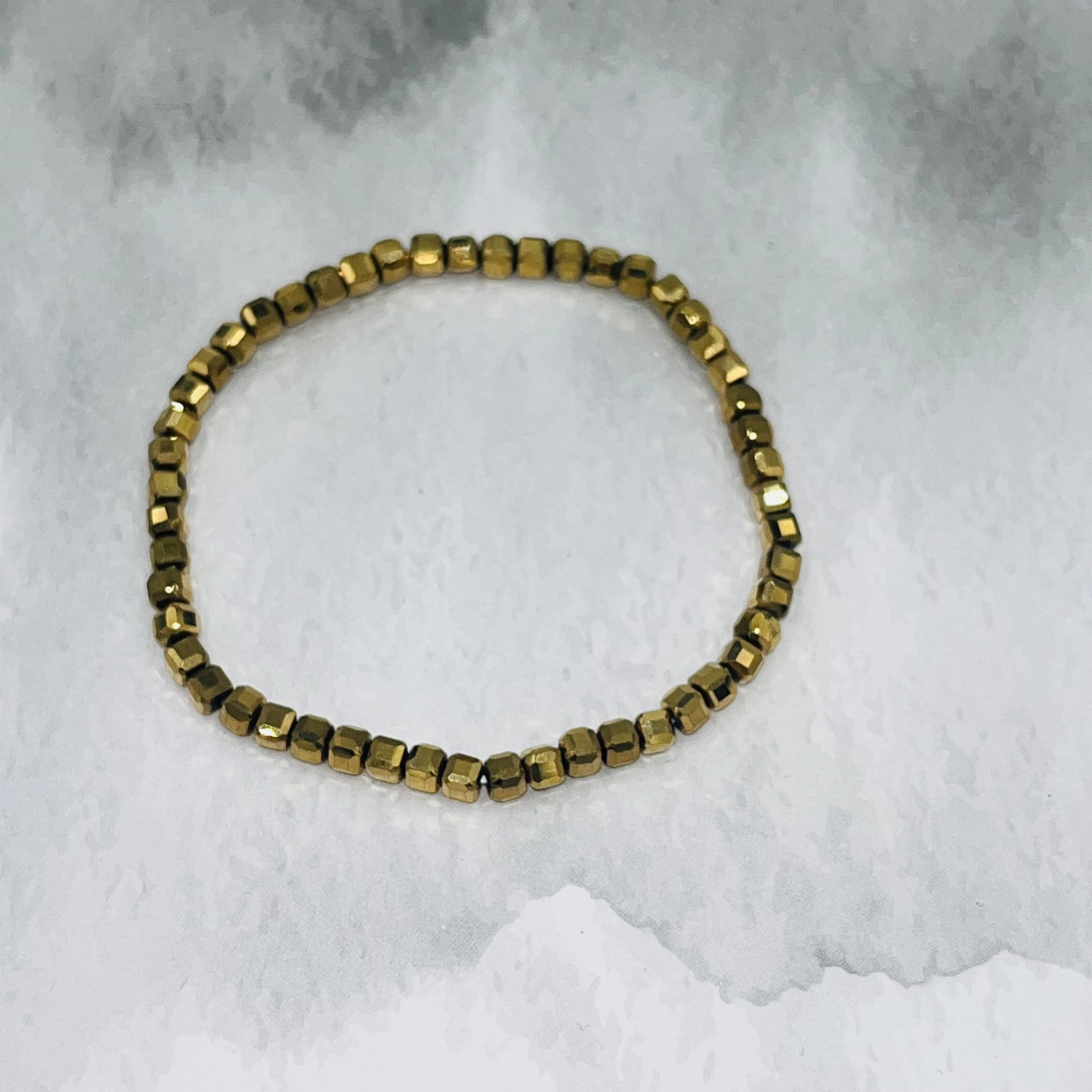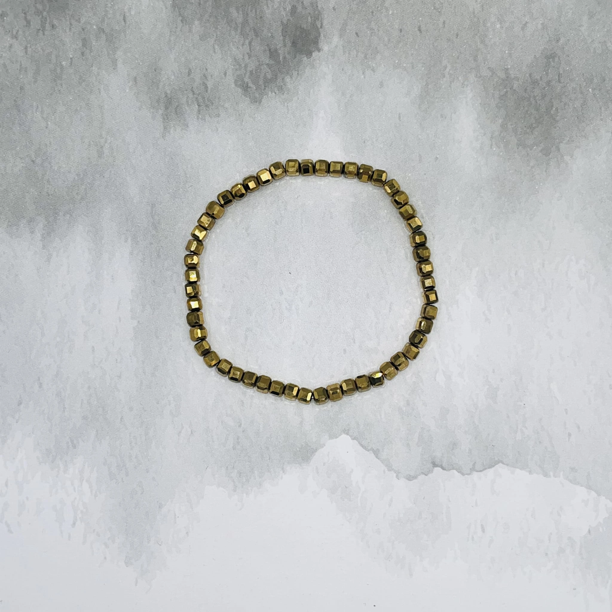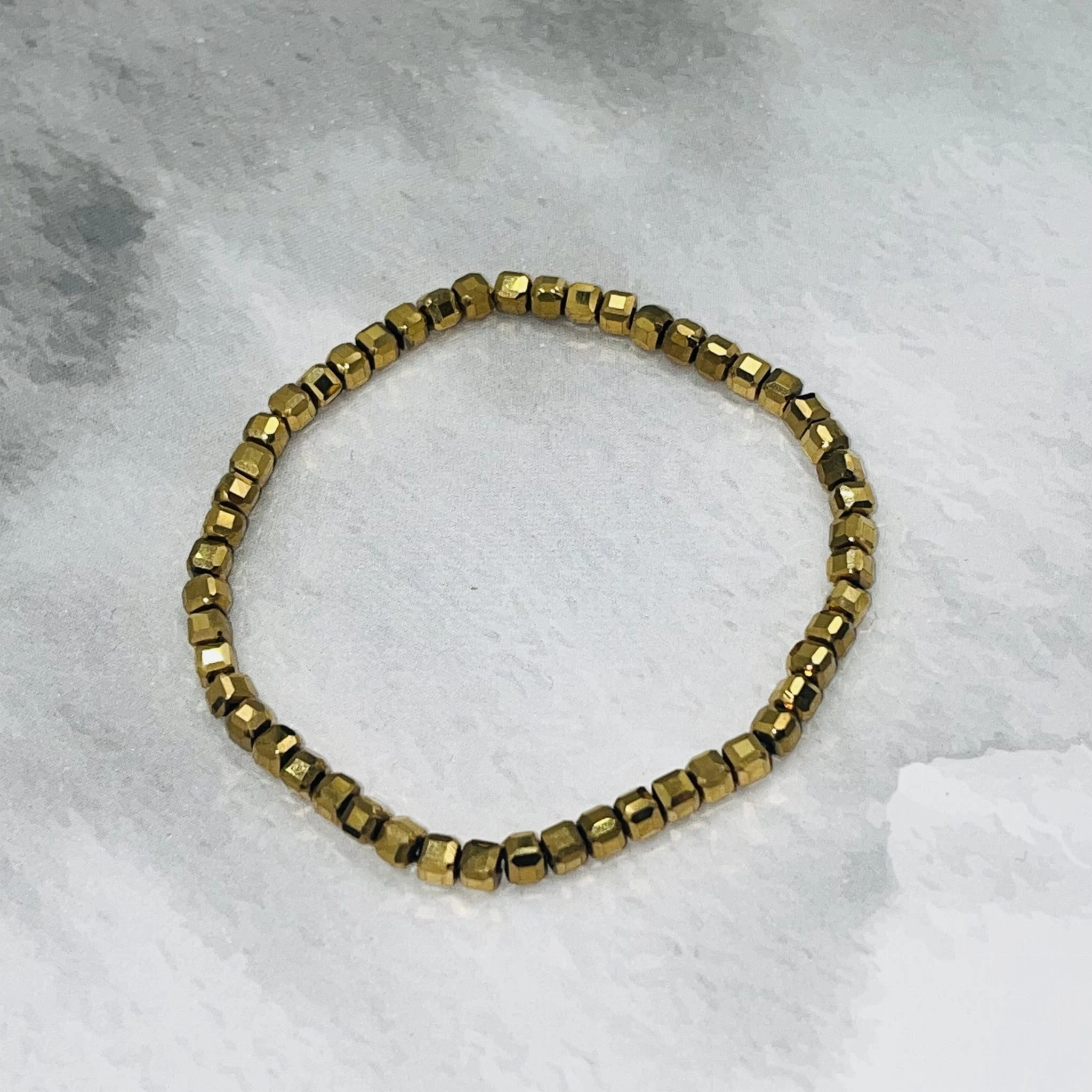Ręcznie wykonana bransoletka damska na elastycznej gumce z hematytu w złotym odcieniu w formie fasetowanych kostek 3×3 mm. Subtelny połysk i drobna, geometryczna forma tworzą elegancki i minimalistyczny dodatek.