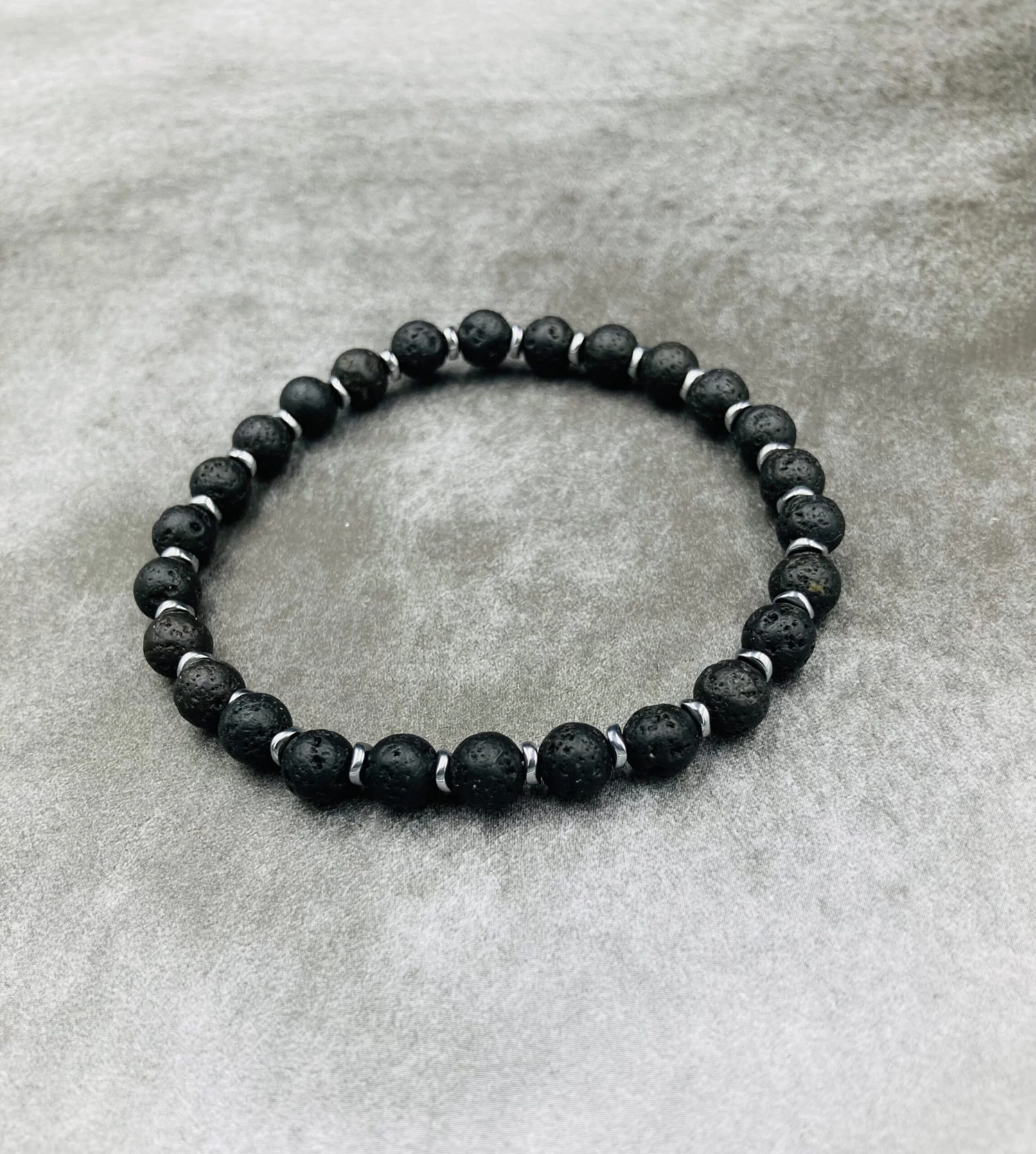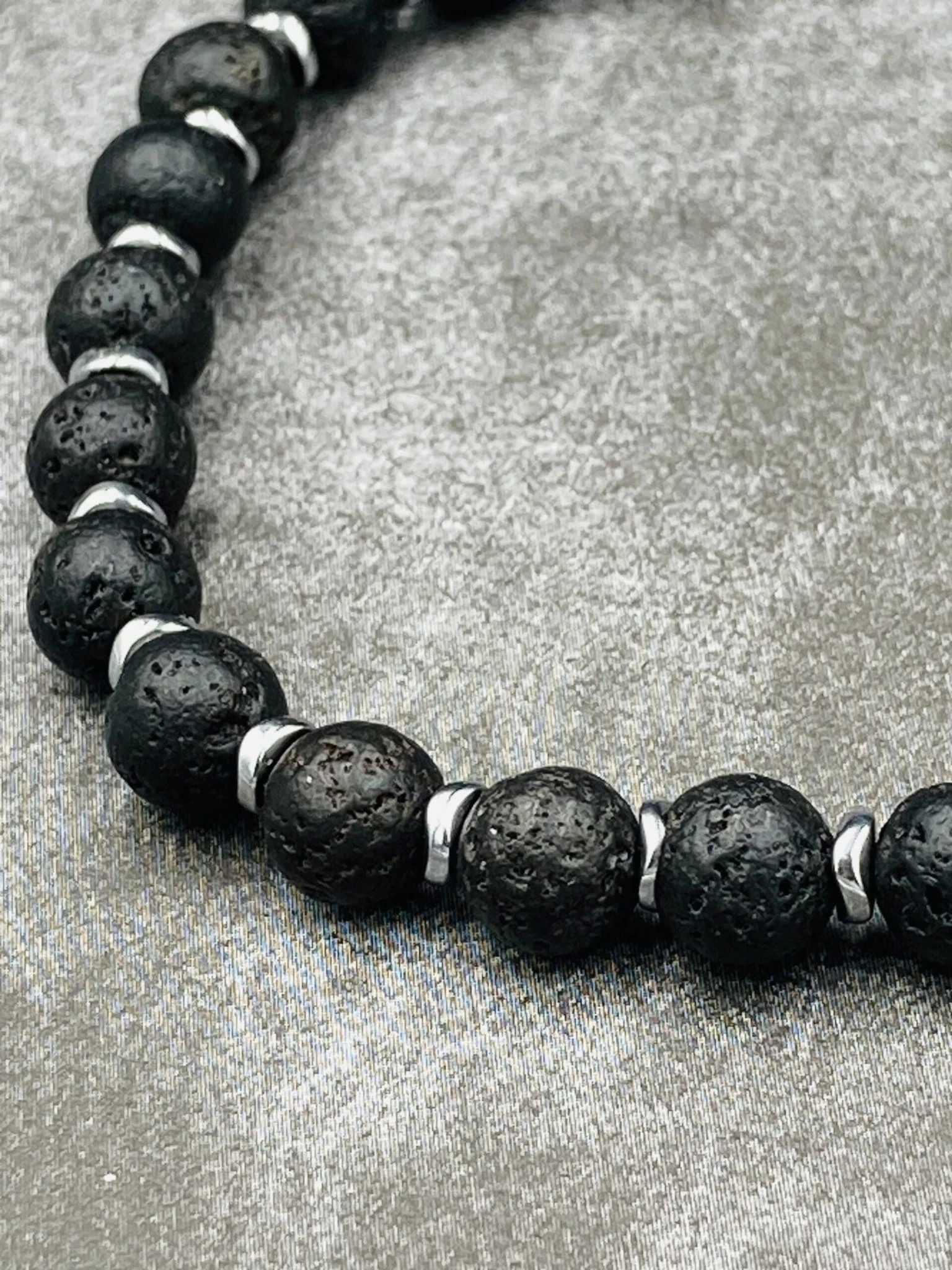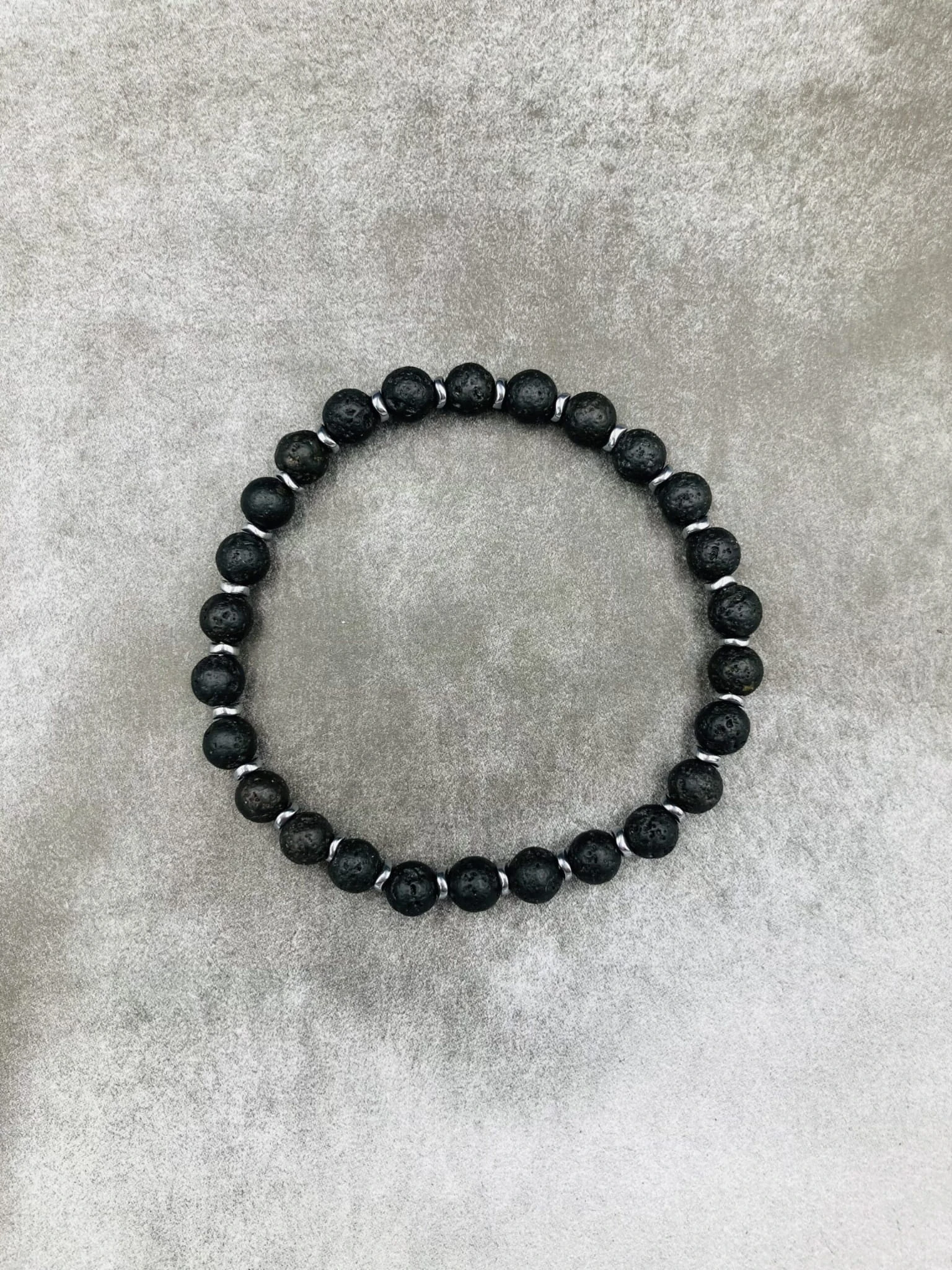 Ręcznie wykonana bransoletka męska na elastycznej gumce z lawy wulkanicznej i hematytu. Surowa, minimalistyczna forma inspirowana naturalną strukturą kamieni, idealna do codziennego noszenia.