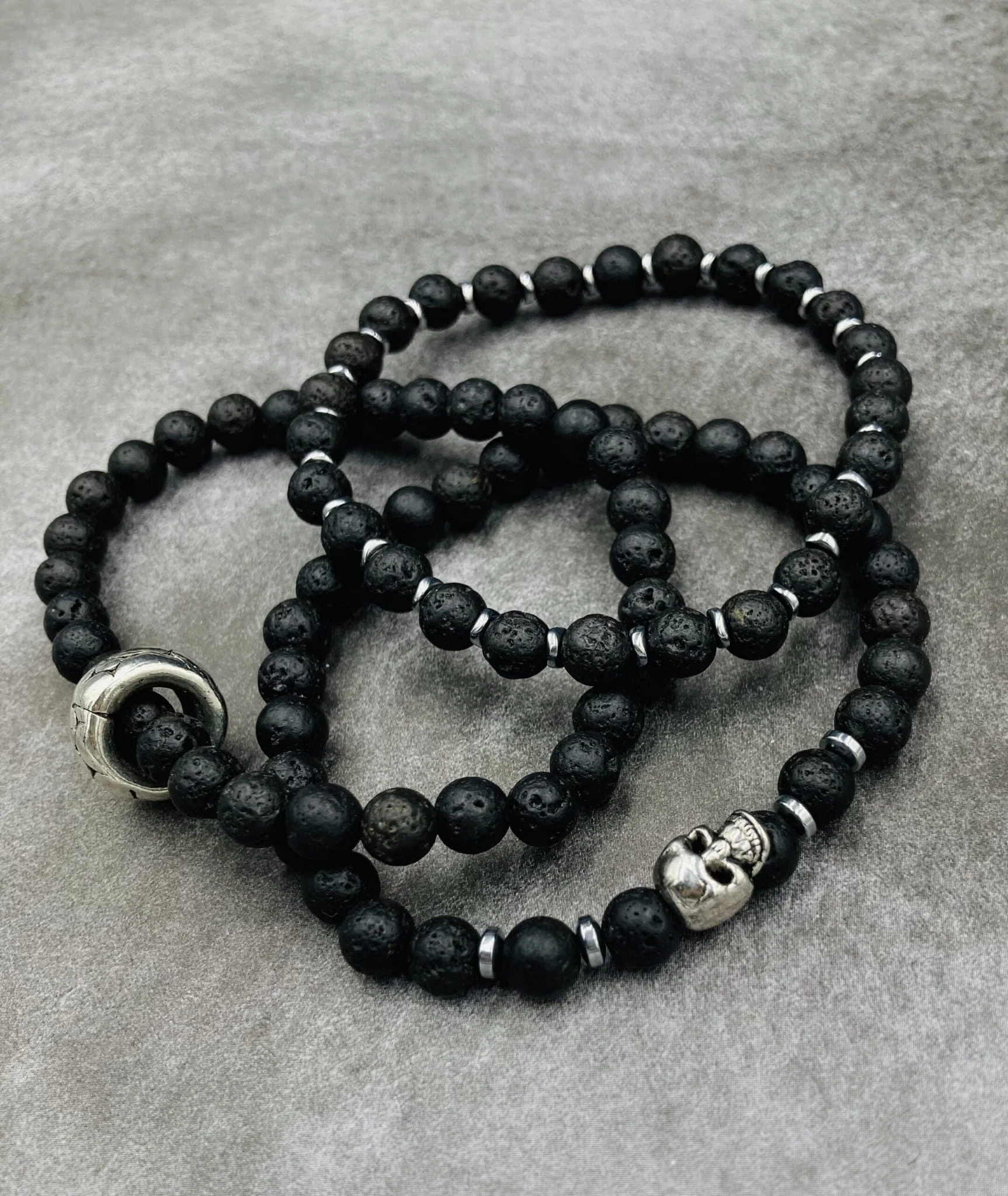 Bransoletka męska z lawy wulkanicznej i hematytu to klasyczne połączenie naturalnych kamieni o wyrazistym, surowym charakterze. Porowata struktura lawy wulkanicznej nadaje całości organiczny wygląd, natomiast hematyt wprowadza subtelny metaliczny akcent i wizualną równowagę.