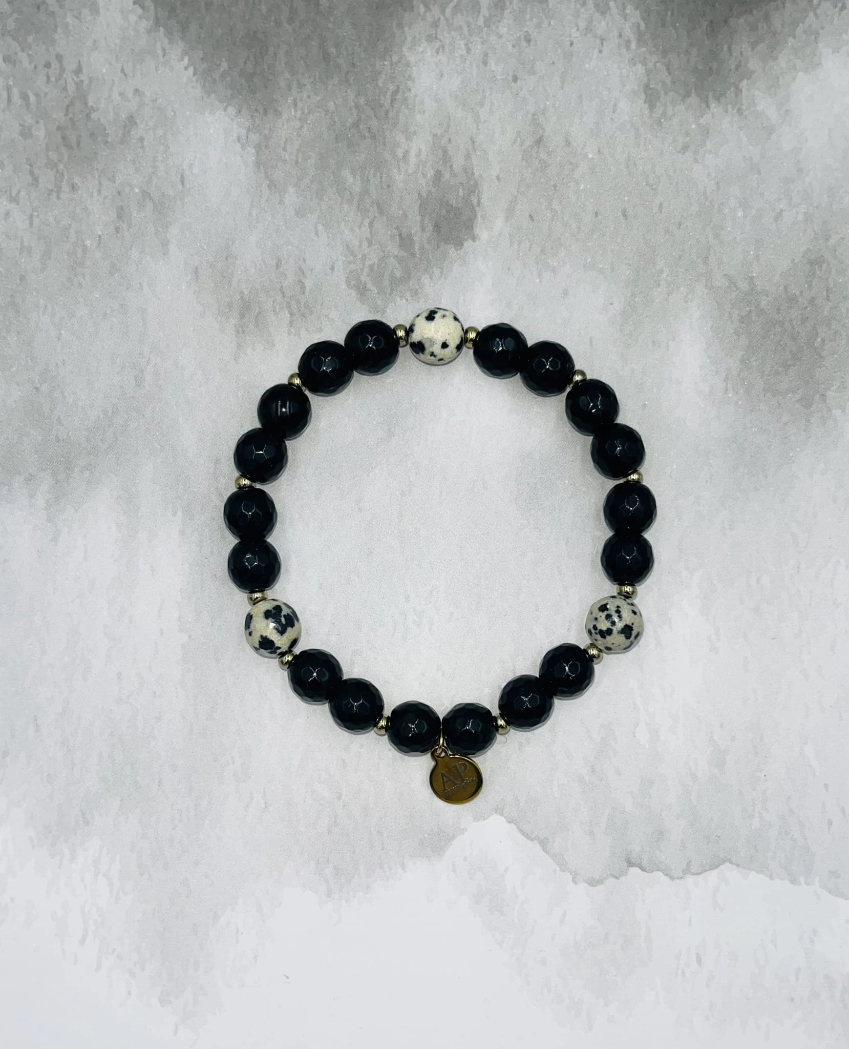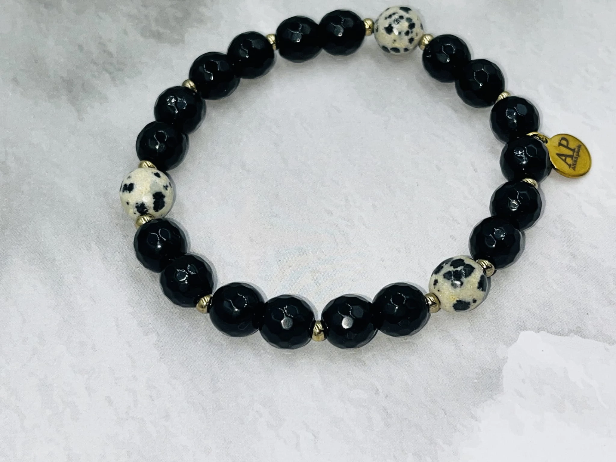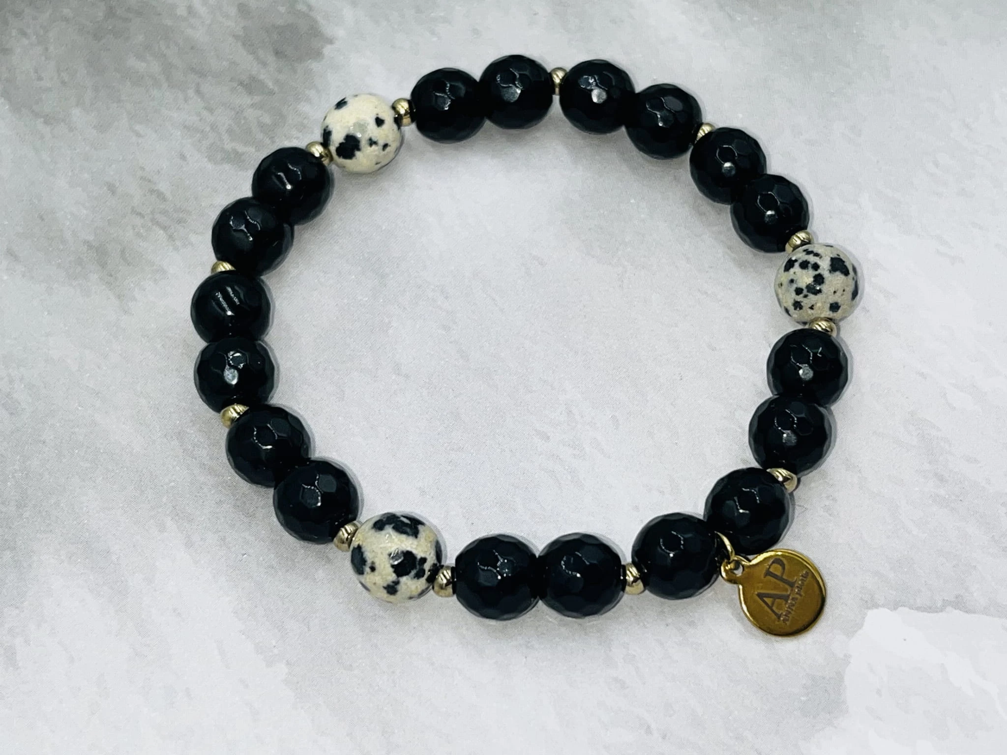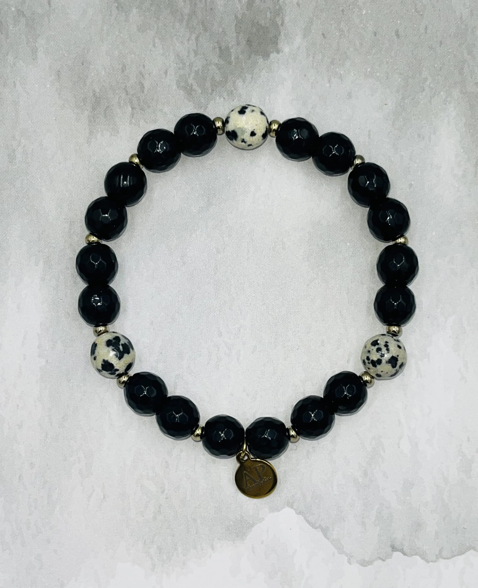Ręcznie wykonana bransoletka na elastycznej gumce z fasetowanego onyksu 8 mm, trzema kulkami jaspisu dalmatyńskiego 8 mm oraz złotym hematytem. Kontrast głębokiej czerni i jasnego, nakrapianego wzoru tworzy nowoczesną, elegancką kompozycję.
