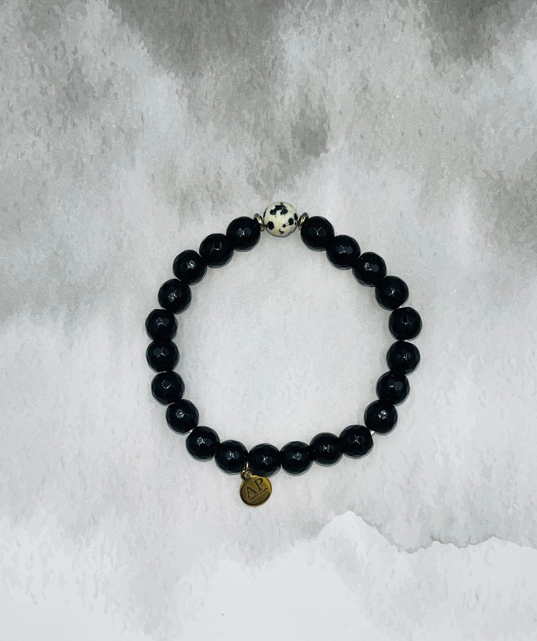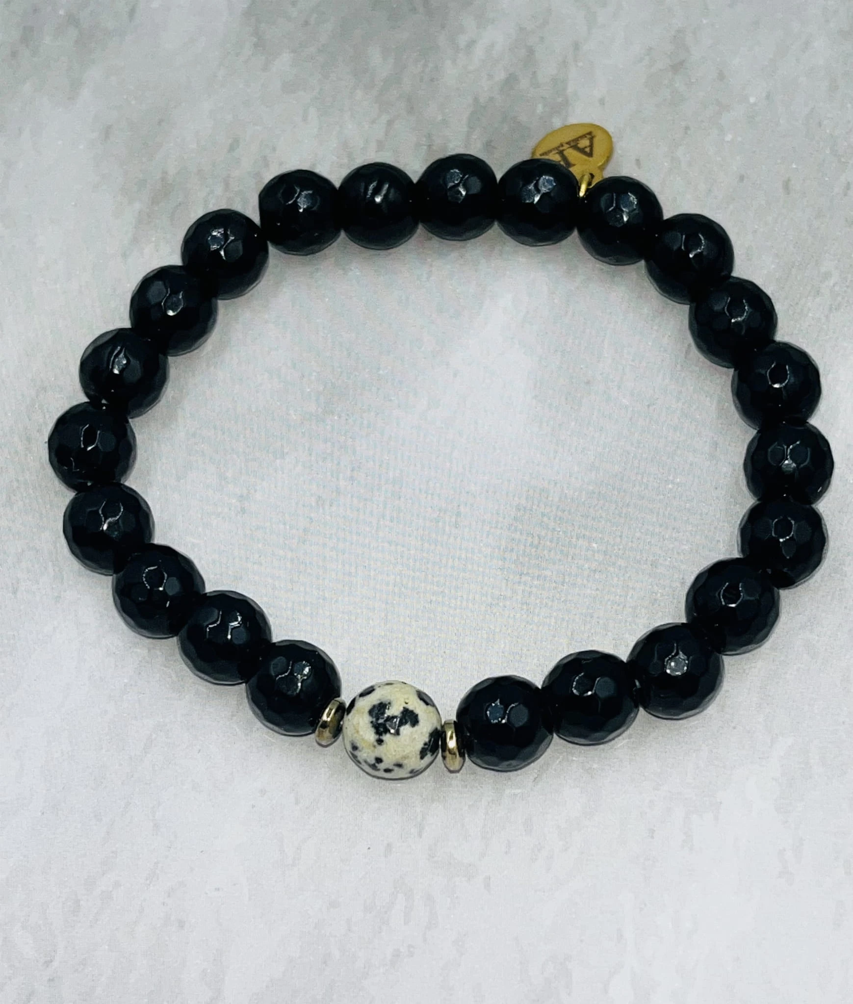 Bransoletka wykonana z fasetowanego onyksu o średnicy 8 mm zachwyca głęboką, intensywną czernią i subtelnym połyskiem uzyskanym dzięki szlifowi. Kompozycję uzupełnia fasetowany jaspis dalmatyński 8 mm, którego jasna barwa z charakterystycznymi ciemnymi akcentami nadaje całości wyrazistego, nowoczesnego charakteru.