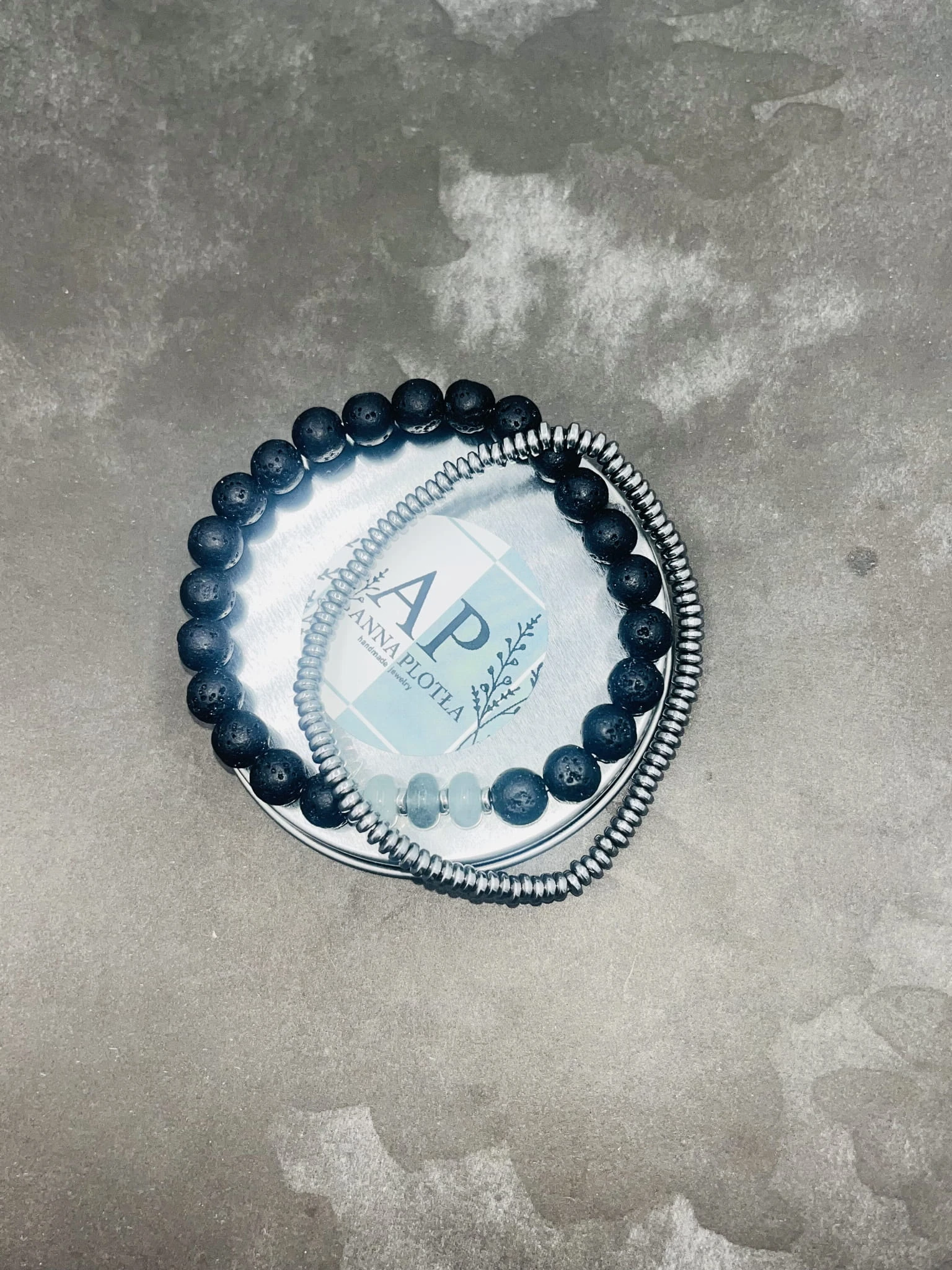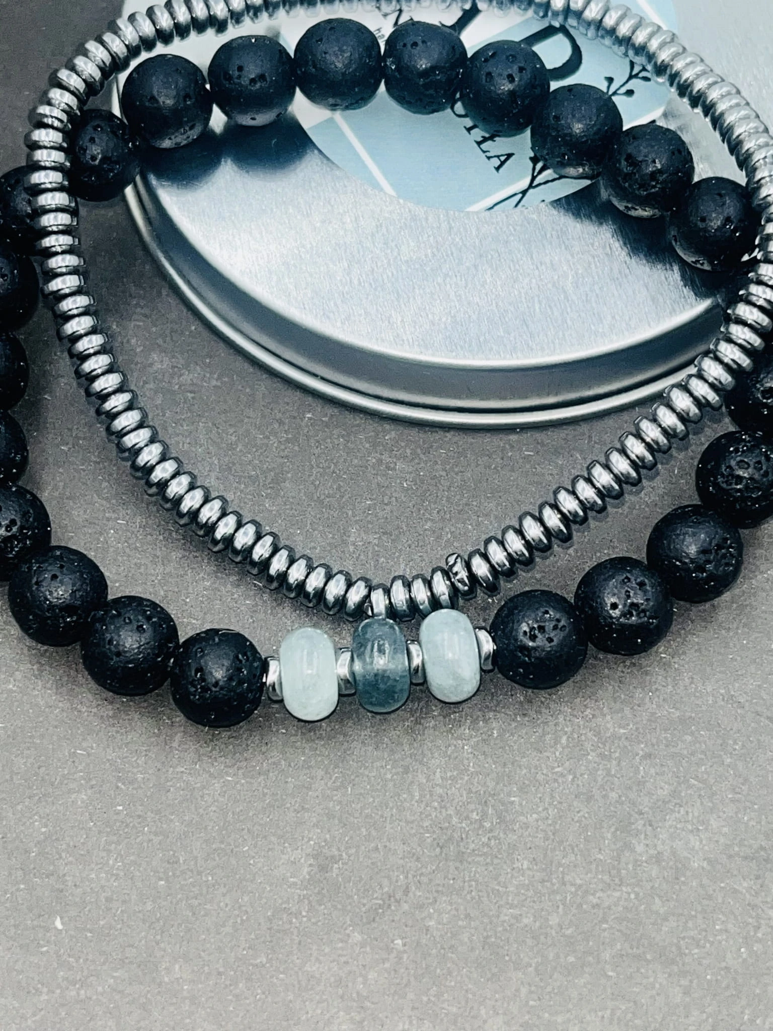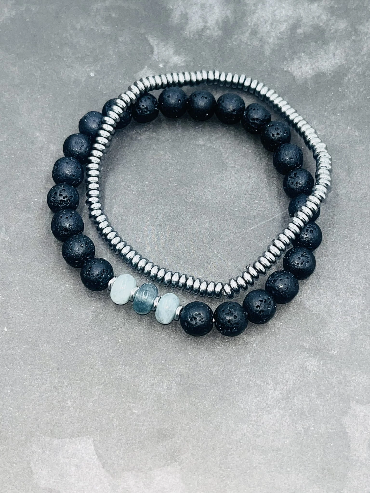Ręcznie wykonany zestaw męskich bransoletek na elastycznej gumce z lawy wulkanicznej, jadeitu jeansowego oraz srebrnego hematytu. Naturalna, surowa estetyka przełamana chłodnym, stonowanym kolorem.