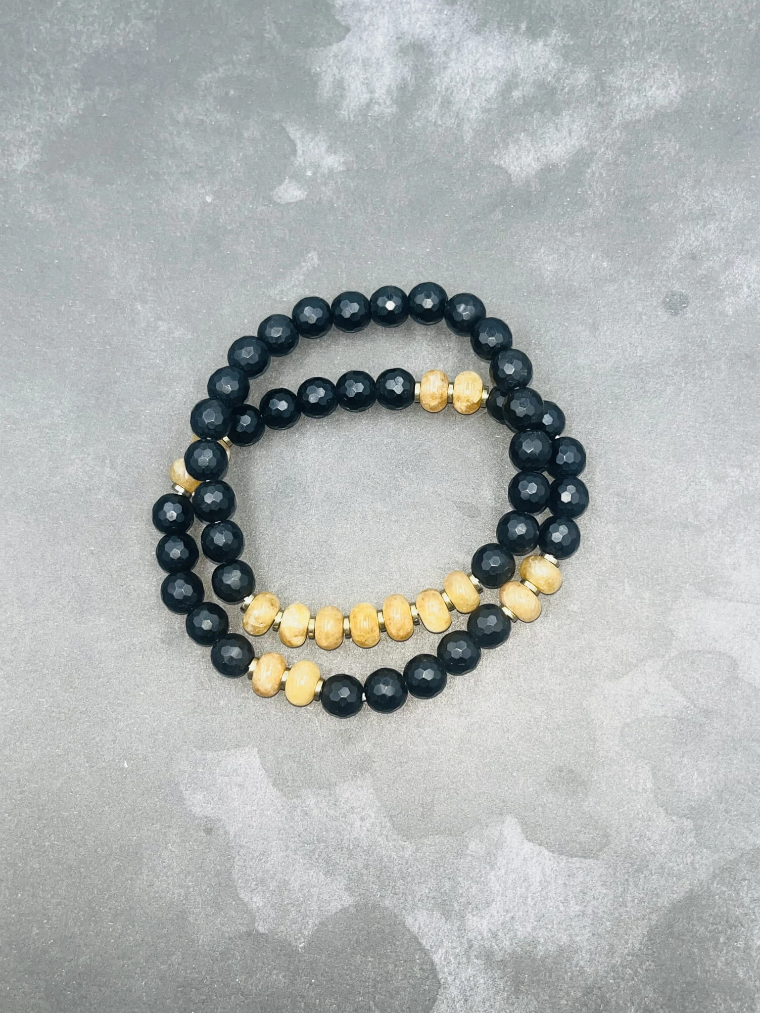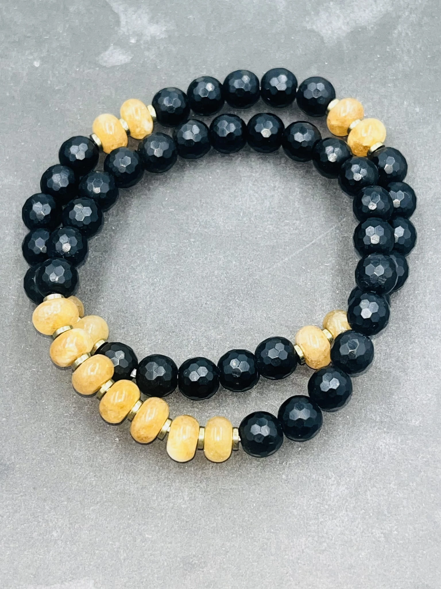 Płaski hematyt w odcieniu złota dopełnia kompozycję metalicznym połyskiem i eleganckim kontrastem. Bransoletki nawleczone są na elastyczną gumkę, dzięki czemu są wygodne w noszeniu i łatwe do zakładania.