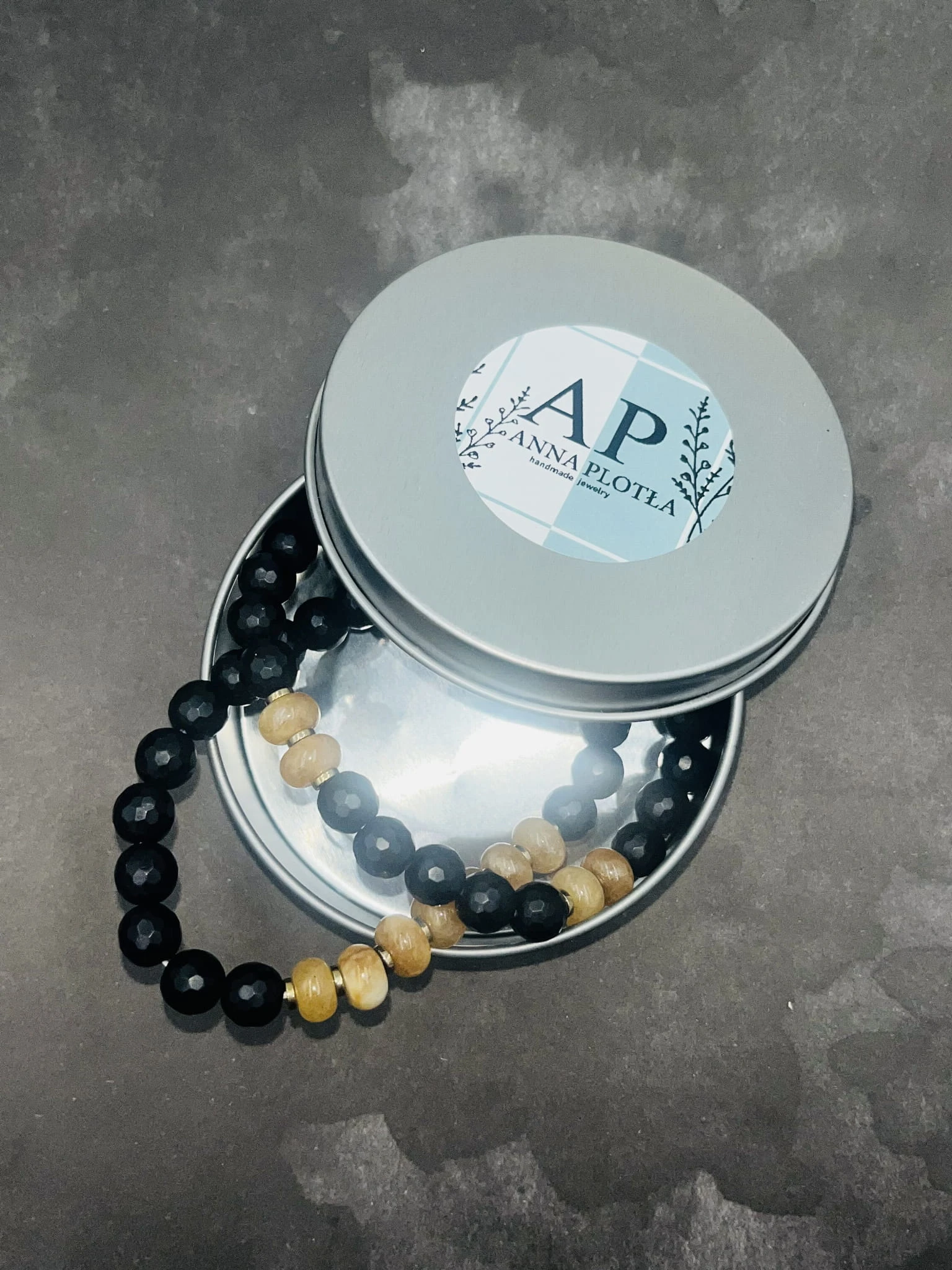 Aby zachować estetykę kamieni i trwałość gumki, unikaj kontaktu bransoletek z wodą, perfumami oraz kosmetykami. Przechowuj w suchym miejscu, najlepiej w osobnym woreczku lub pudełku.