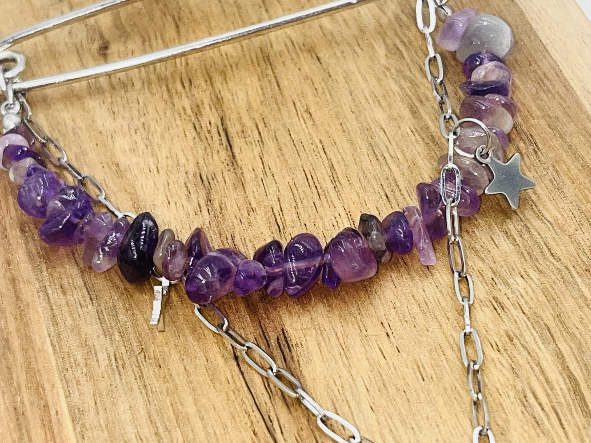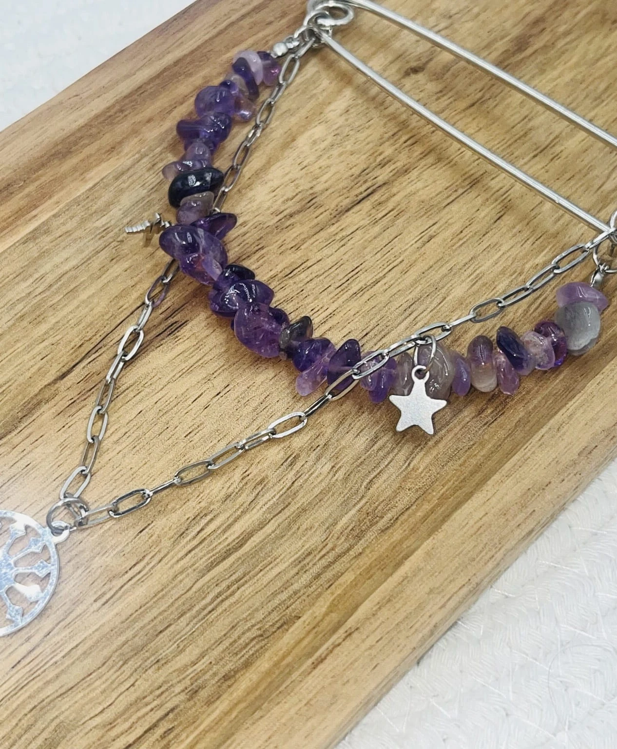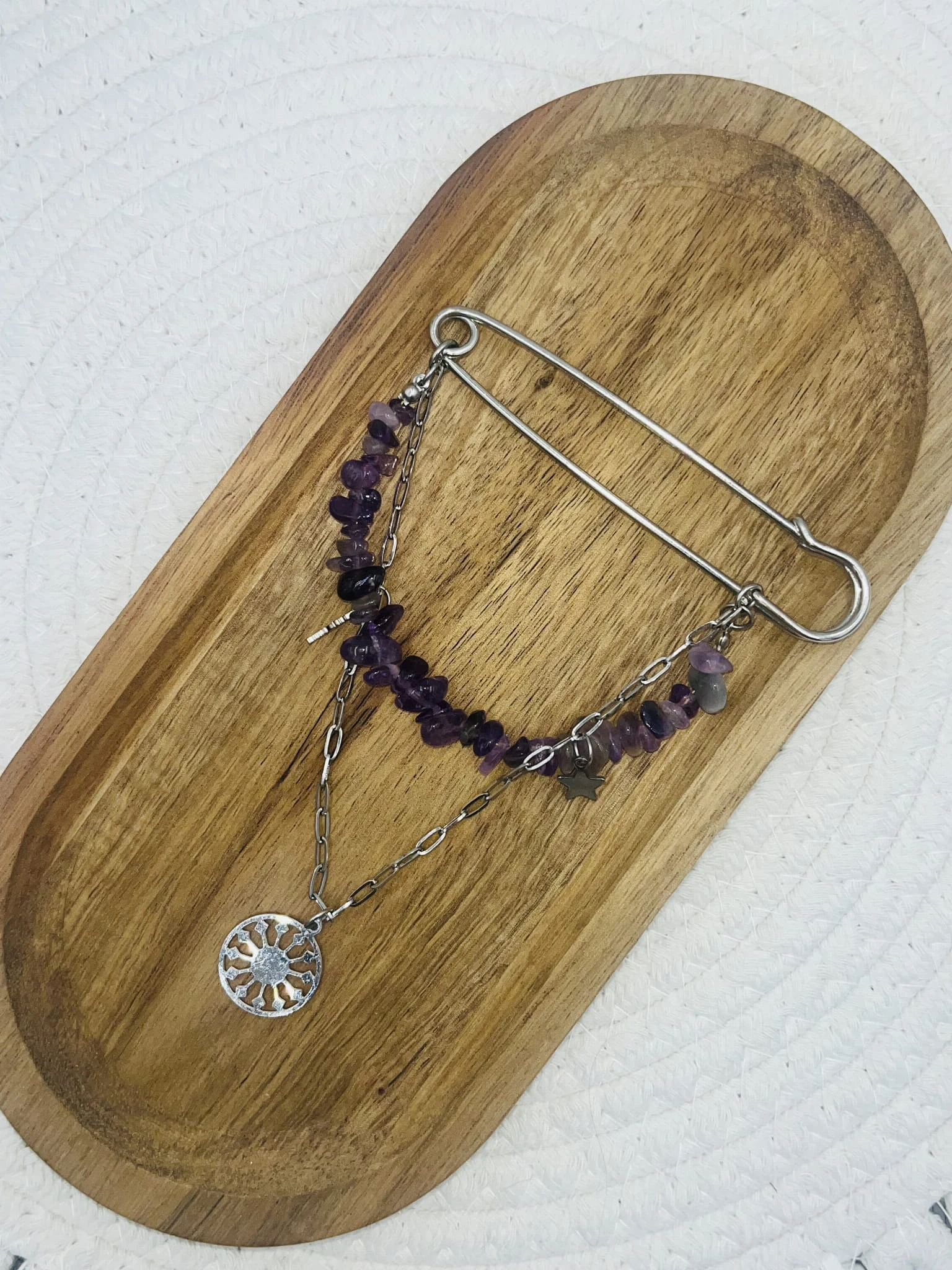Ręcznie robiona broszka z ametystu w formie sieczki przyciąga uwagę głębokim odcieniem fioletu i nieregularną strukturą naturalnego kamienia. Kompozycję uzupełnia delikatny łańcuszek oraz zawieszki wykonane ze stali chirurgicznej, które nadają całości nowoczesnego charakteru i subtelnego połysku.