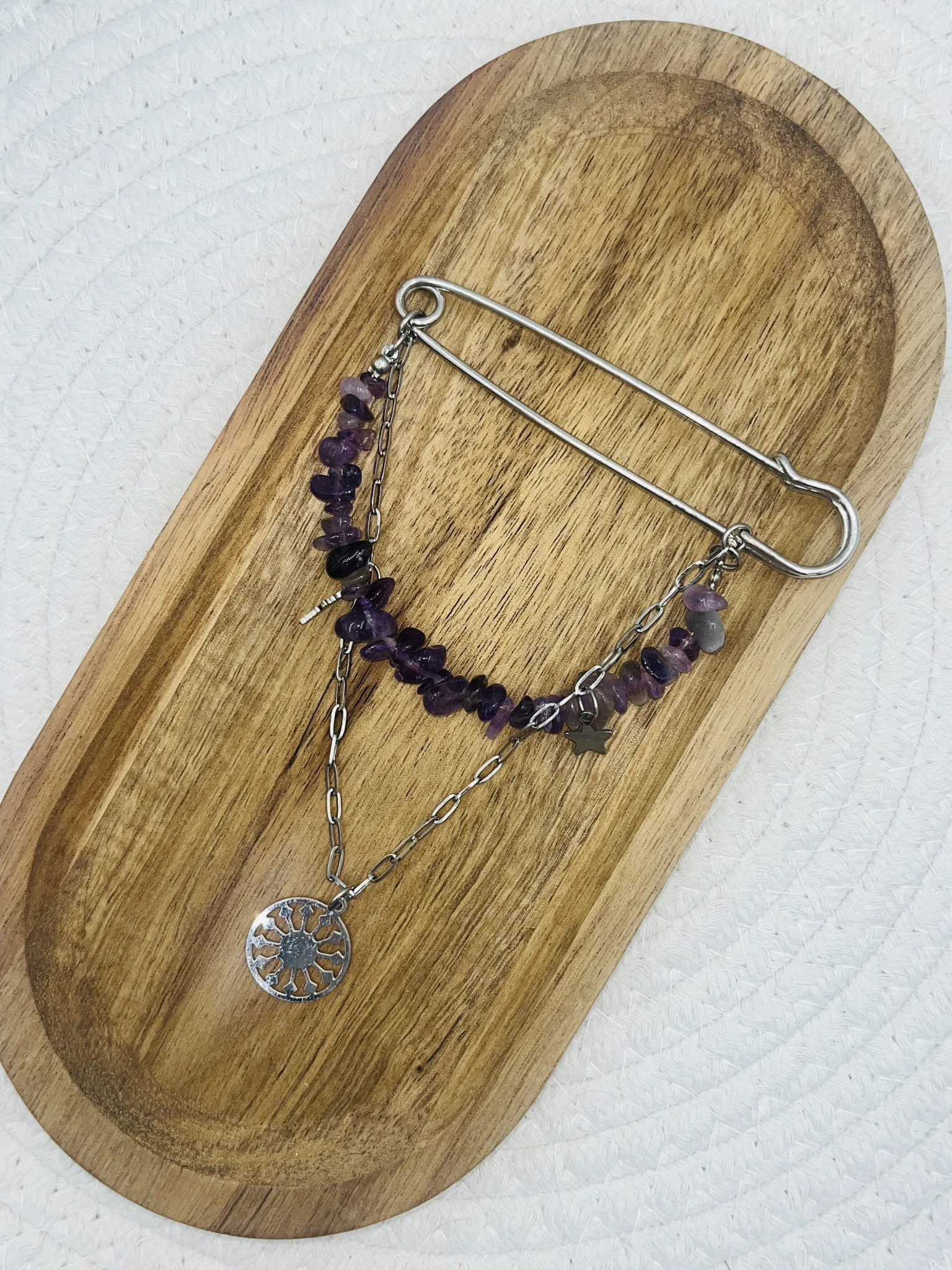 Ręcznie wykonana broszka z ametystu w formie sieczki, ozdobiona łańcuszkiem oraz zawieszkami ze stali chirurgicznej. Subtelne połączenie naturalnego kamienia z nowoczesnym, metalicznym wykończeniem. Elegancki, dekoracyjny dodatek do marynarki lub koszuli.