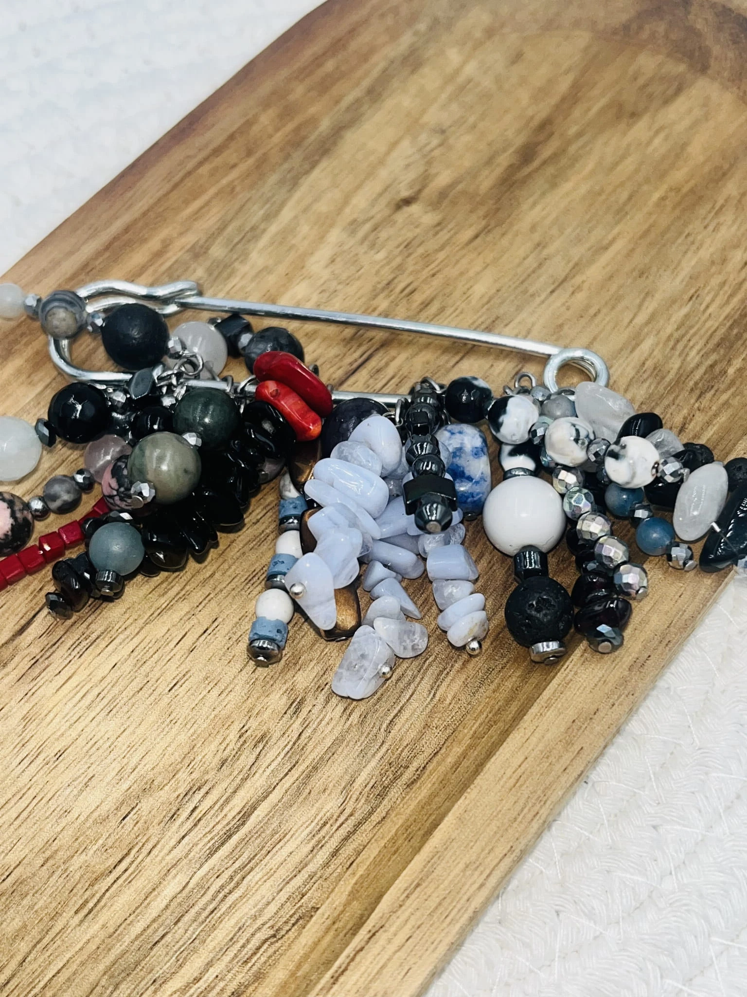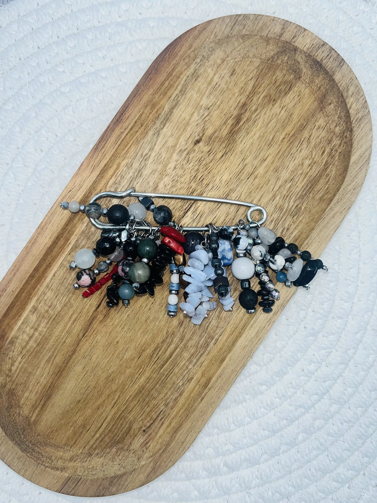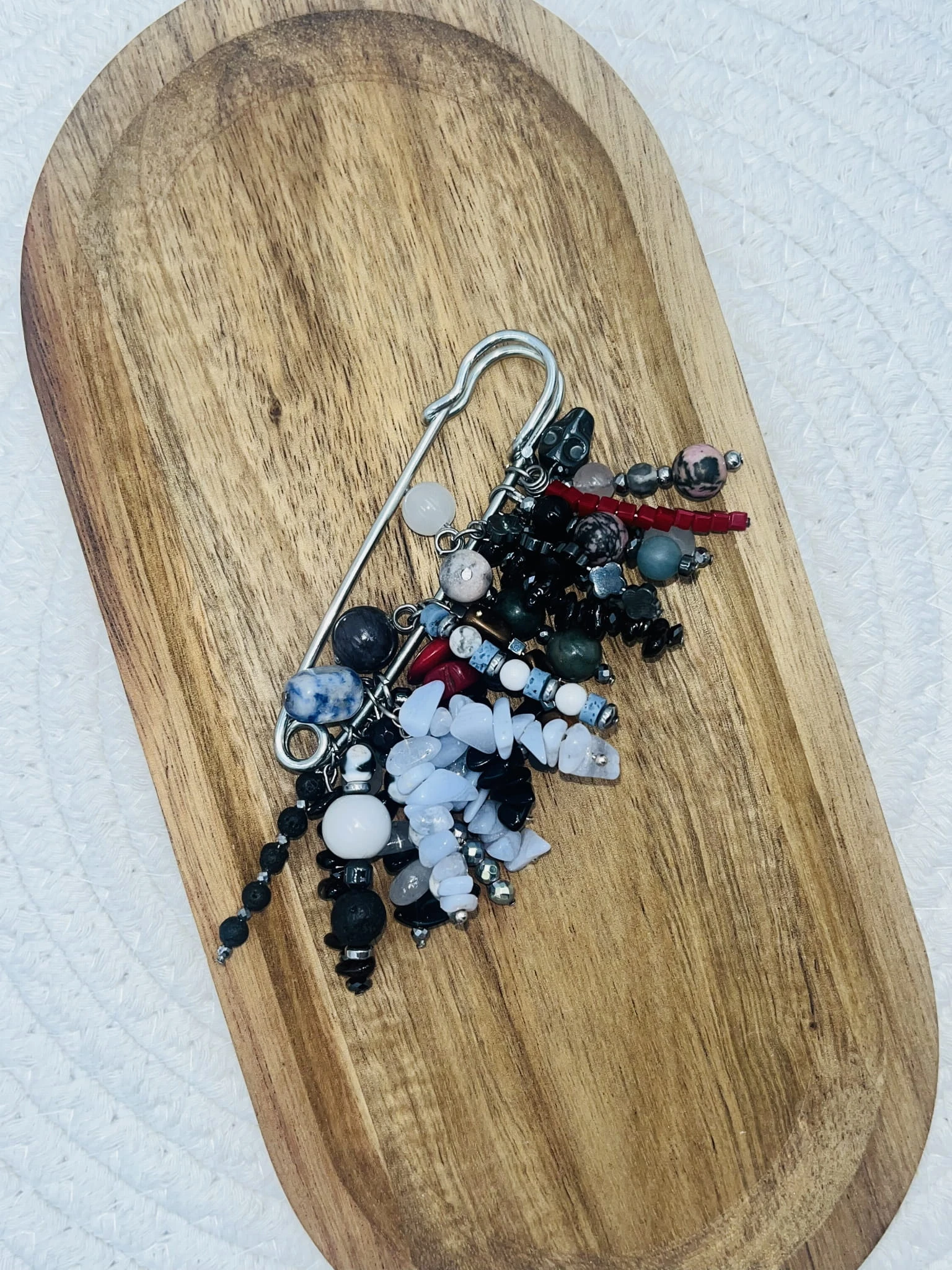 Ręcznie wykonana broszka z mixu kamieni naturalnych: granatu, hematytu, onyksu, jadeitu i rodonitu. Wyrazisty, biżuteryjny akcent o eleganckim, lekko artystycznym charakterze. Idealna do marynarki, koszuli lub jako detal stylizacji.