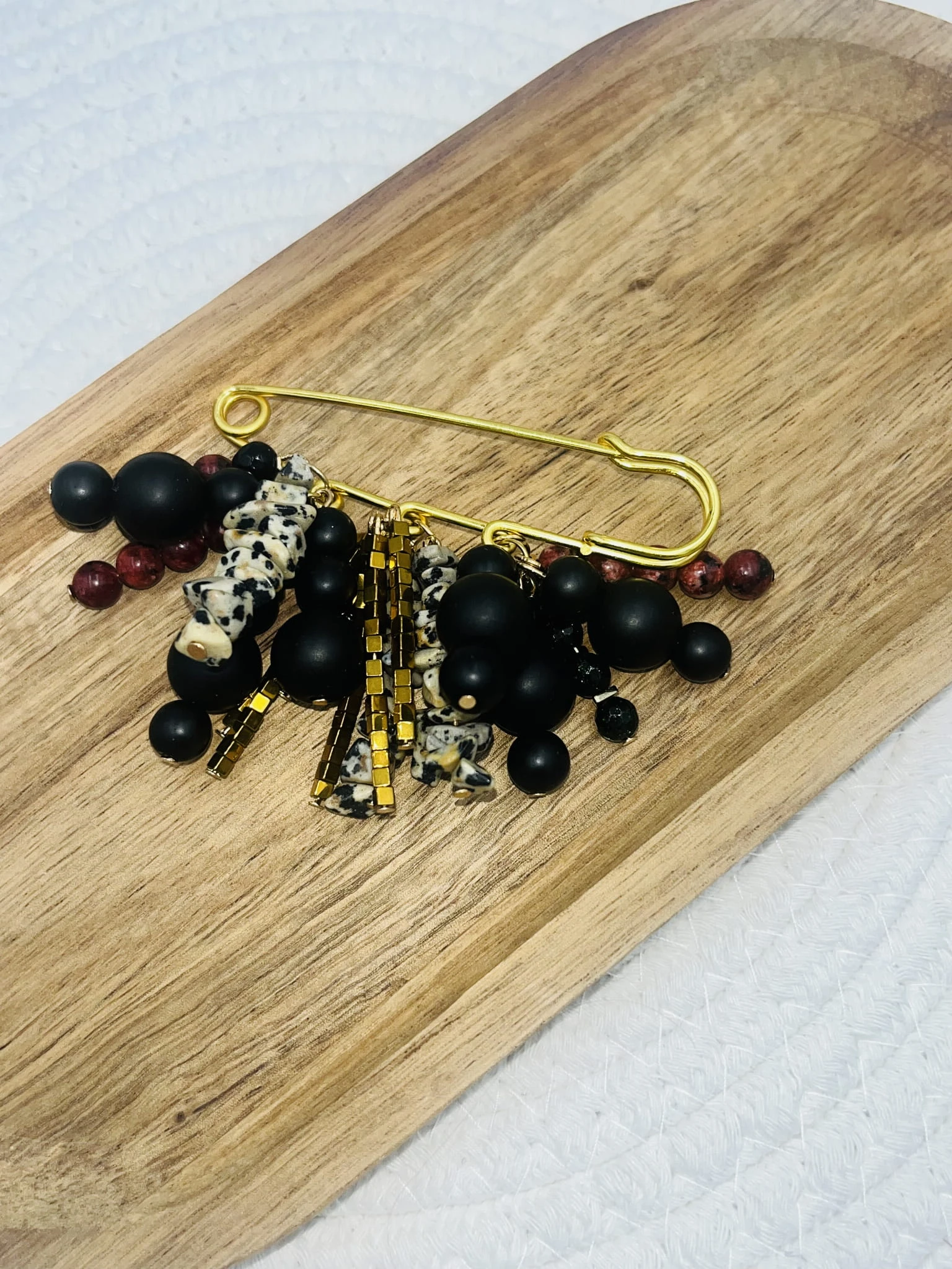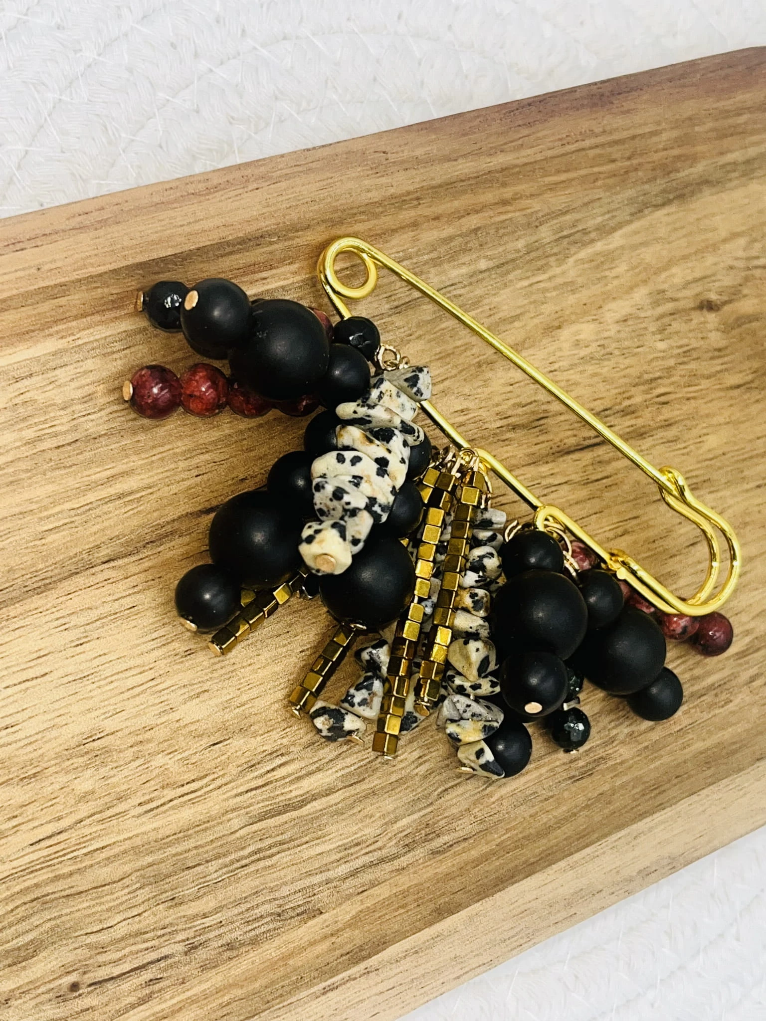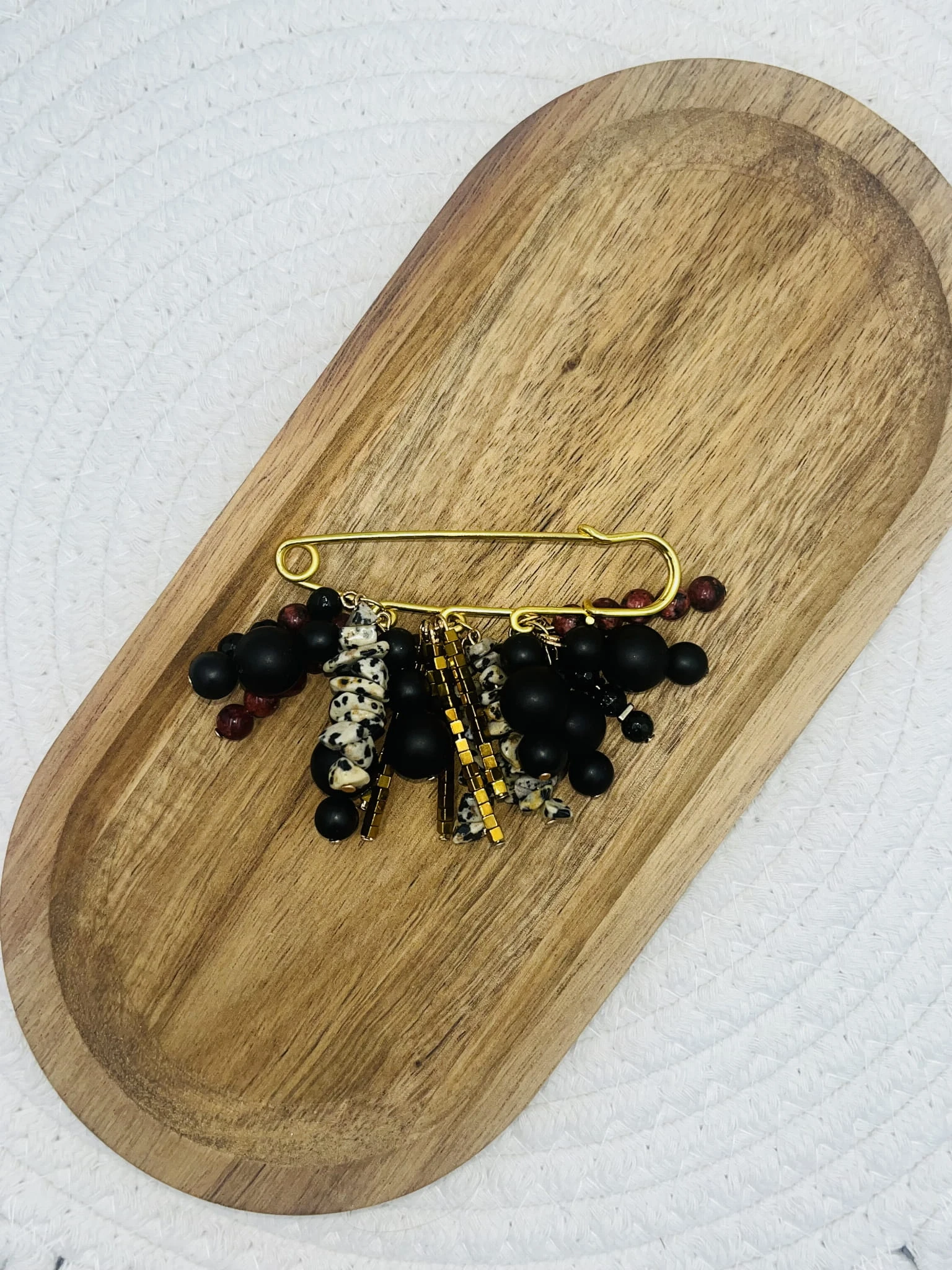 Ręcznie wykonana broszka z mixu kamieni naturalnych o wielkości 2–8 mm: onyksu, jaspisu dalmatyńskiego, jaspisu i hematytu. Kontrast wzorów i faktur połączony ze złotą agrafką tworzy elegancki, a zarazem nowoczesny akcent stylizacji. Idealna do marynarki, koszuli lub jako wyrazisty detal.