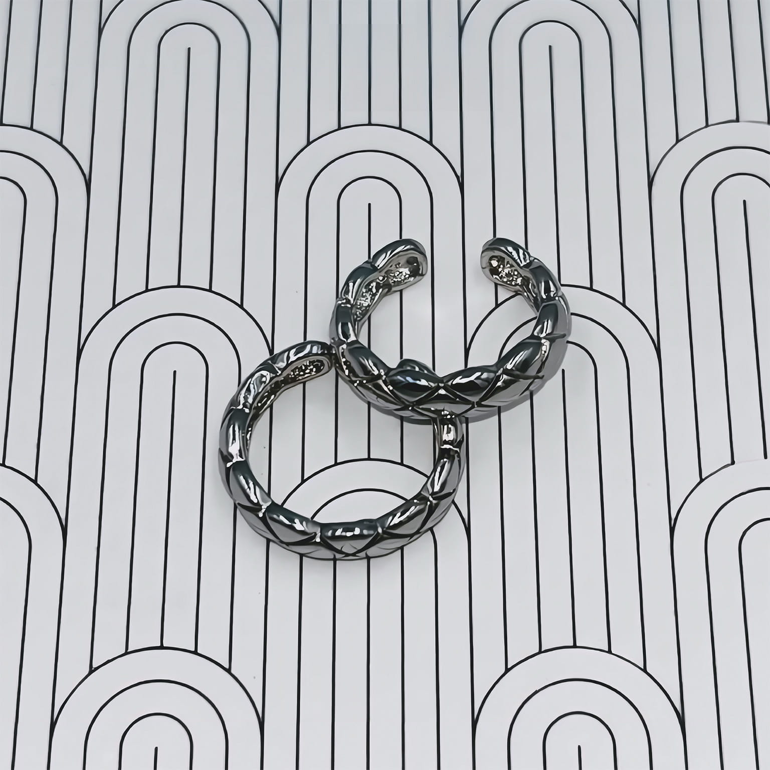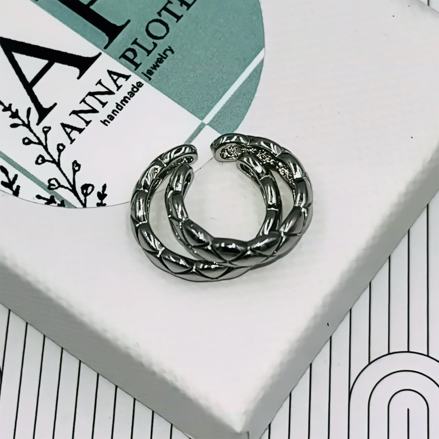 Kolczyk typu nausznica wykonany z rodowanej miedzi to elegancka i nowoczesna forma biżuterii. Srebrne wykończenie nadaje całości chłodnego, minimalistycznego charakteru, który doskonale wpisuje się w codzienne stylizacje.