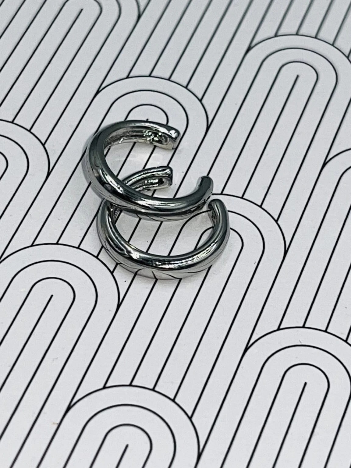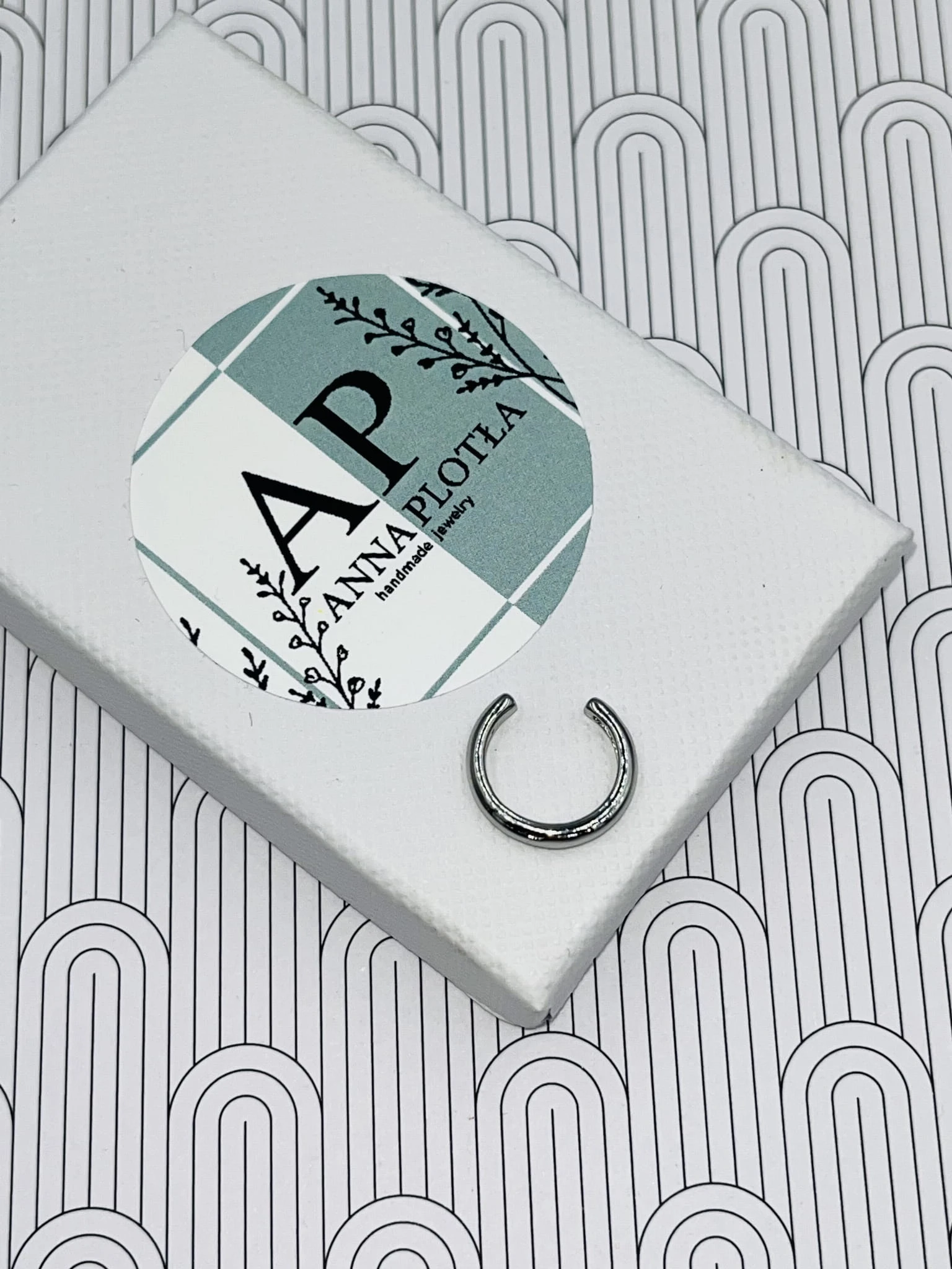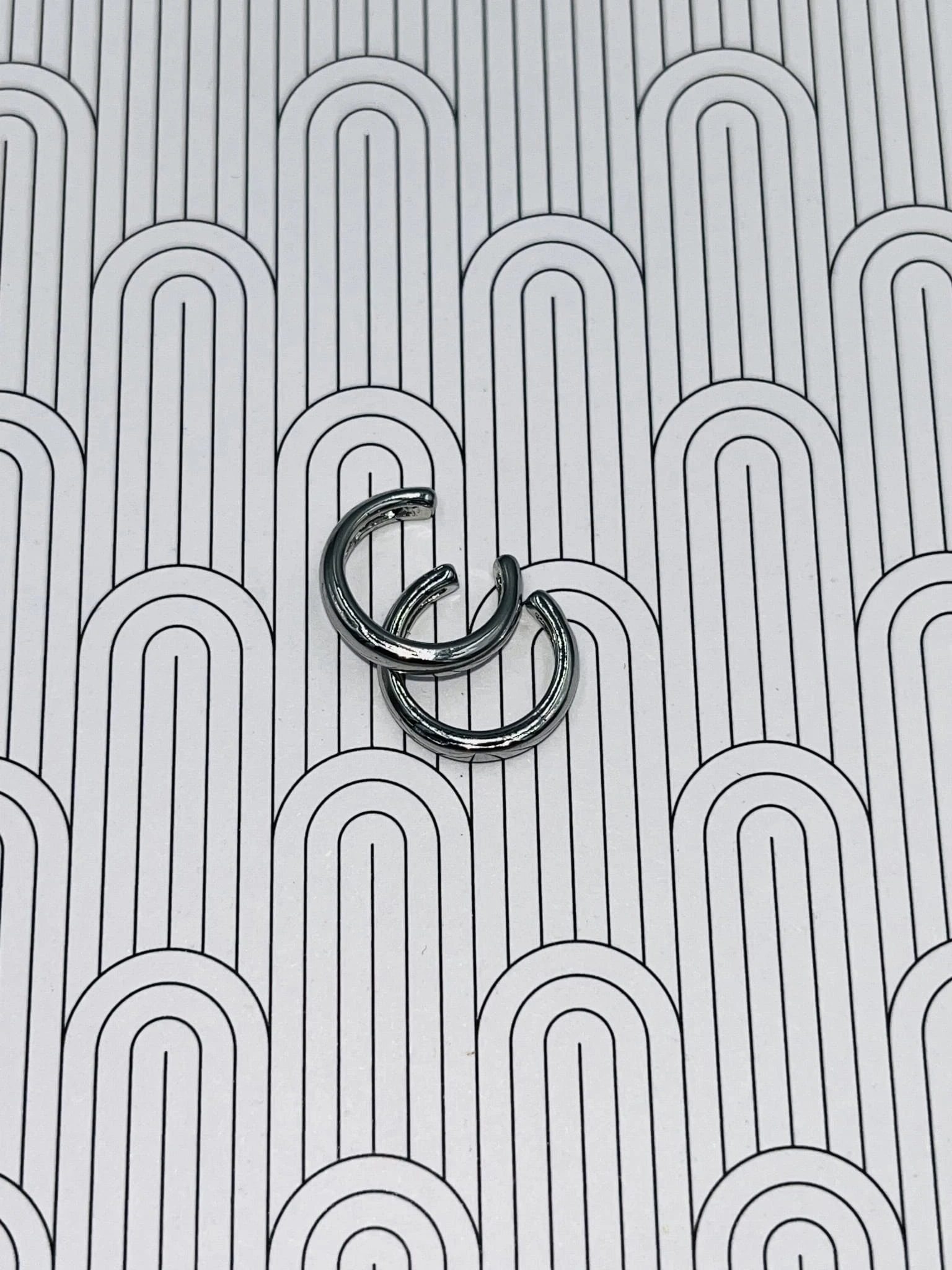 Minimalistyczna nausznica gładka, cienka z rodowanej miedzi w odcieniu srebrnym. Subtelny, nowoczesny akcent, który podkreśla linię ucha bez potrzeby przekłuwania.
