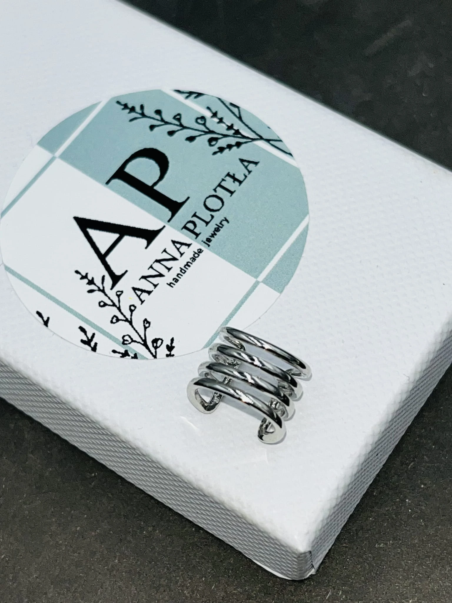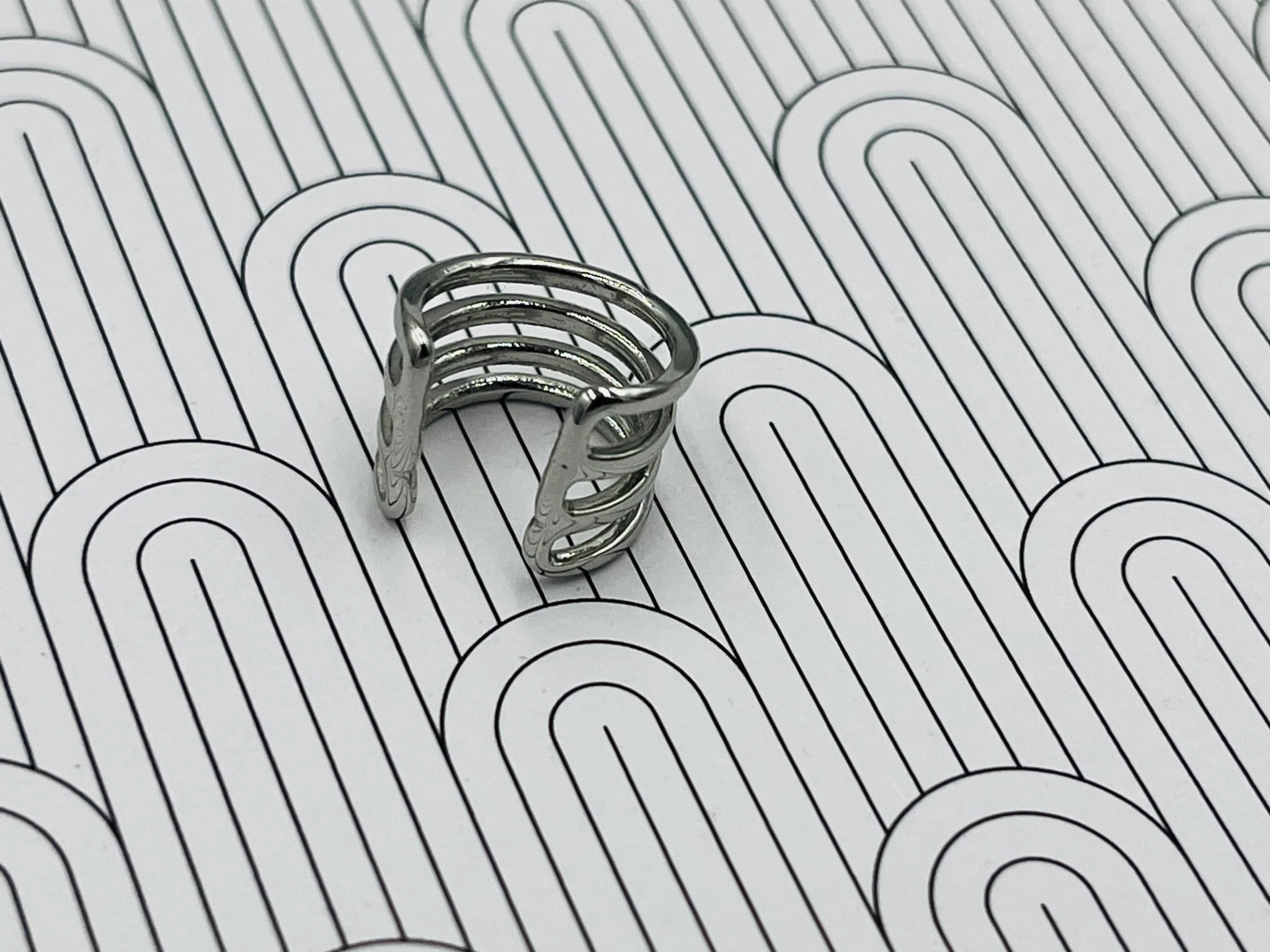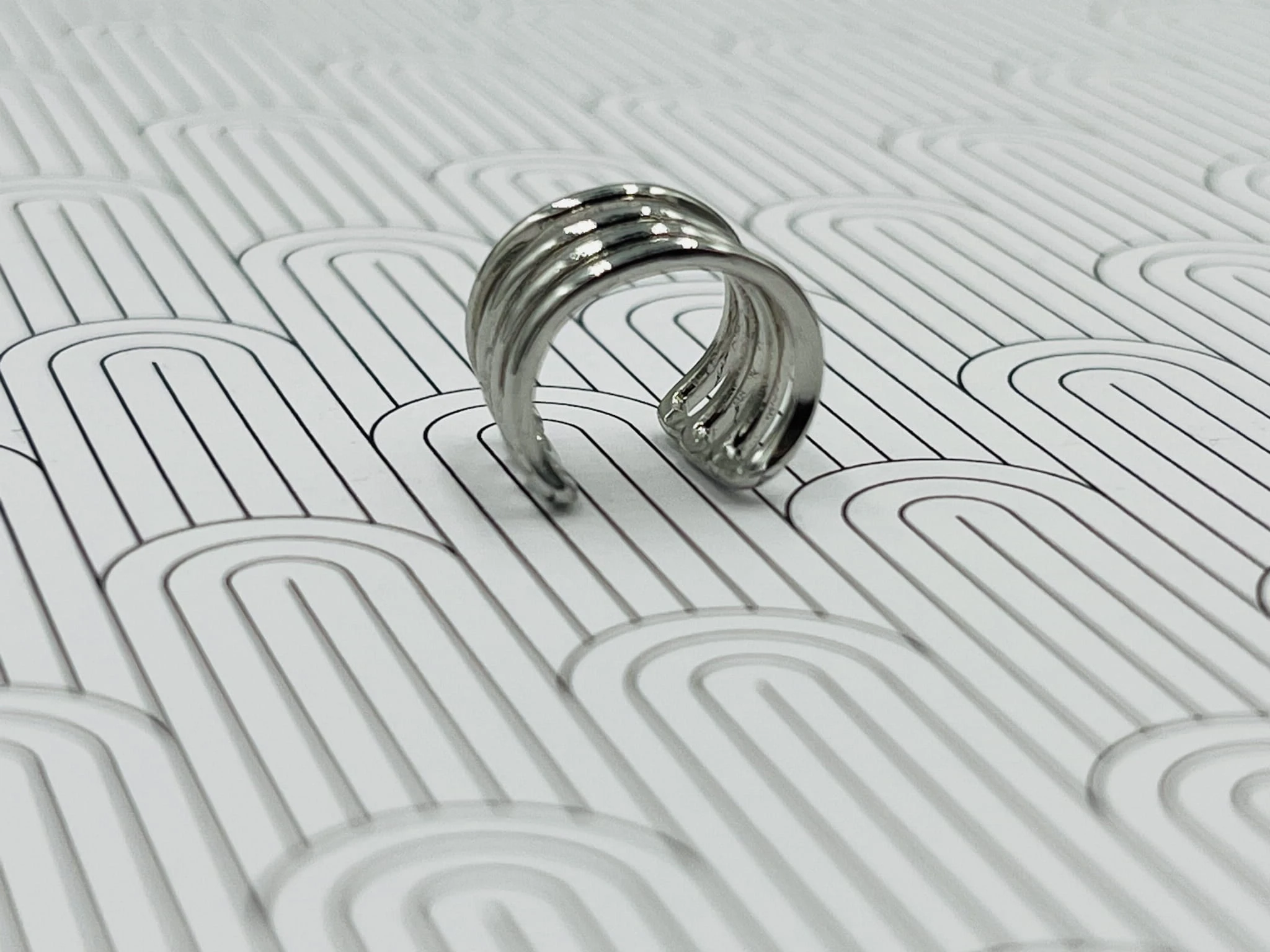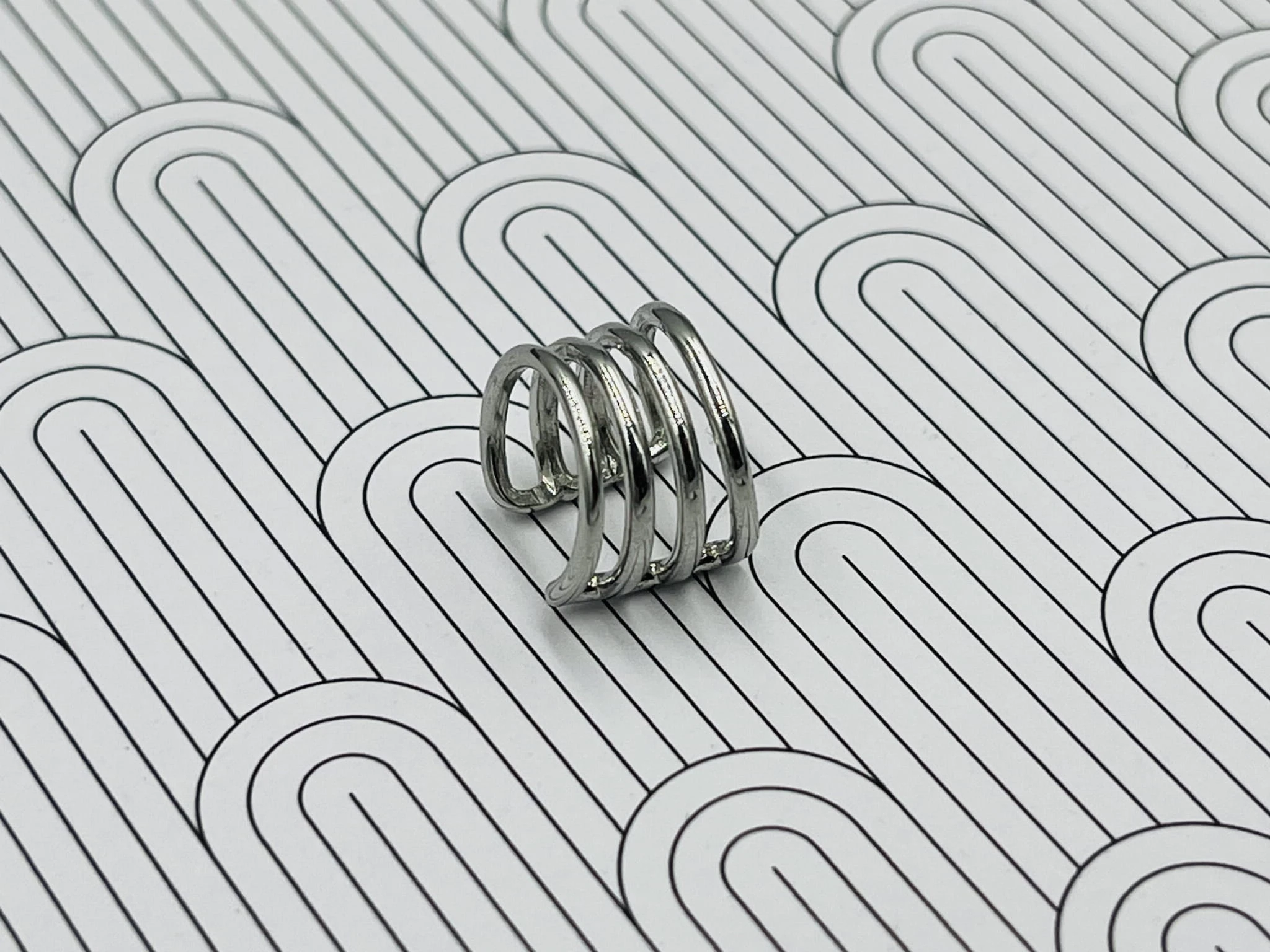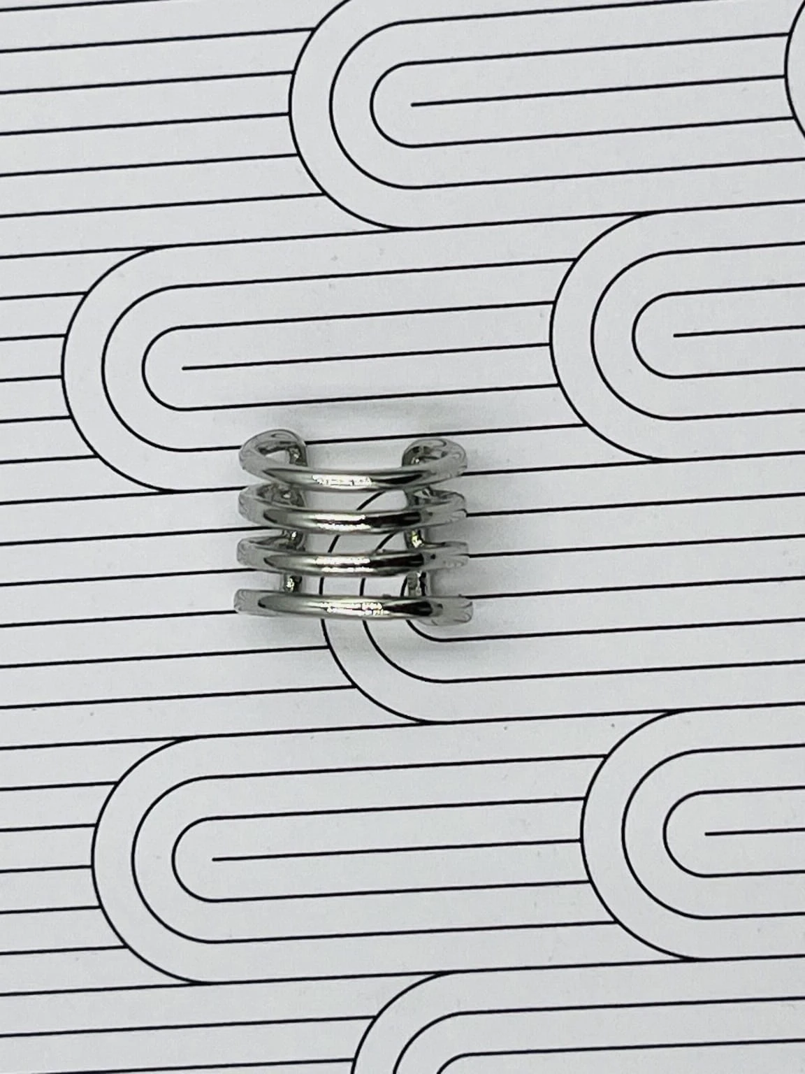 Minimalistyczna nausznica z rodowanej miedzi w odcieniu srebrnym, poczwórne paski. Subtelny, nowoczesny akcent, który podkreśla linię ucha bez potrzeby przekłuwania.
