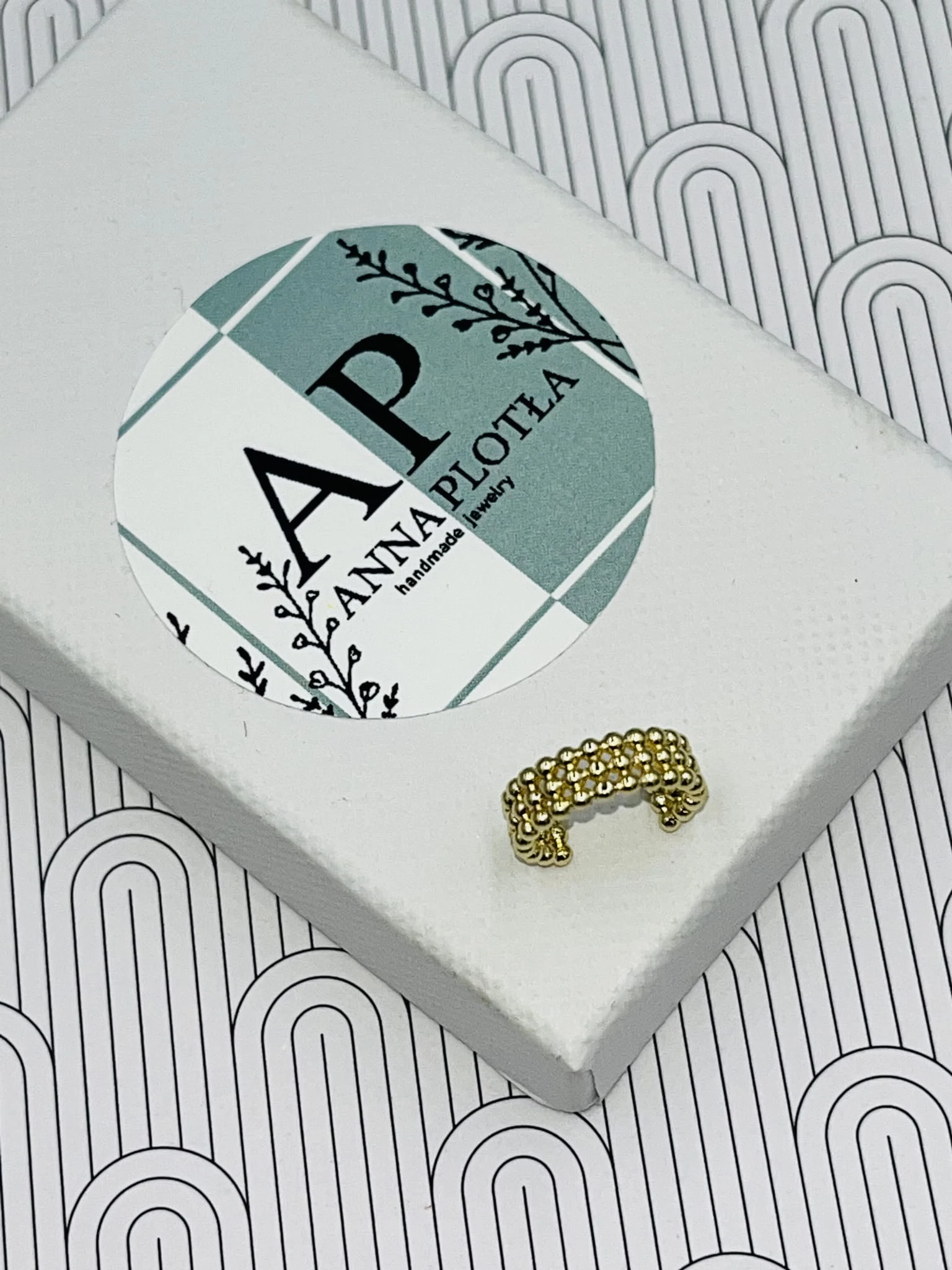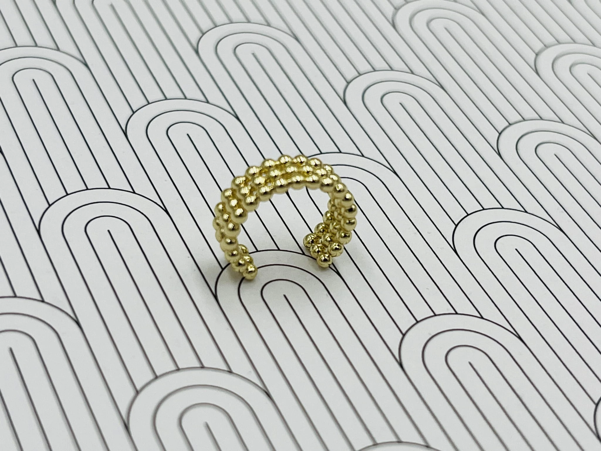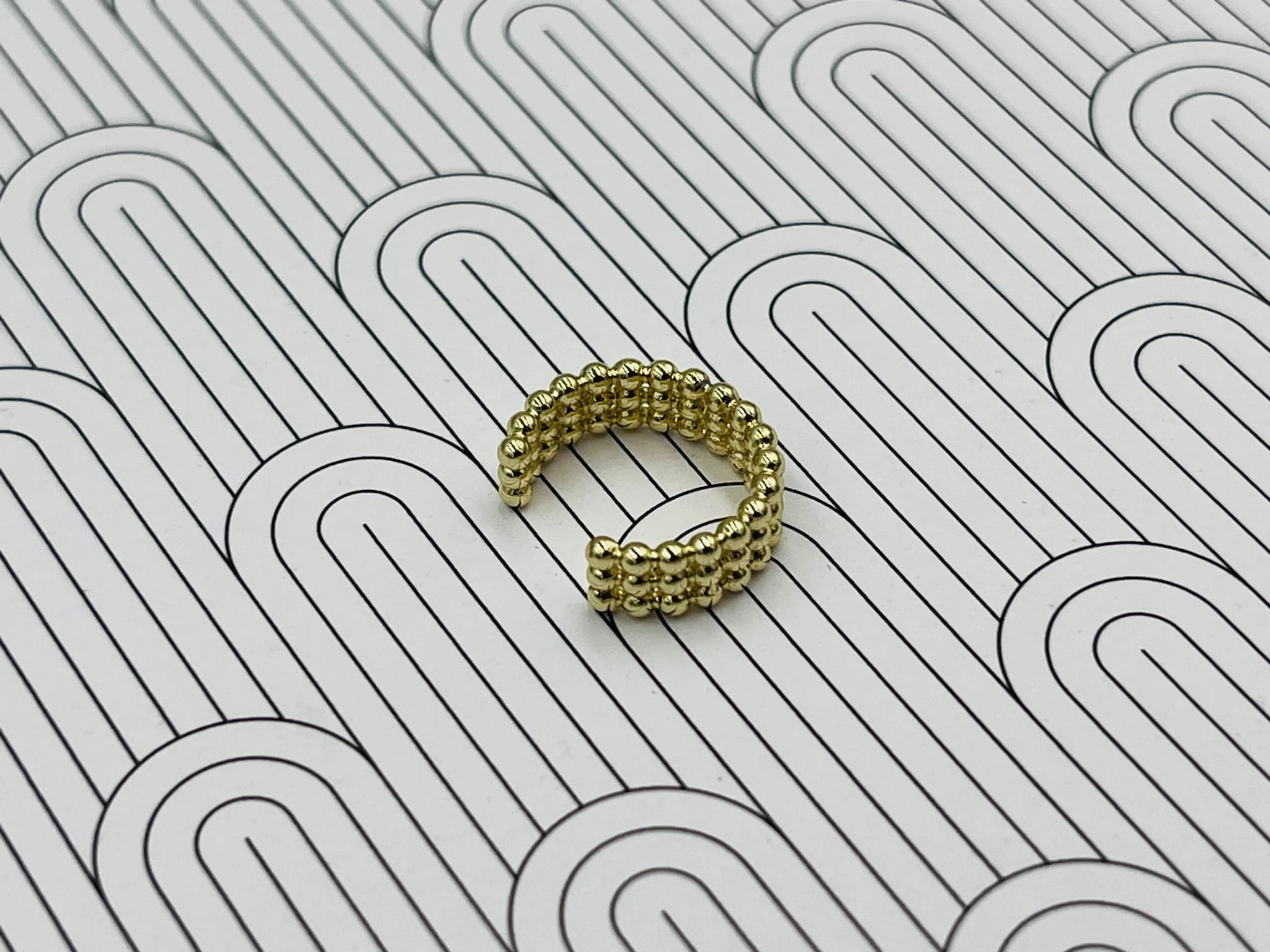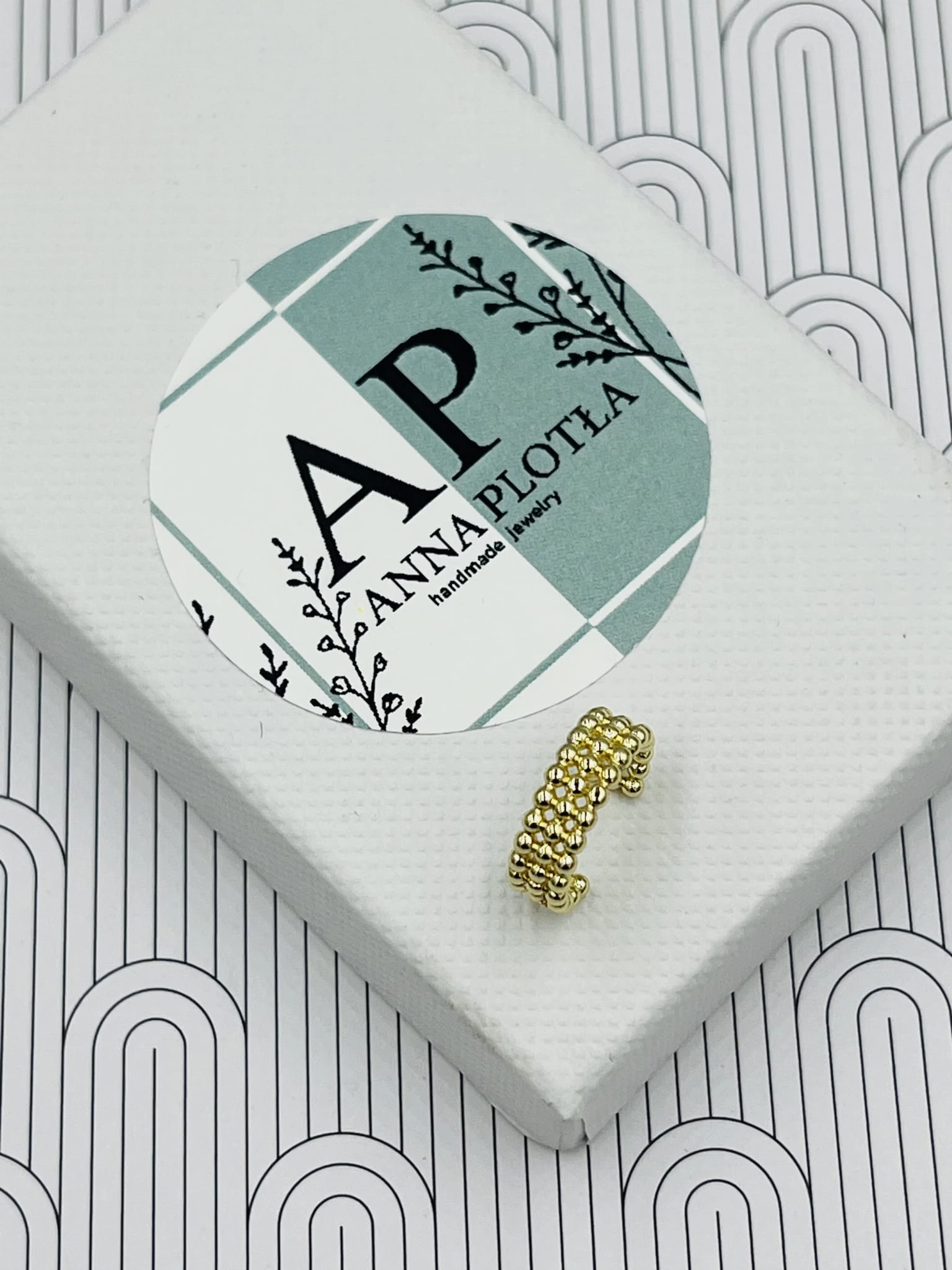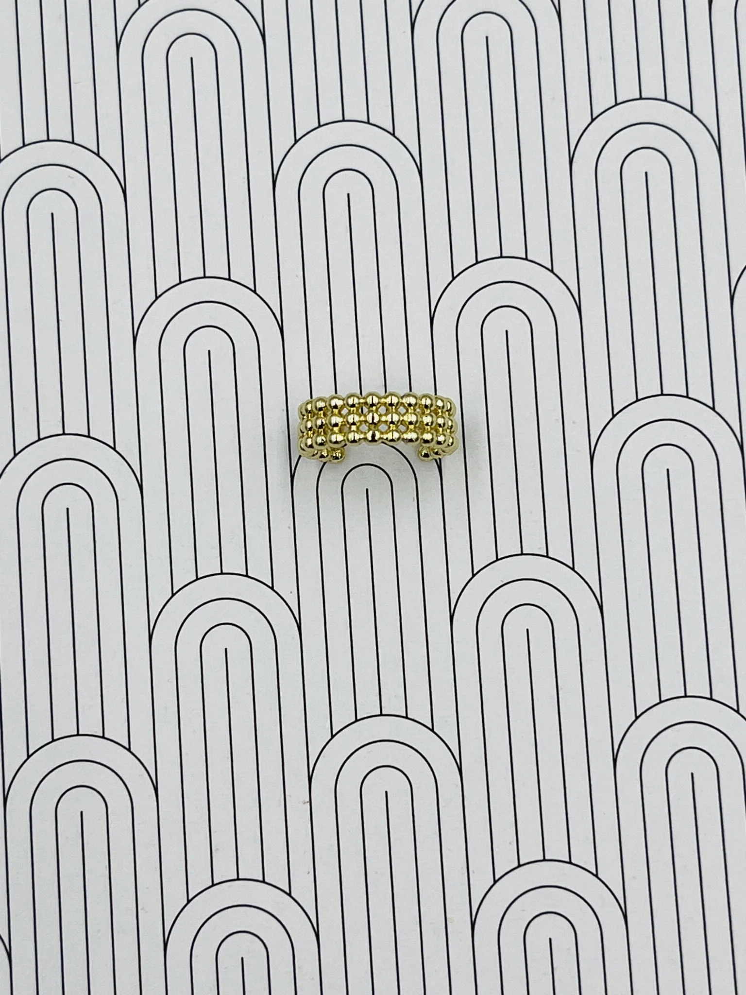 Kolczyk typu nausznica wykonany z pozłacanej miedzi to delikatna, ale wyrazista forma biżuterii. Potrójne kulki tworzą harmonijną kompozycję, która subtelnie oplata ucho, nadając stylizacji nowoczesnego charakteru.