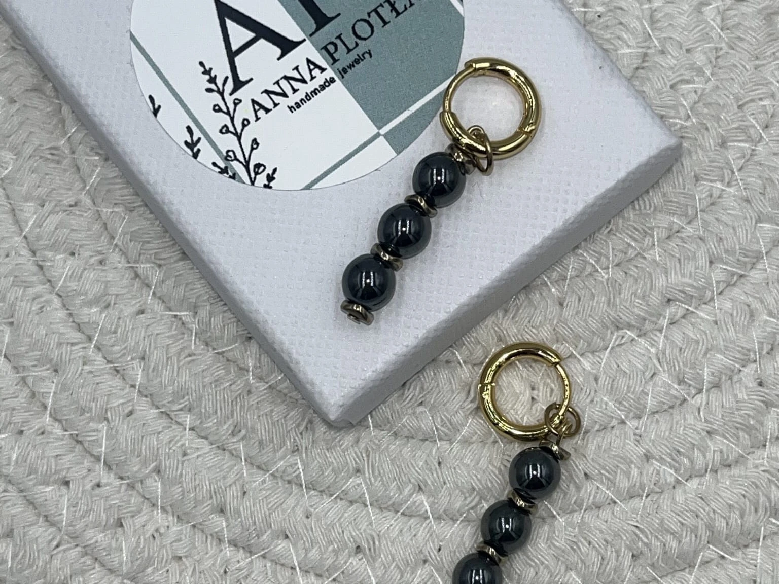 Kompozycję uzupełniają płaskie dyski z hematytu w odcieniu złotym, wprowadzające subtelny kontrast kolorystyczny i delikatny blask. Długość zawieszki wynosi około 3 cm, dzięki czemu kolczyki prezentują się lekko i proporcjonalnie.
