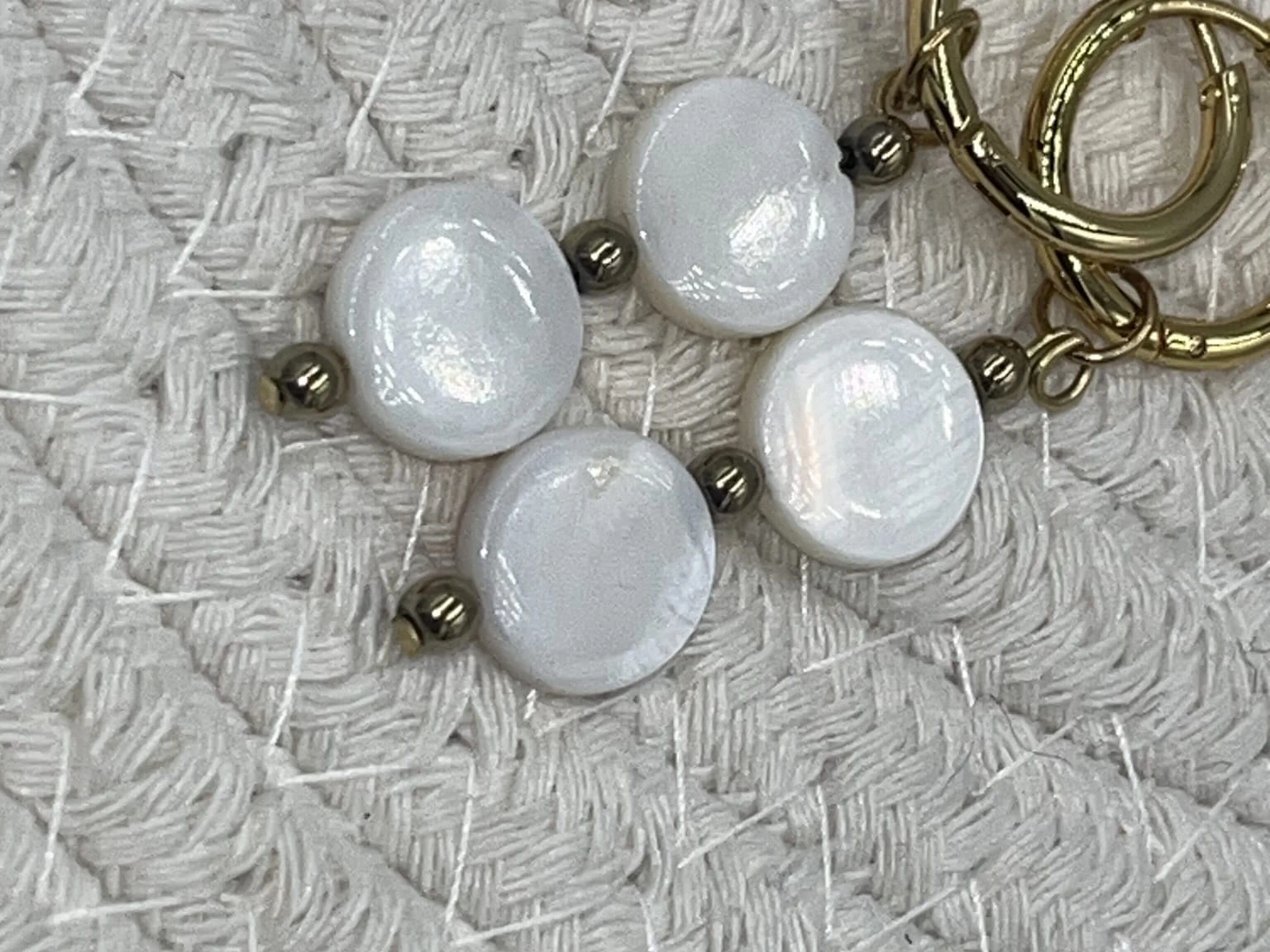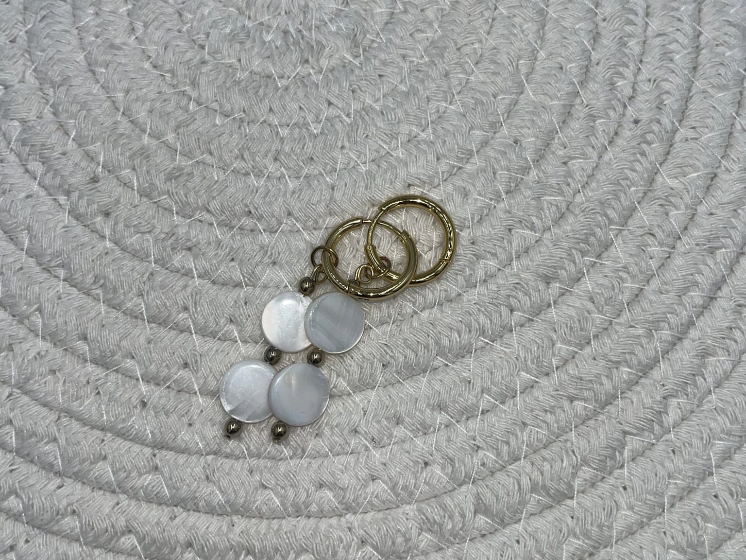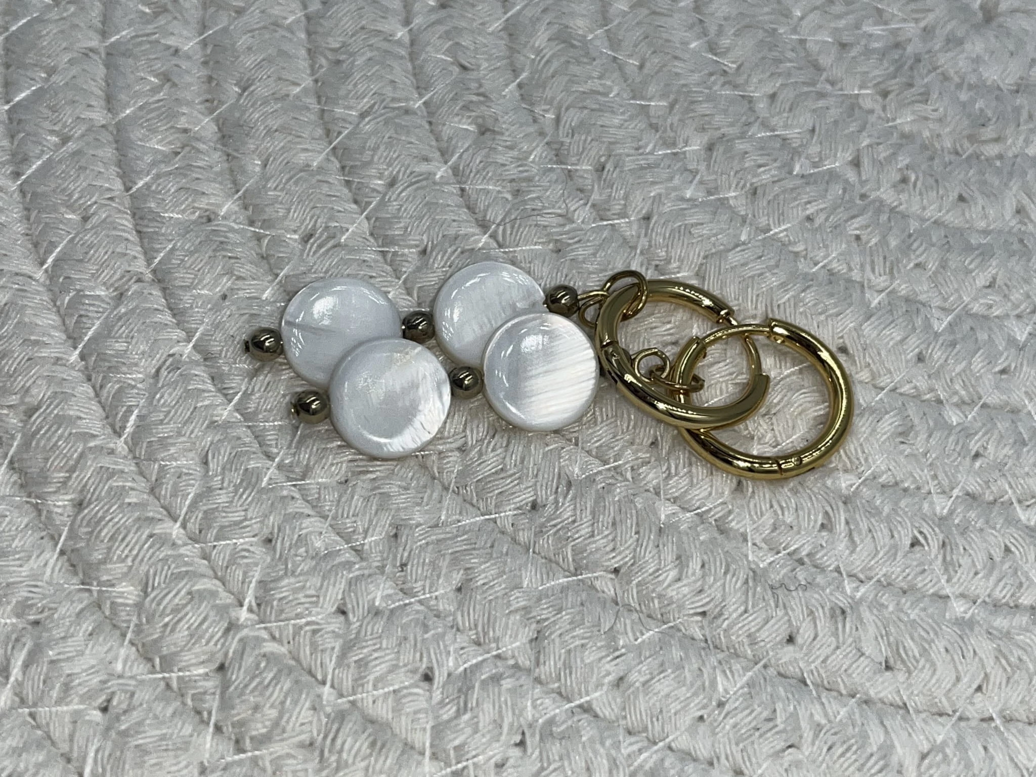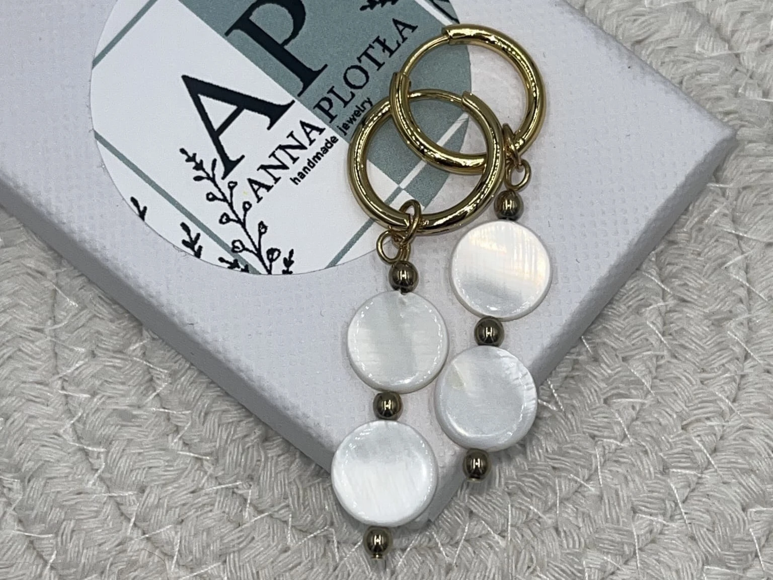 Kolczyki na bazie ze stali chirurgicznej 1,5 cm 316L z zawieszką w formie kółka z masy perłowej 10 mm oraz złotą, gładką kulką hematytu 3 mm. Subtelny perłowy połysk połączony ze złotym akcentem tworzy elegancką, lekką kompozycję. Idealne do stylizacji codziennych i klasycznych.