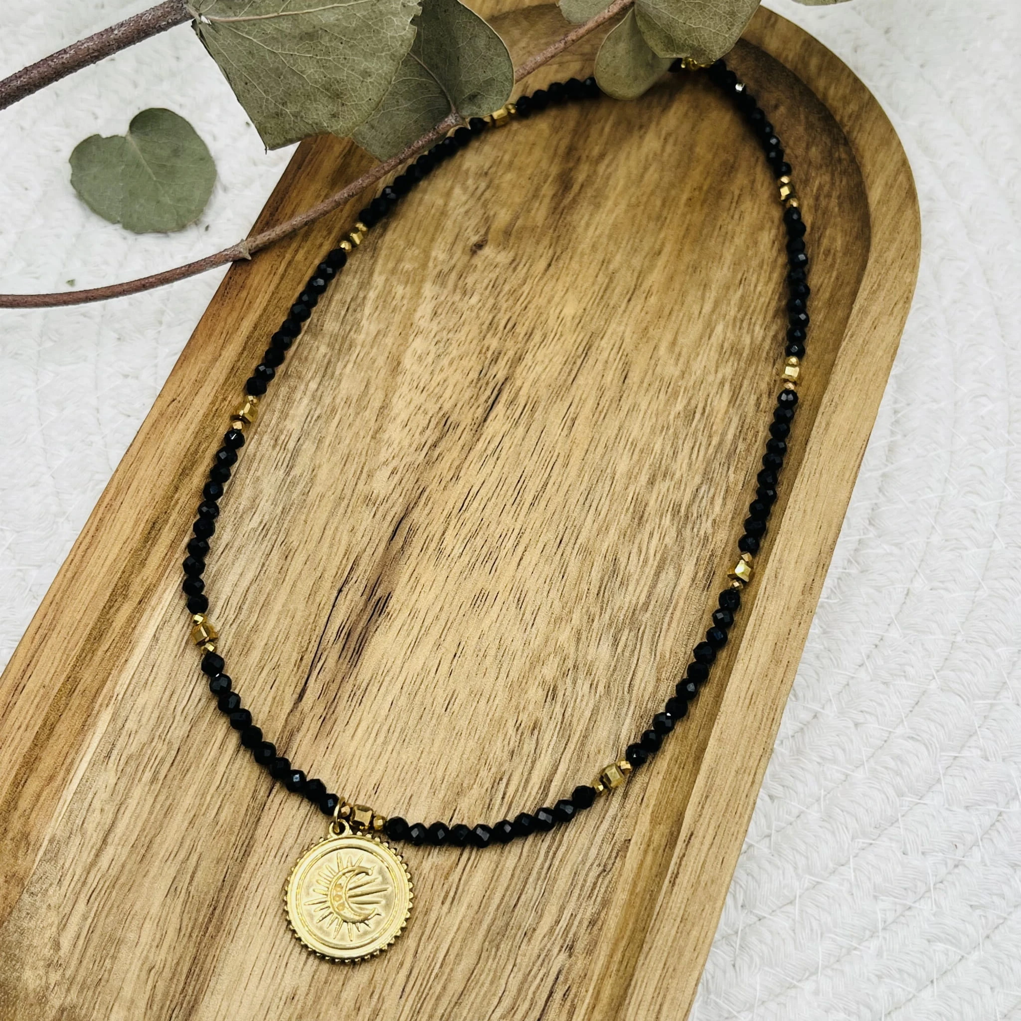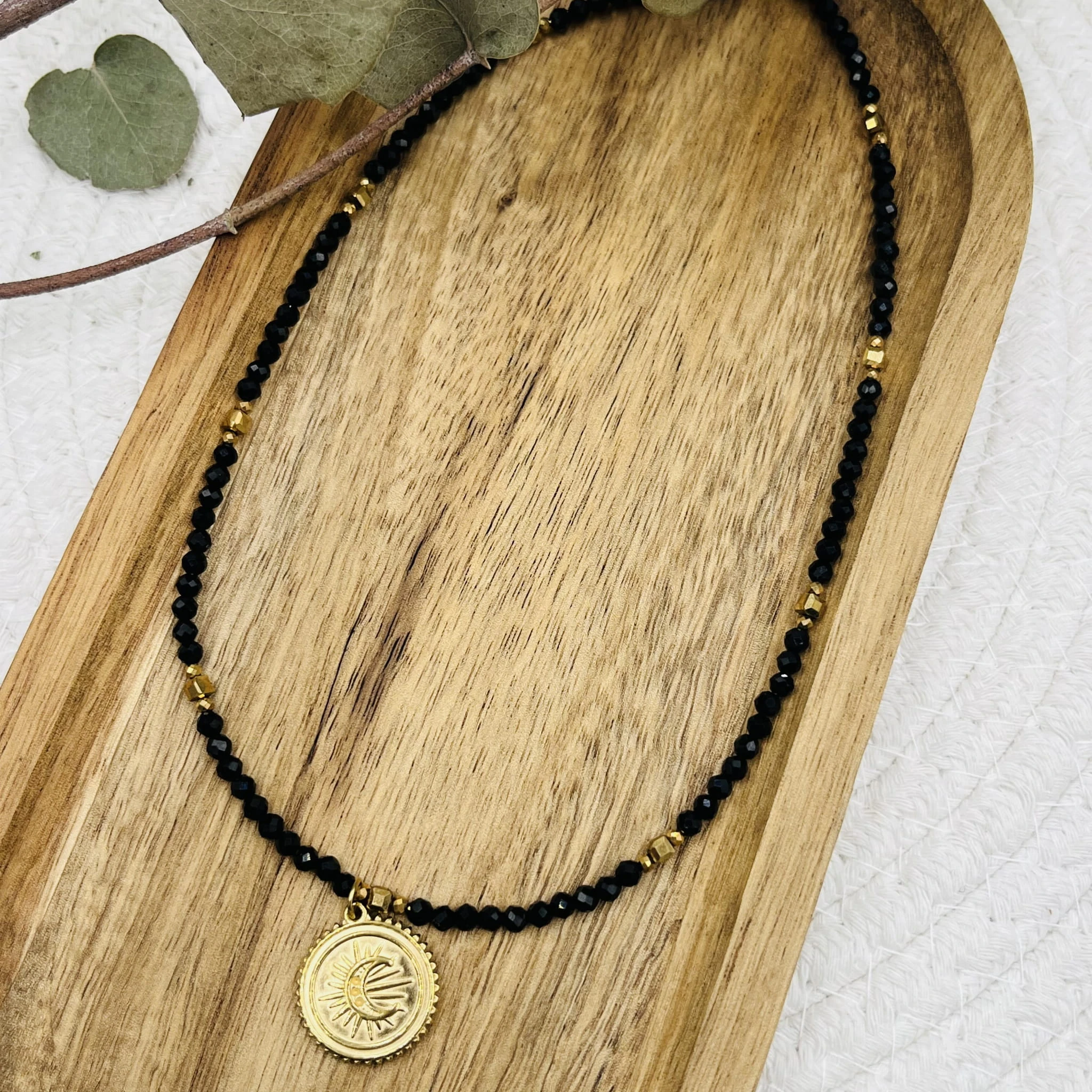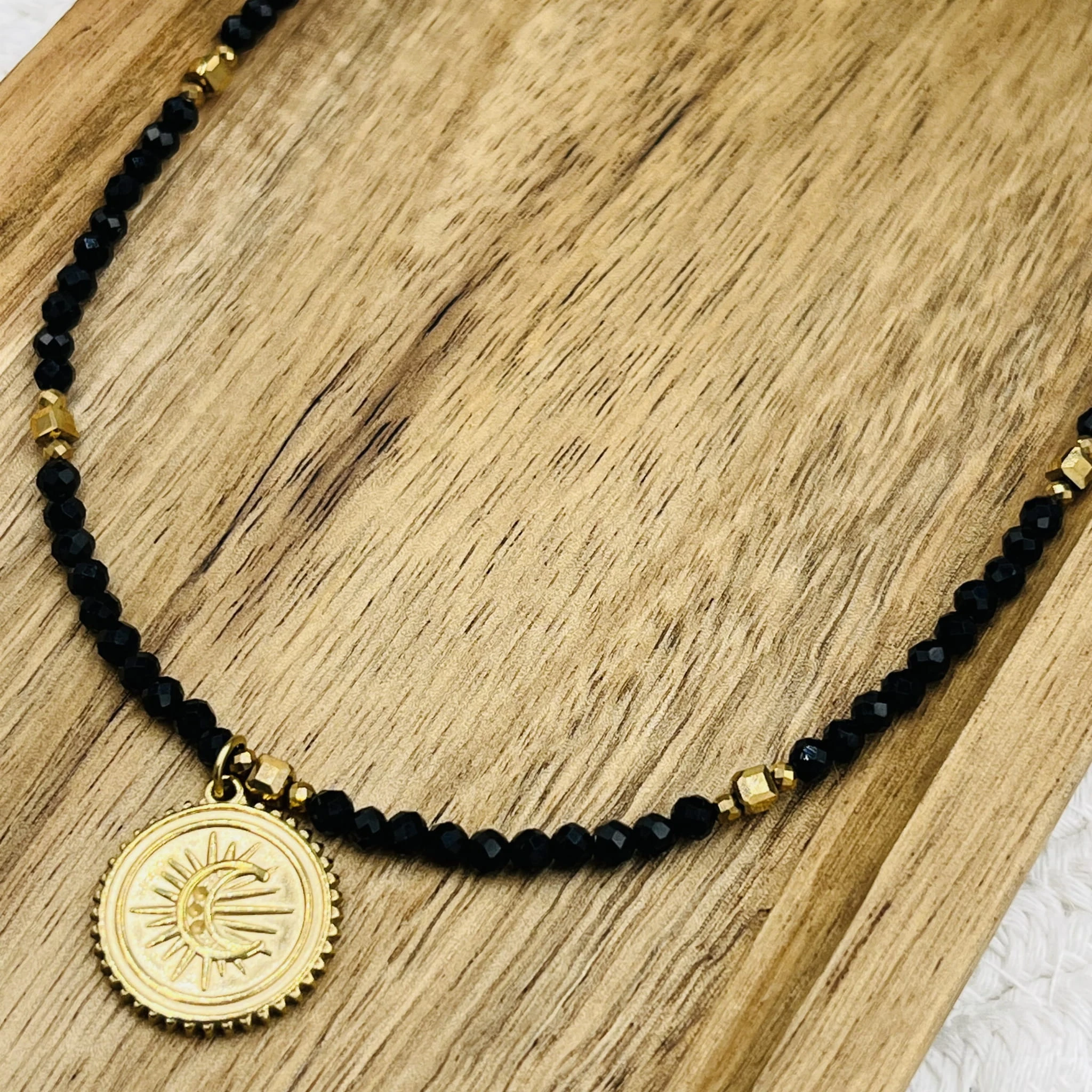 Ręcznie wykonany naszyjnik damski z fasetowanego czarnego turmalinu 3 mm, złotego hematytu 1,5 mm oraz hematytu w formie kostki 2 mm. Uzupełniony zawieszką księżyc ze stali chirurgicznej w kolorze złotym, wykonany na metalowej żyłce.