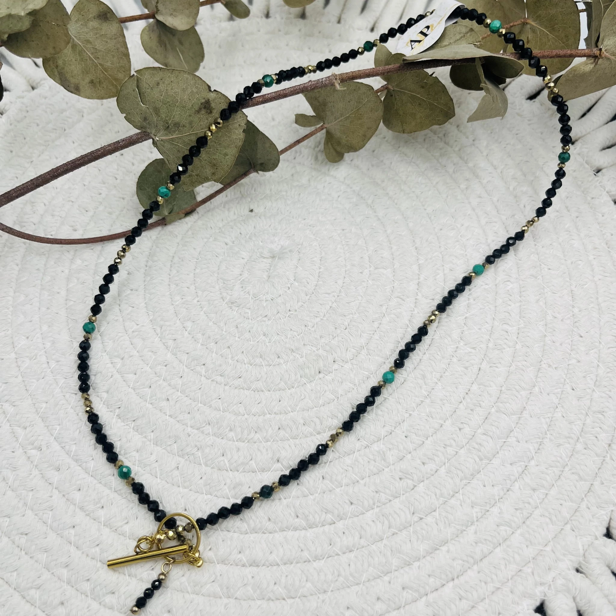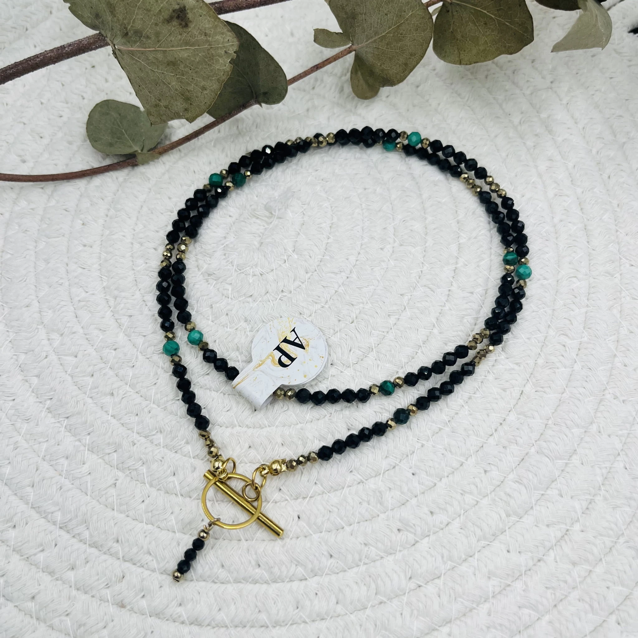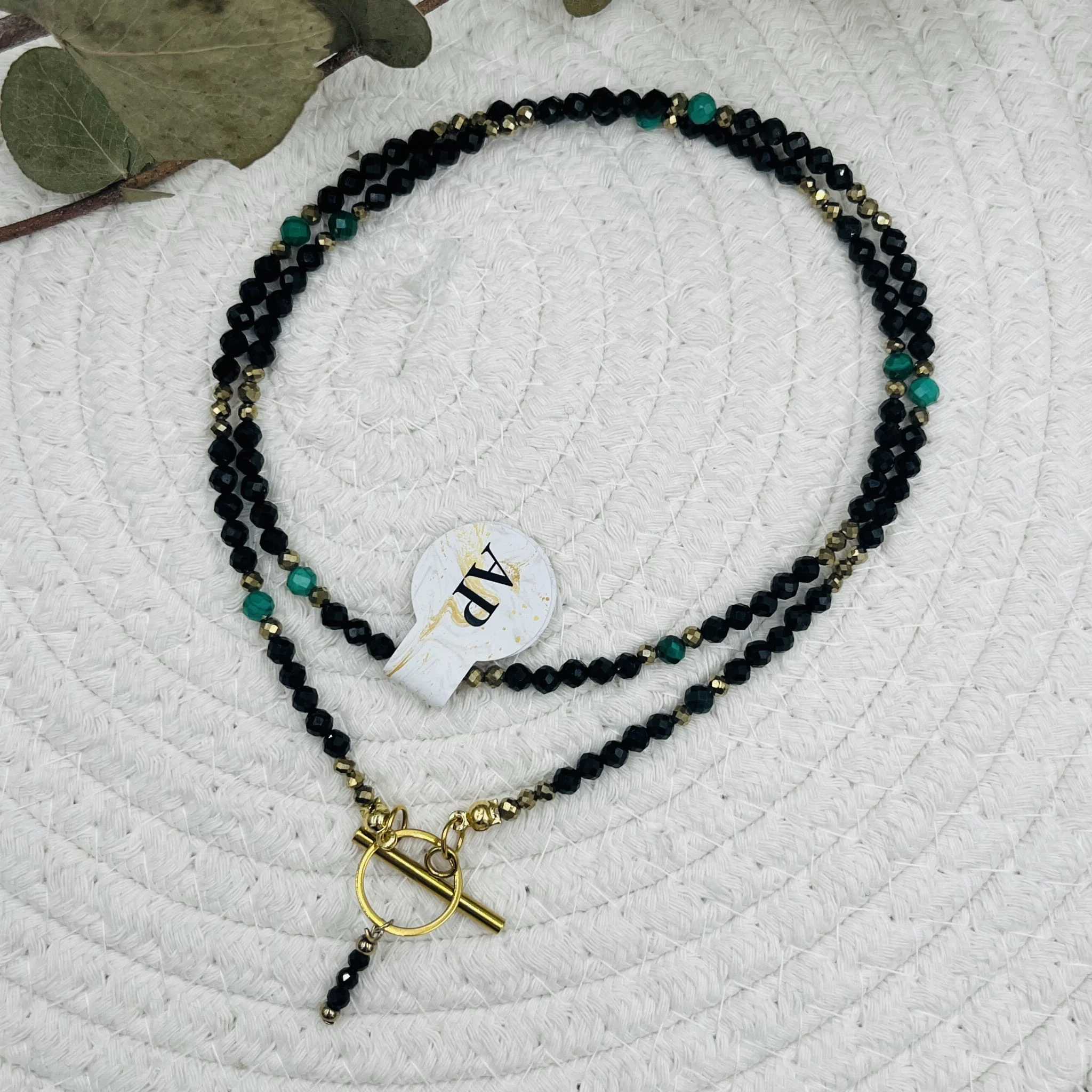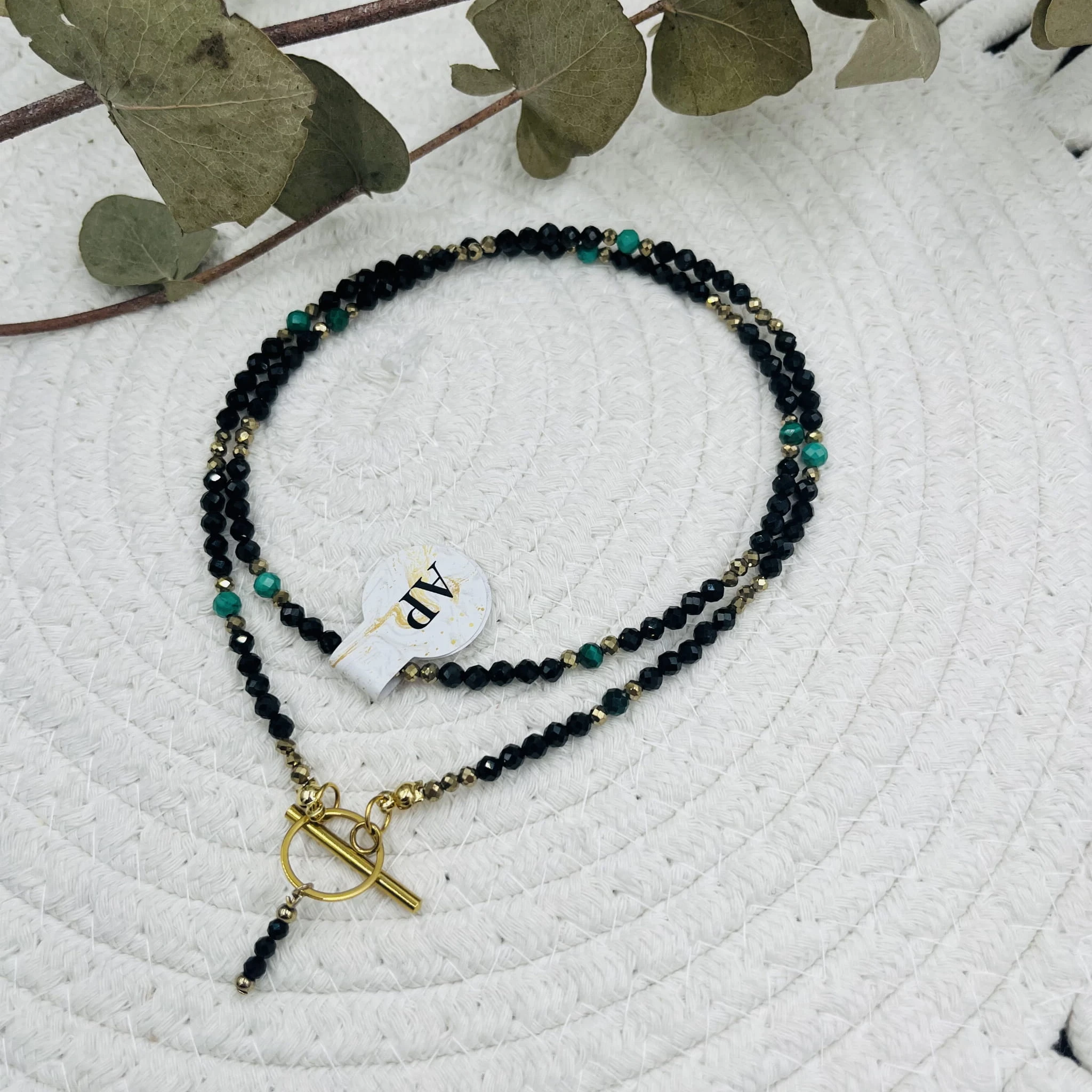 Ręcznie wykonany naszyjnik damski z fasetowanego czarnego turmalinu 4 mm, fasetowanego malachitu 4 mm oraz złotego hematytu 3 mm. Uzupełniony drobną zawieszką z czarnego turmalinu.