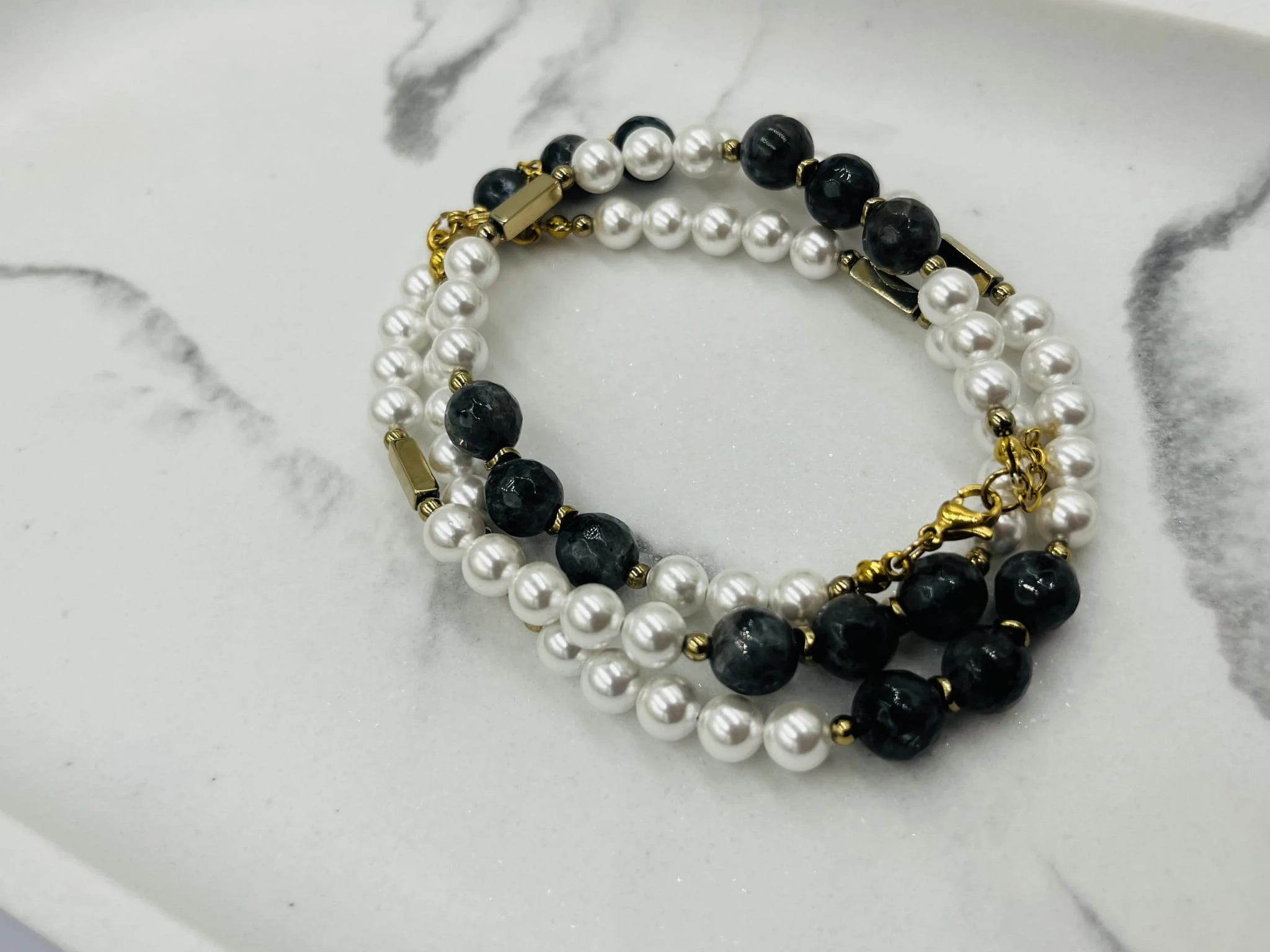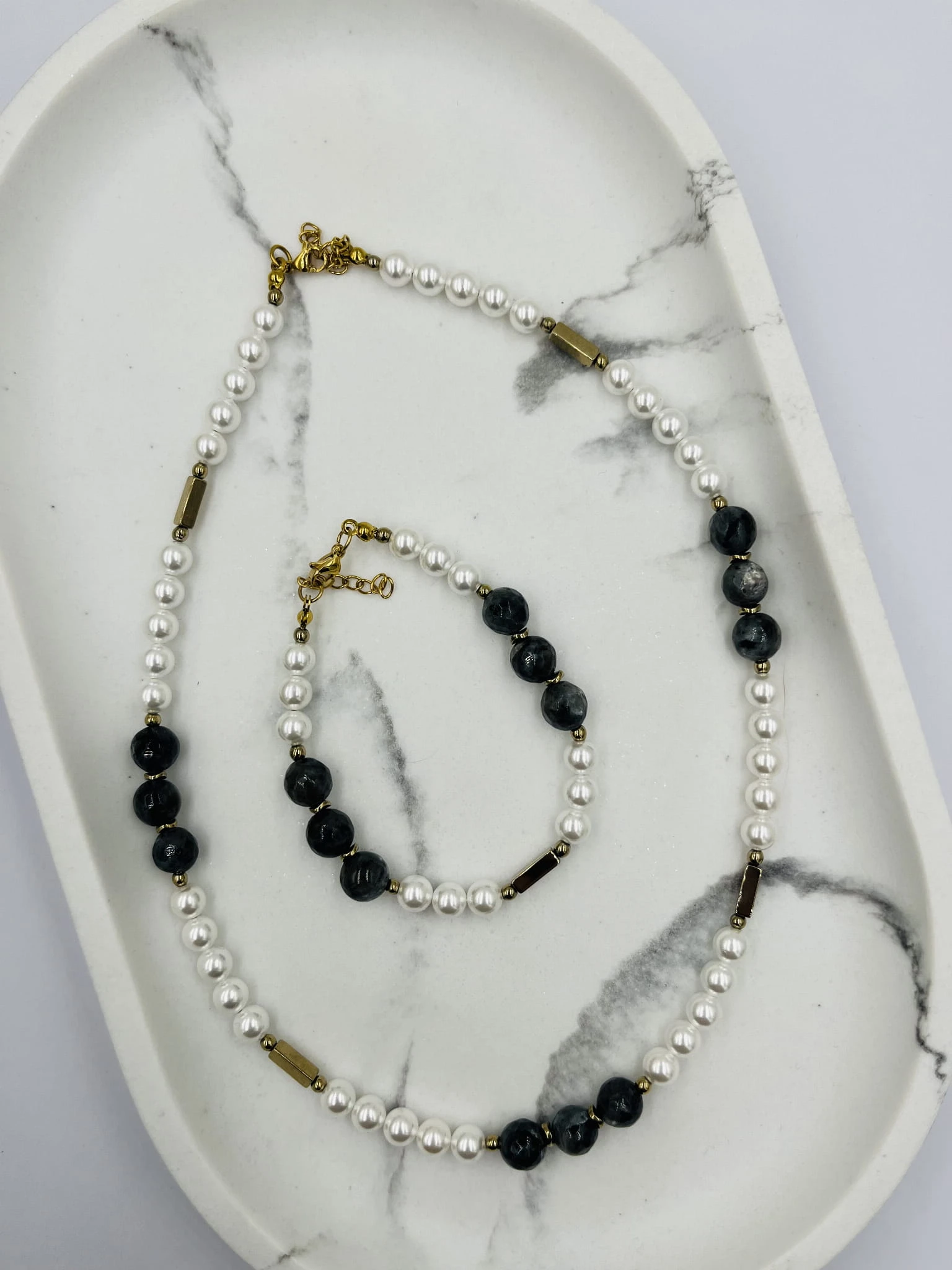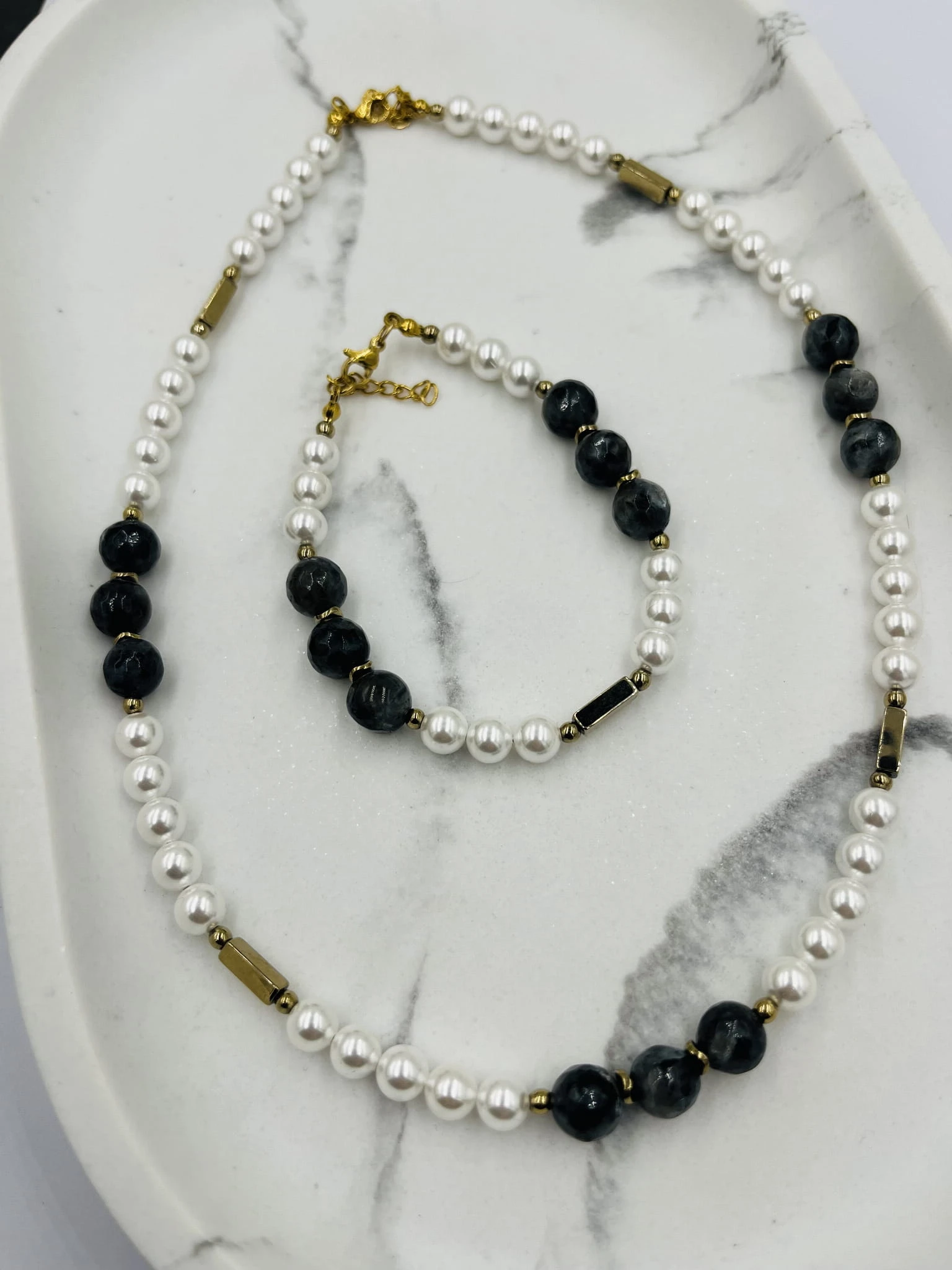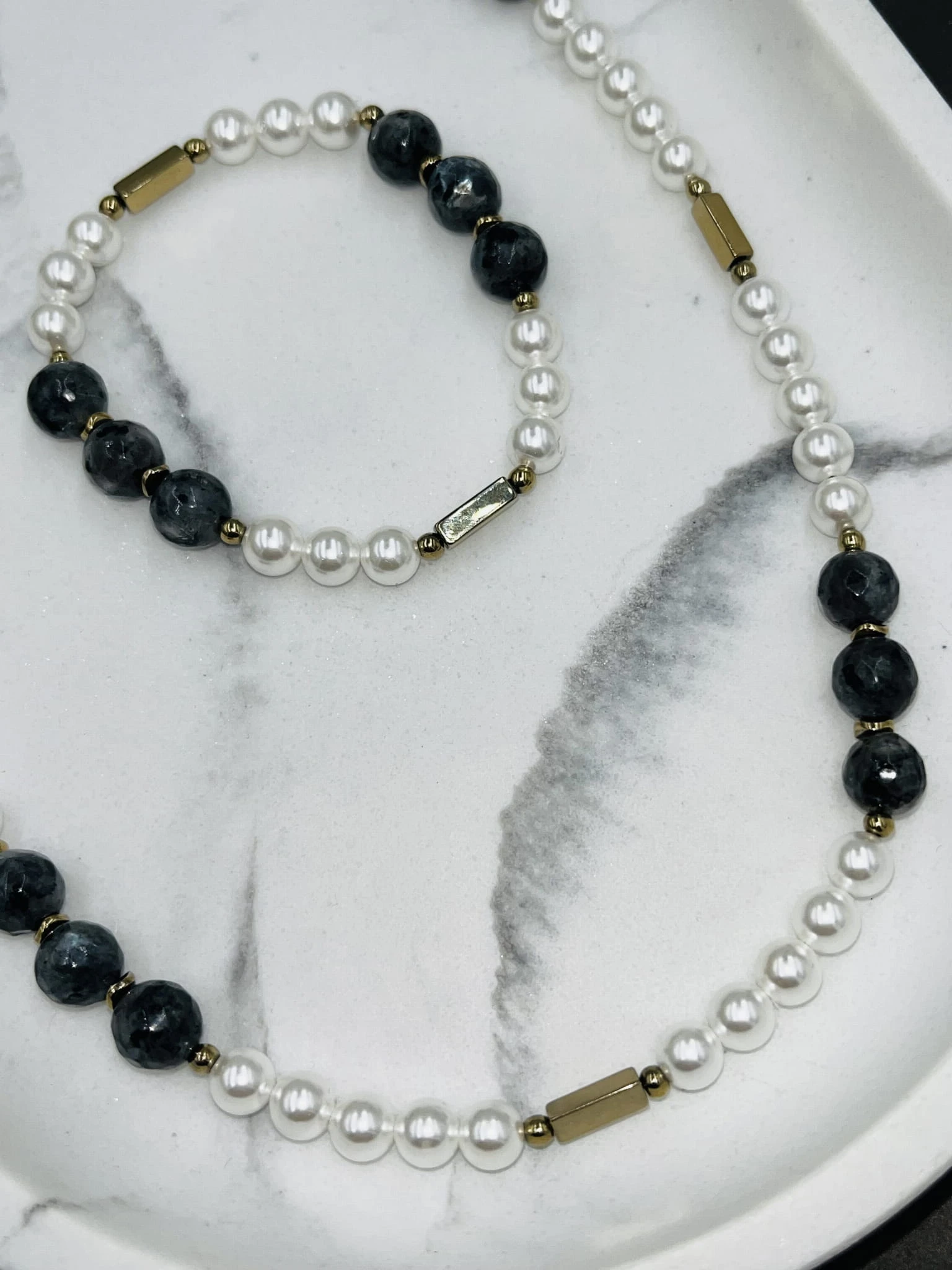 Ręcznie wykonany komplet biżuterii składający się z naszyjnika i bransoletki z perły Majorka, labradorytu oraz złotego hematytu. Spójna, elegancka forma łącząca klasyczną perłę z naturalnym kamieniem o subtelnym połysku.