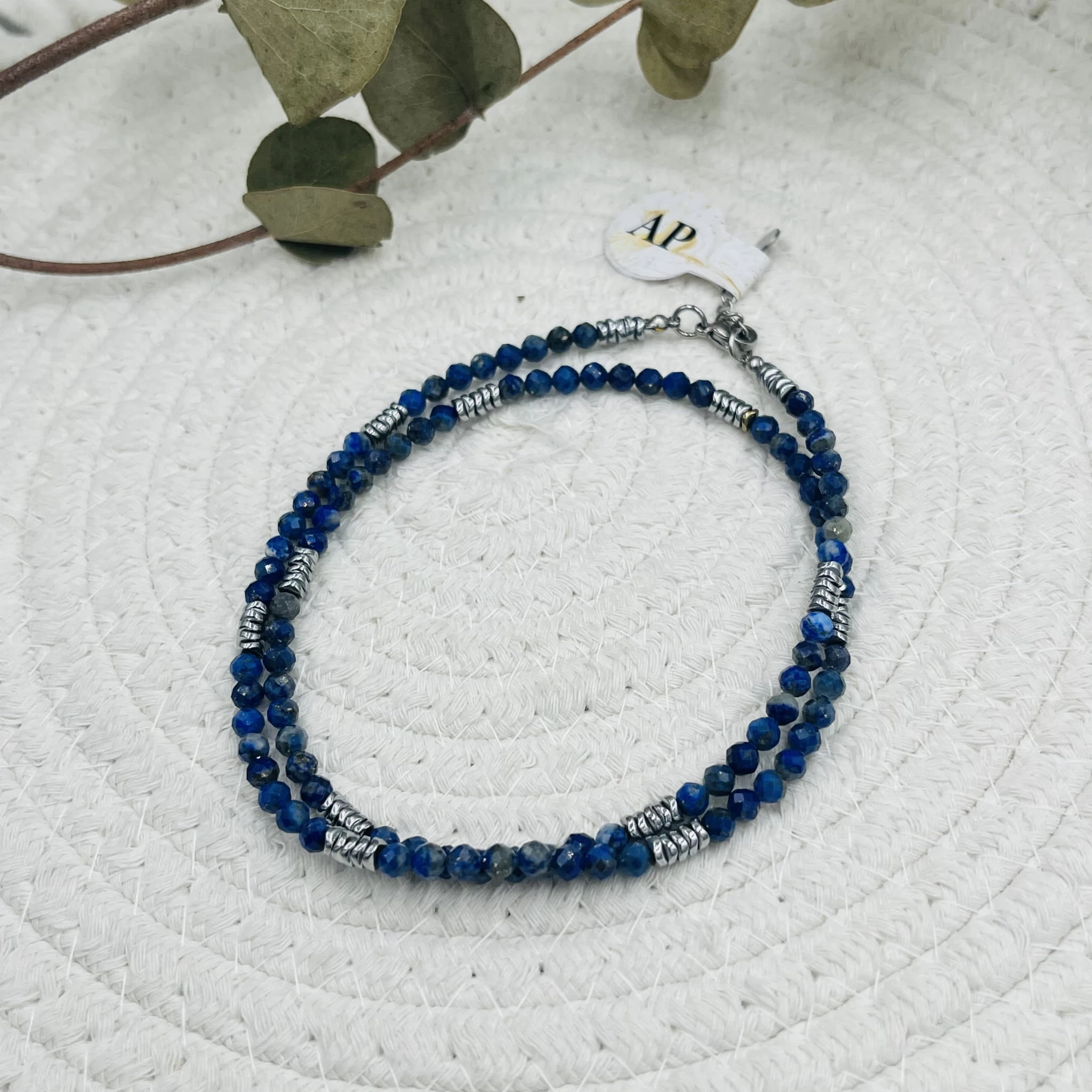 Srebrny hematyt w formie płaskich elementów wprowadza nowoczesny, metaliczny akcent, który doskonale komponuje się z chłodnym odcieniem lapis lazuli. Połączenie tych materiałów tworzy spójną i minimalistyczną kompozycję.