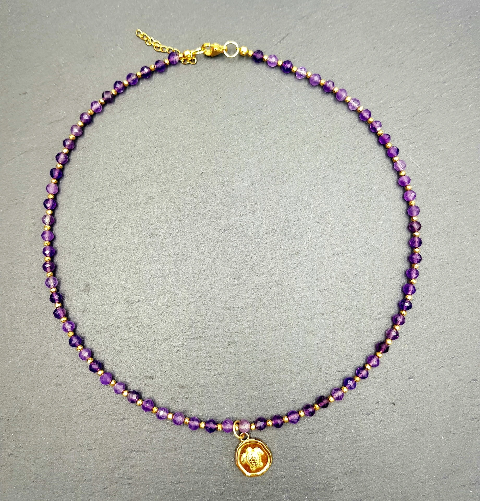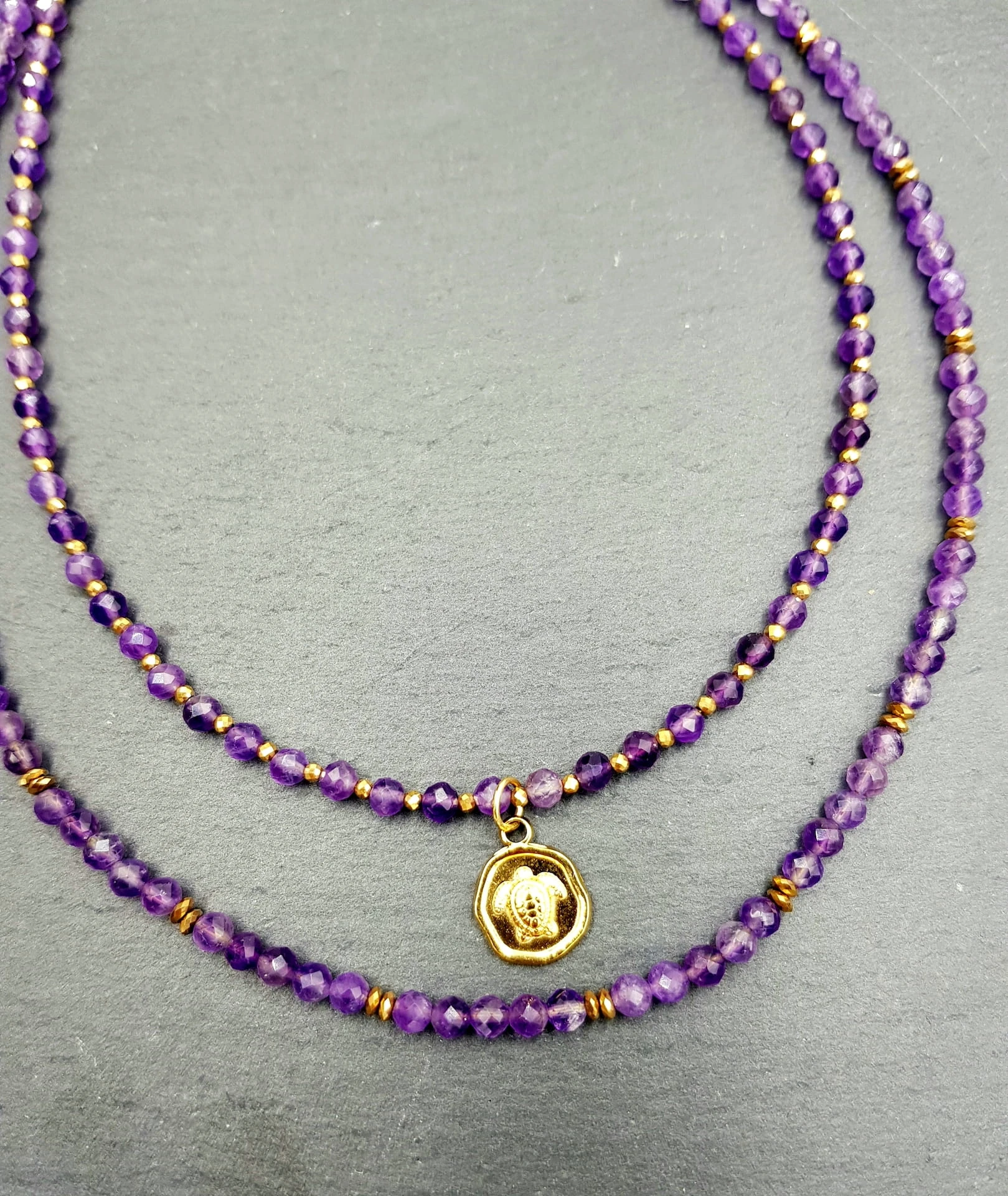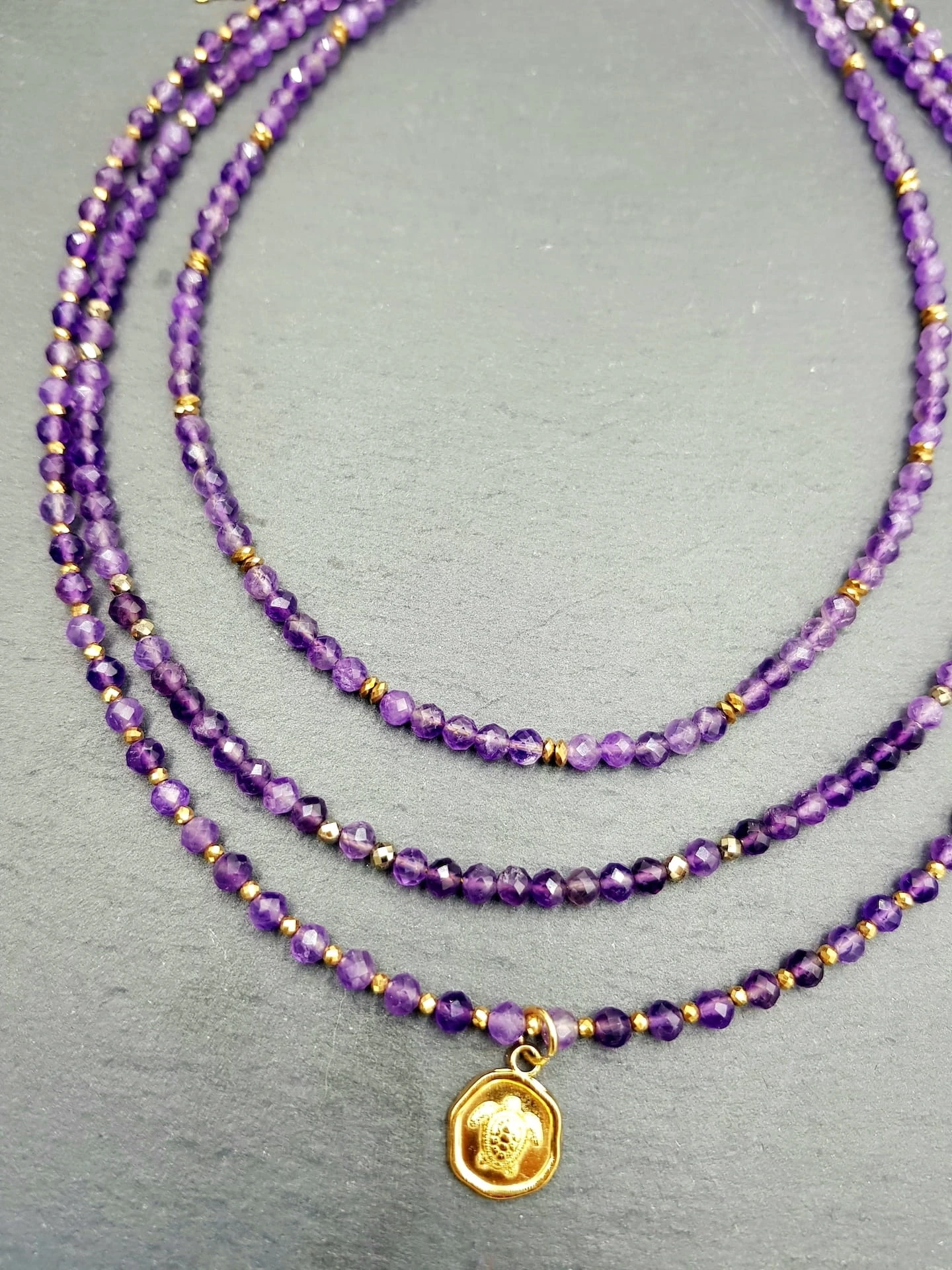 Ręcznie wykonany naszyjnik z fasetowanego ametystu, uzupełniony złotym hematytem i subtelną zawieszką w kształcie żółwia. Delikatna biżuteria z kamieni naturalnych o spokojnej, symbolicznej estetyce.