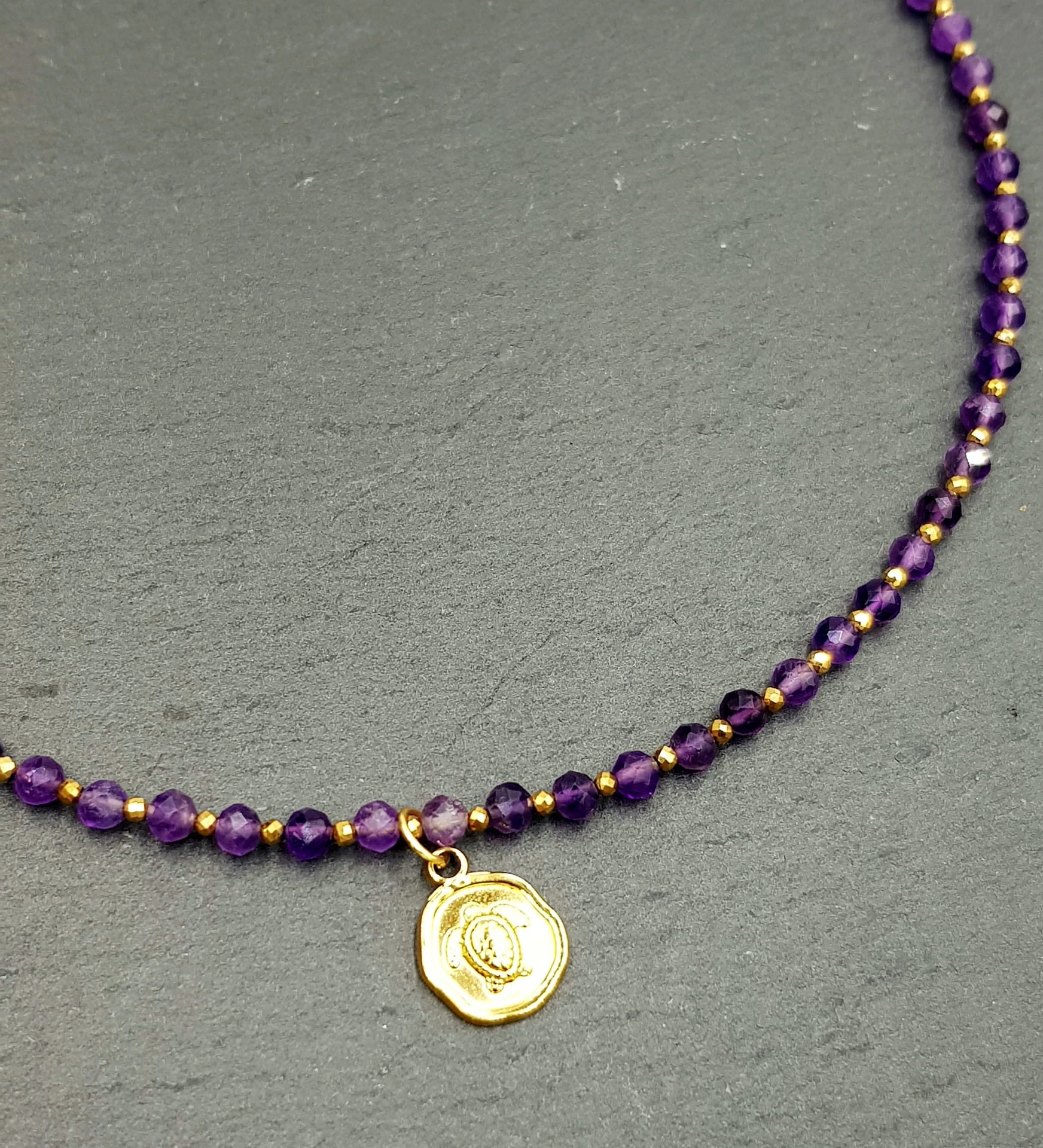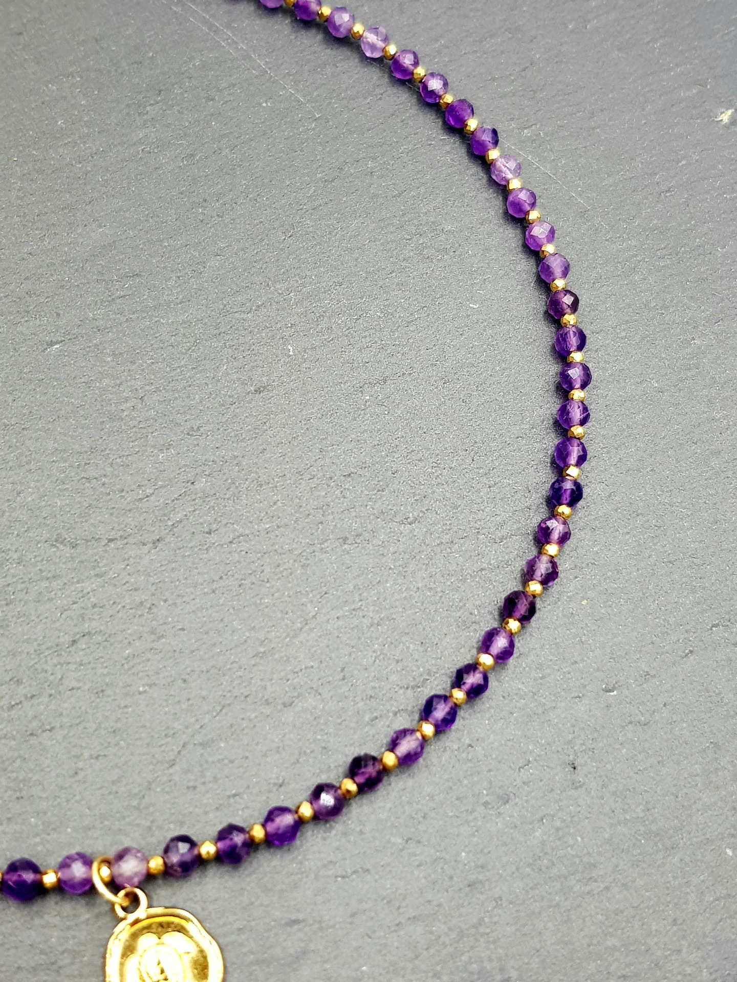 Naszyjnik z fasetowanego ametystu i zawieszką żółw to harmonijna kompozycja naturalnych kamieni i subtelnego, symbolicznego detalu. Drobne, fasetowane kamienie ametystu tworzą lekką i elegancką bazę, delikatnie odbijając światło i podkreślając głęboki, naturalny odcień fioletu.