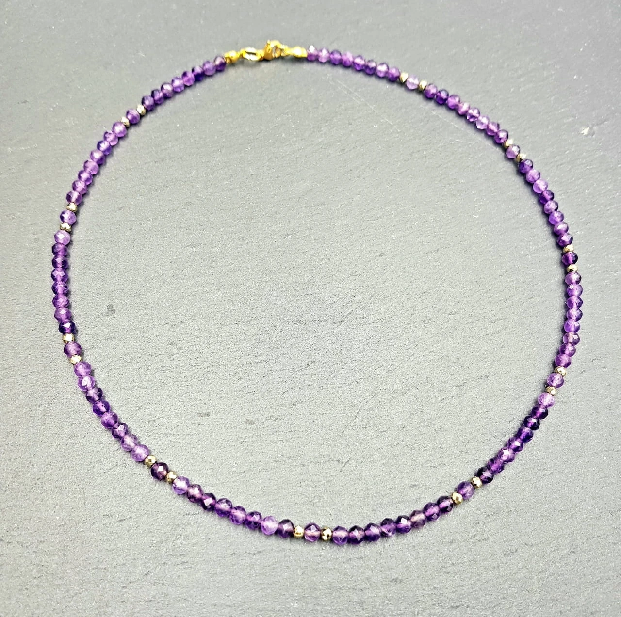 Naszyjnik z fasetowanego ametystu i złotego hematytu to delikatna kompozycja oparta na drobnych formach i harmonijnej kolorystyce. Ametyst o średnicy 4 mm, dzięki fasetowaniu, subtelnie odbija światło, nadając całości lekkości i eleganckiego charakteru. Jego głęboki, naturalny odcień fioletu tworzy spokojny kontrast z ciepłym blaskiem złotego hematytu.