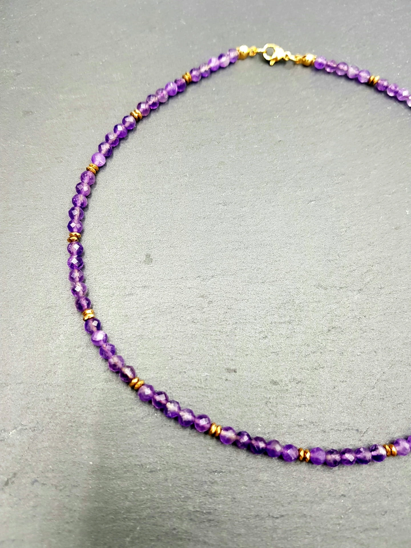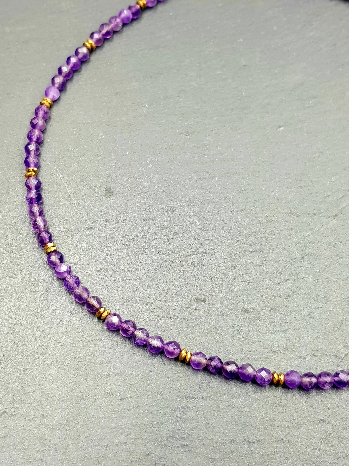 Ręcznie wykonany naszyjnik z fasetowanego ametystu, uzupełniony płaskimi elementami hematytu w złotym odcieniu. Subtelna biżuteria z kamieni naturalnych o spokojnej, eleganckiej estetyce, zaprojektowana do codziennego noszenia.