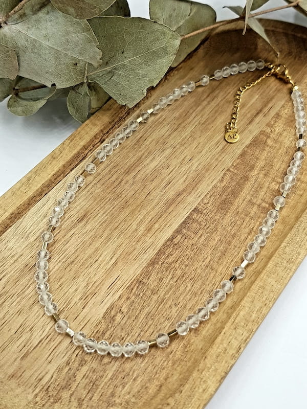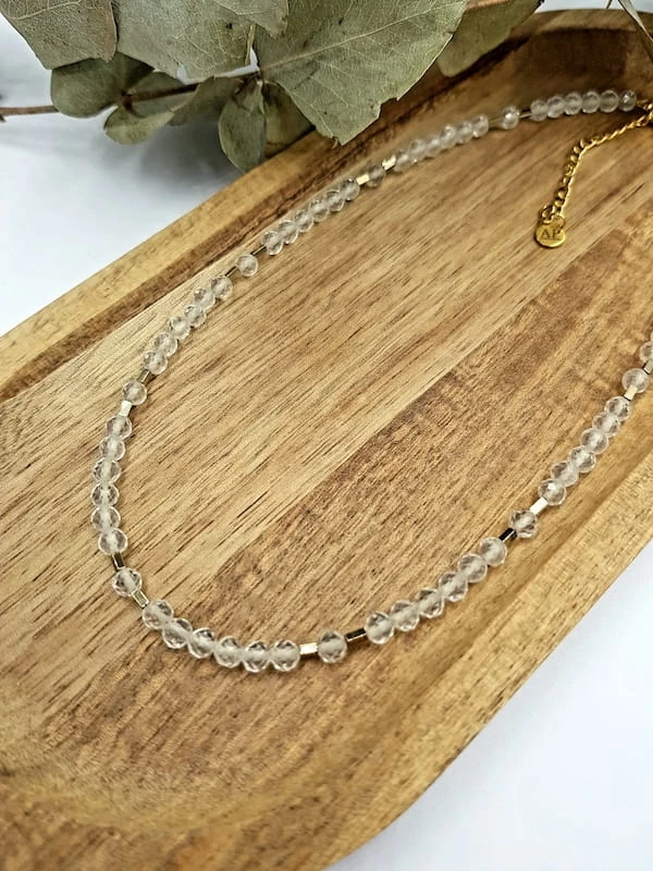 Naszyjnik z fasetowanym kryształem górskim i hematytem to minimalistyczna kompozycja oparta na czystej formie i naturalnych materiałach. Regularne, fasetowane kulki kryształu górskiego o średnicy 4 mm nadają całości lekkości i delikatnego blasku, natomiast prostokątne elementy hematytu w złotym kolorze wprowadzają subtelny, geometryczny akcent.