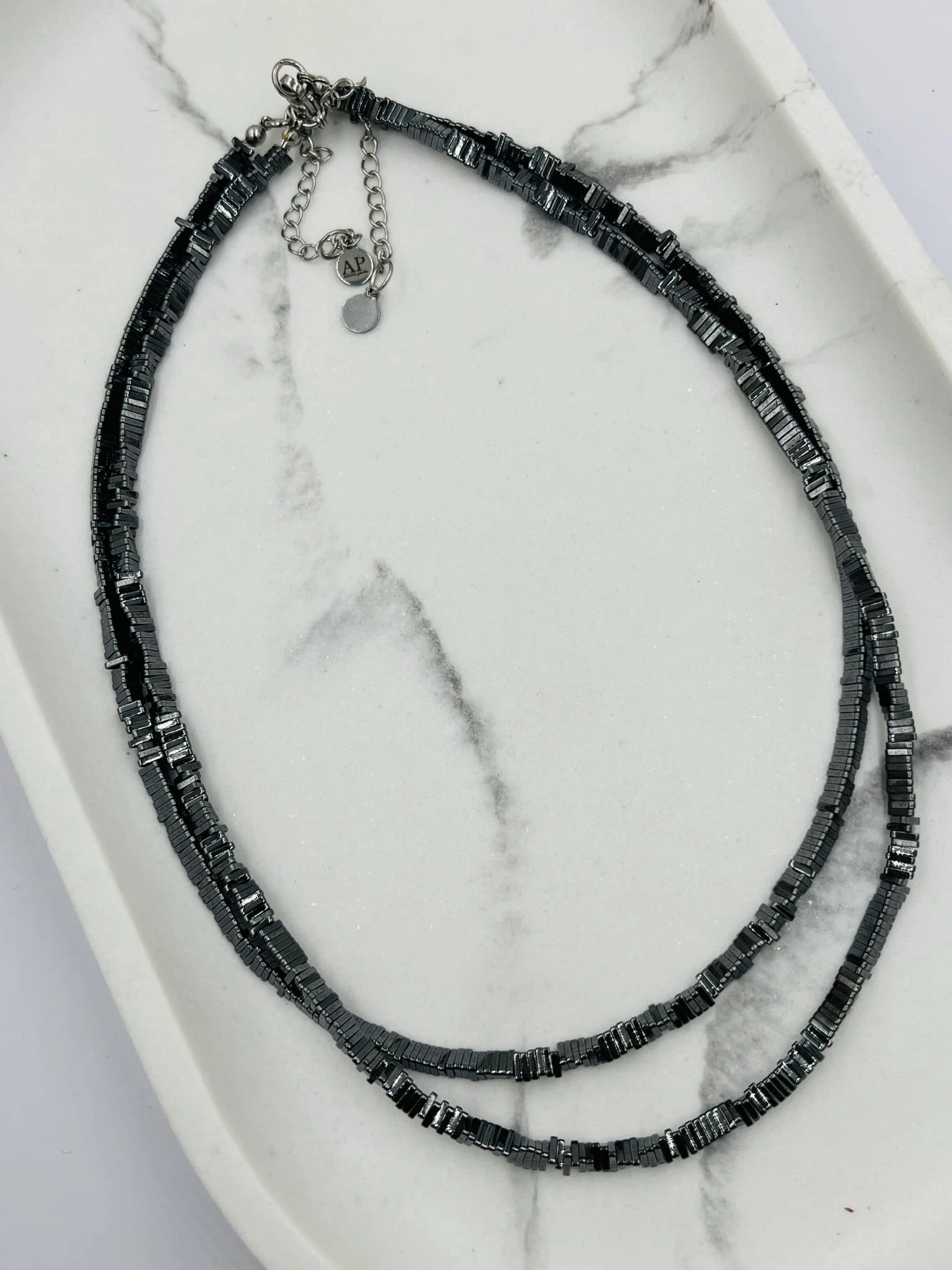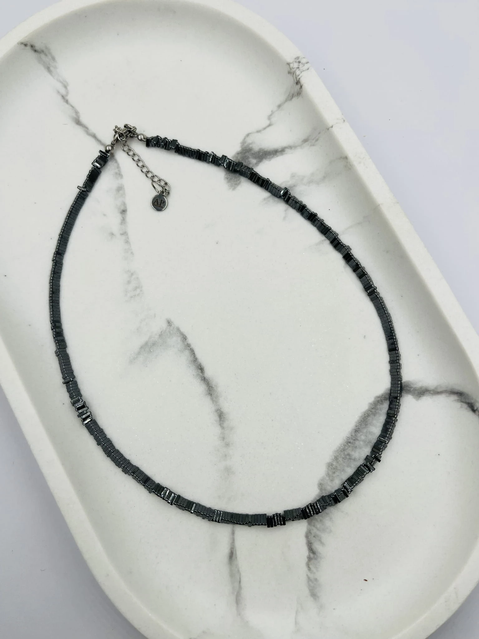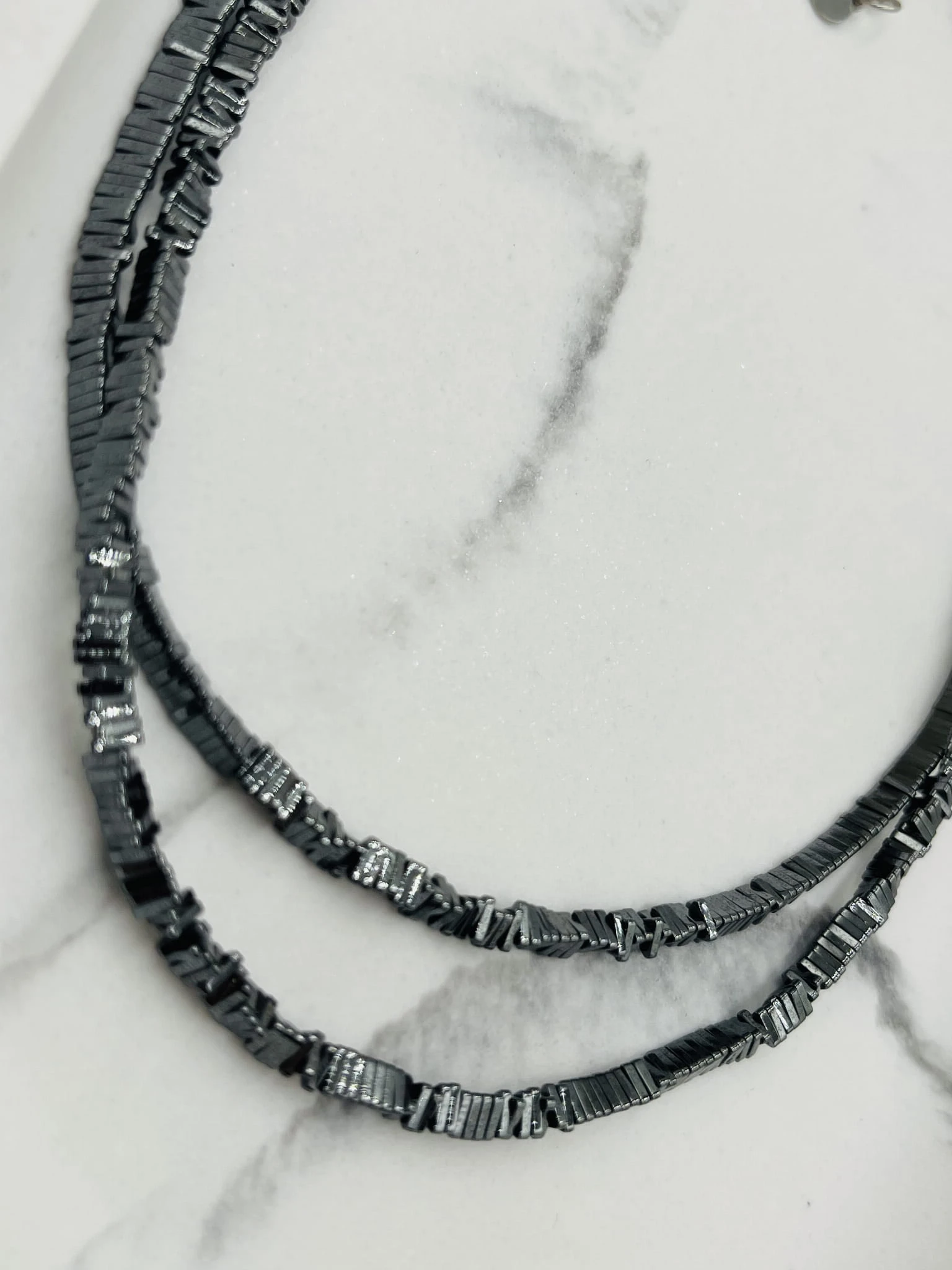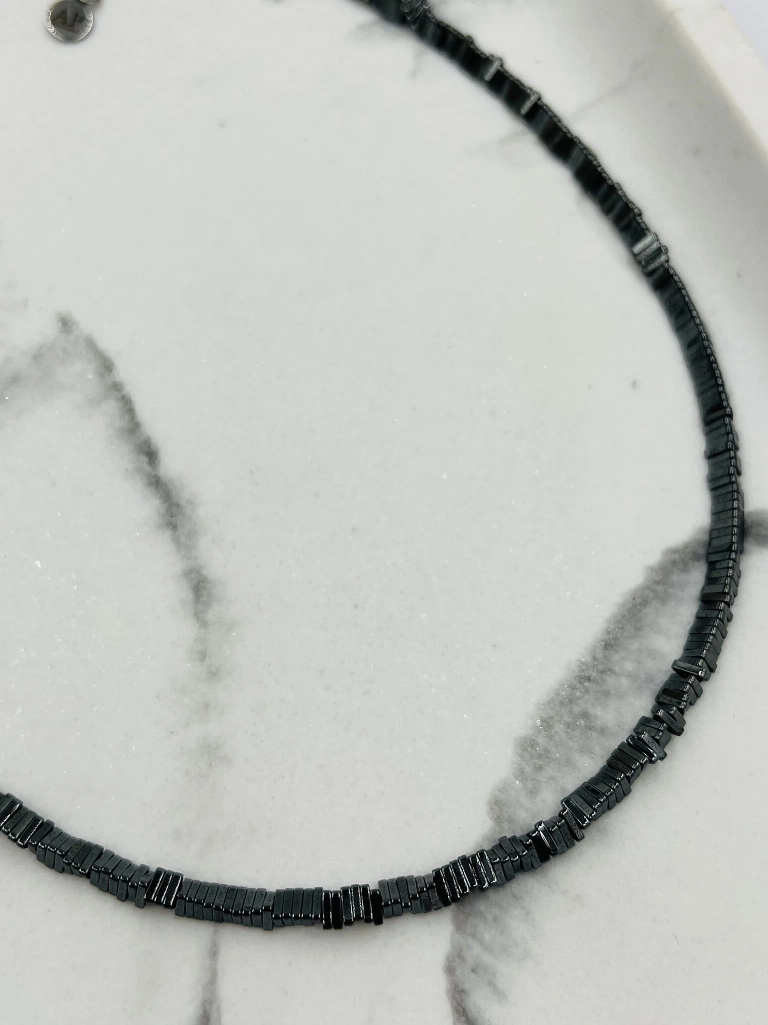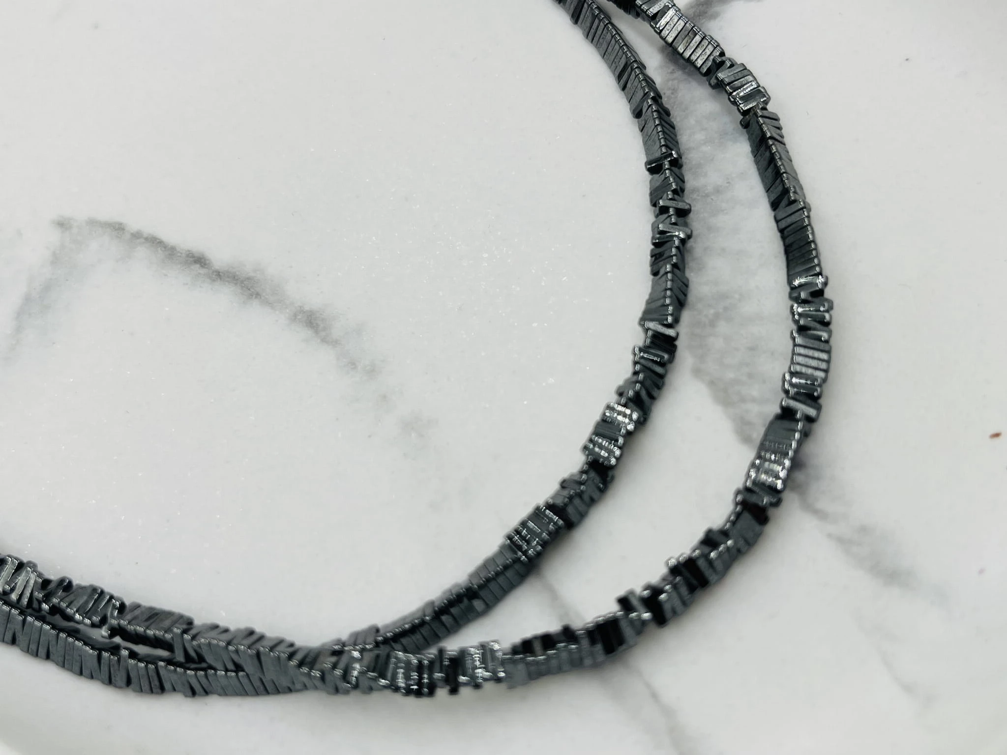 Naszyjnik z grafitowego hematytu to elegancka, minimalistyczna forma inspirowana płynną linią i ruchem. Płaskie dyski układają się w spójną strukturę, tworząc subtelne złudzenie falowania i pracy światła na powierzchni kamieni.