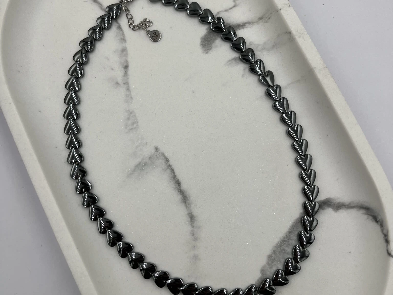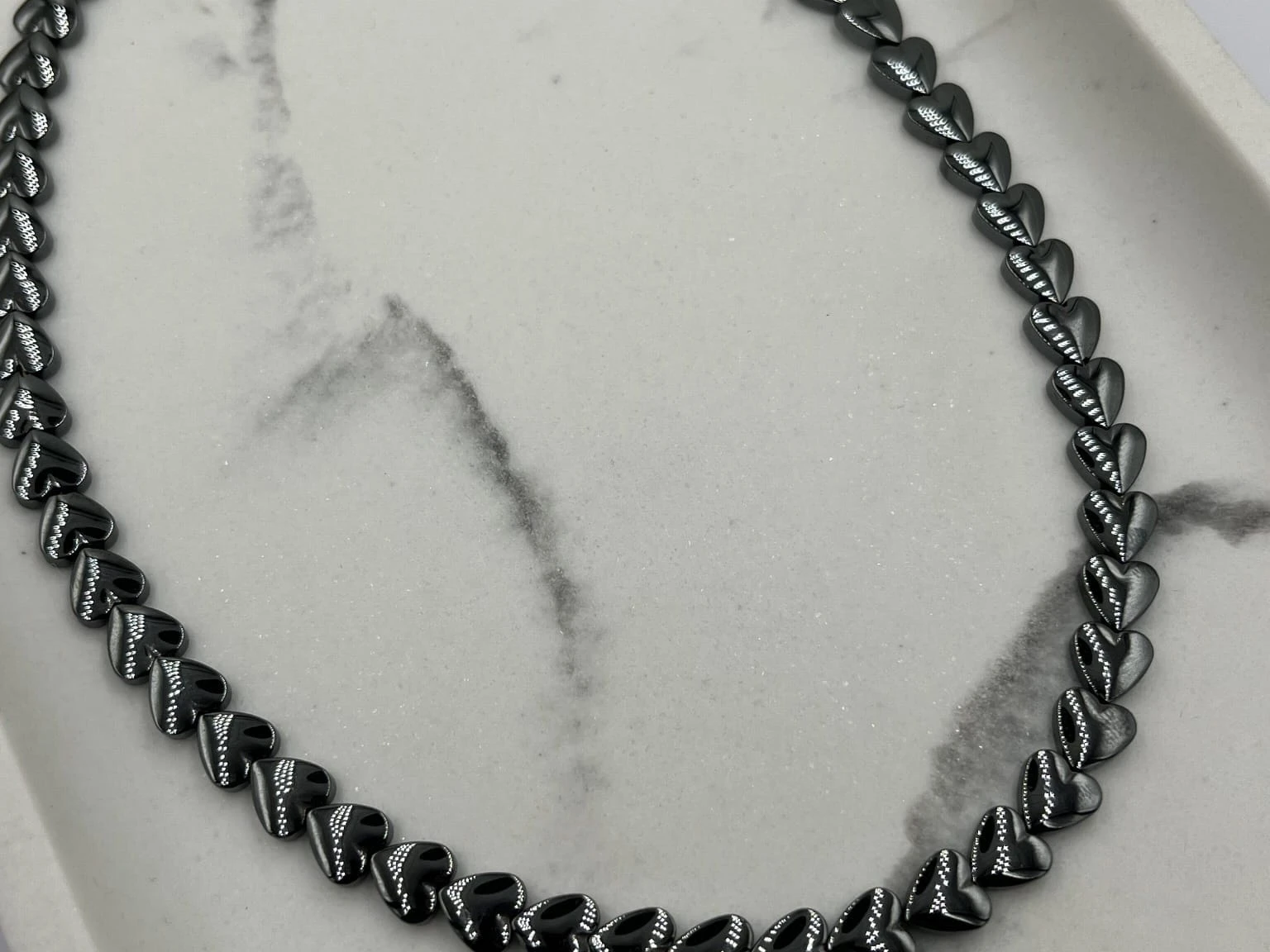 Naszyjnik z grafitowego hematytu w kształcie serc to nowoczesna odsłona biżuterii z symbolicznym motywem. Wyraźnie zaznaczone serca tworzą rytmiczną linię, która przyciąga uwagę spokojnym połyskiem i uporządkowaną formą.