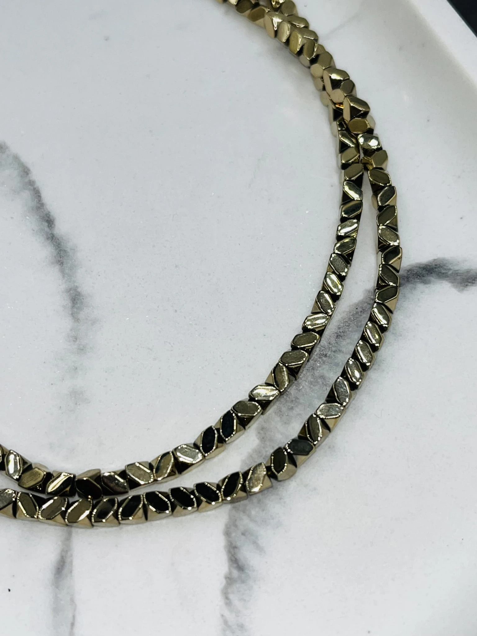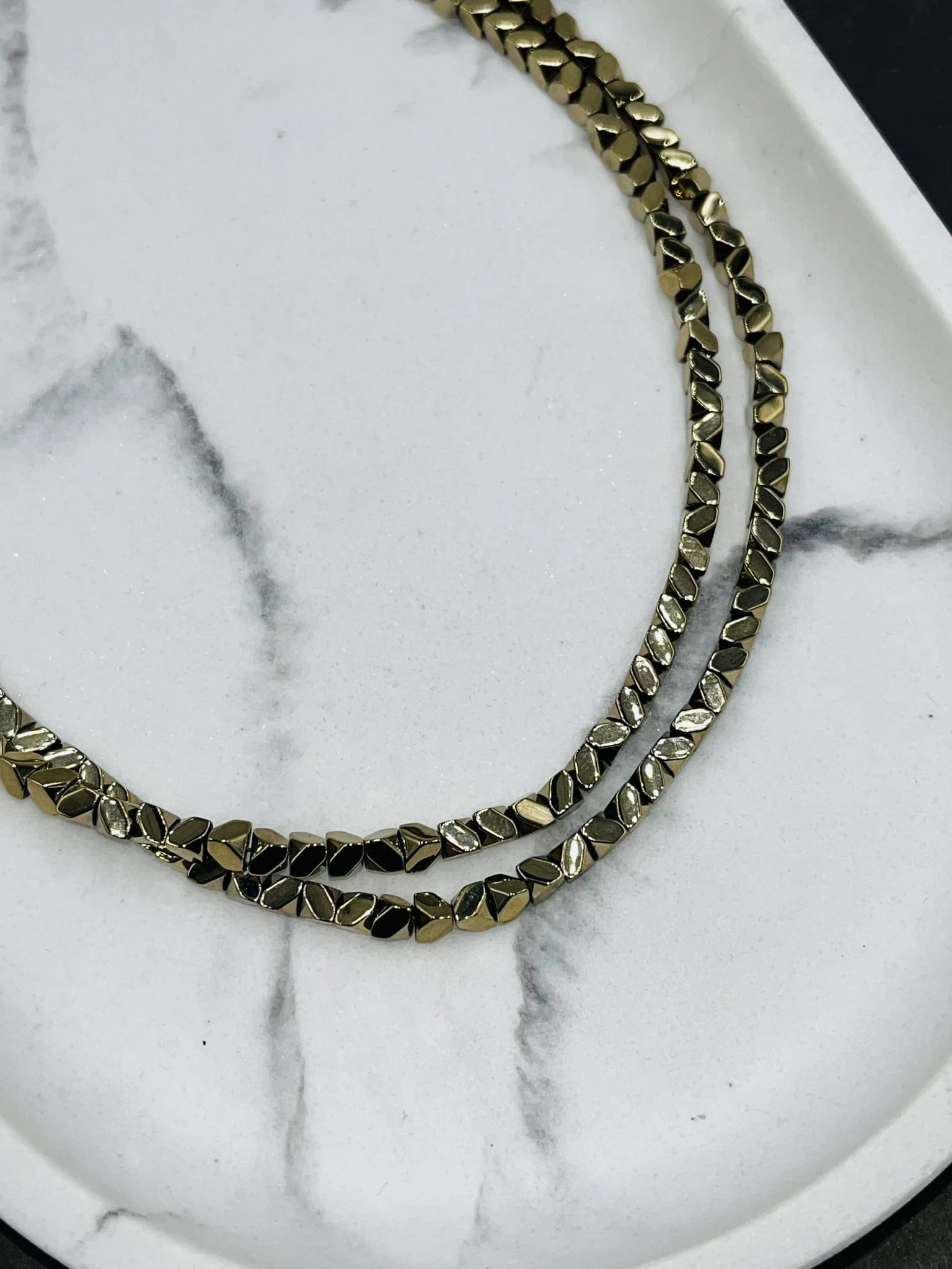 Naszyjnik z hematytu w kształcie ściętej kostki to propozycja dla osób ceniących geometryczną biżuterię o uporządkowanej formie. Regularny, powtarzalny kształt elementów tworzy spójną linię, która subtelnie odbija światło i nadaje całości nowoczesnego charakteru.
