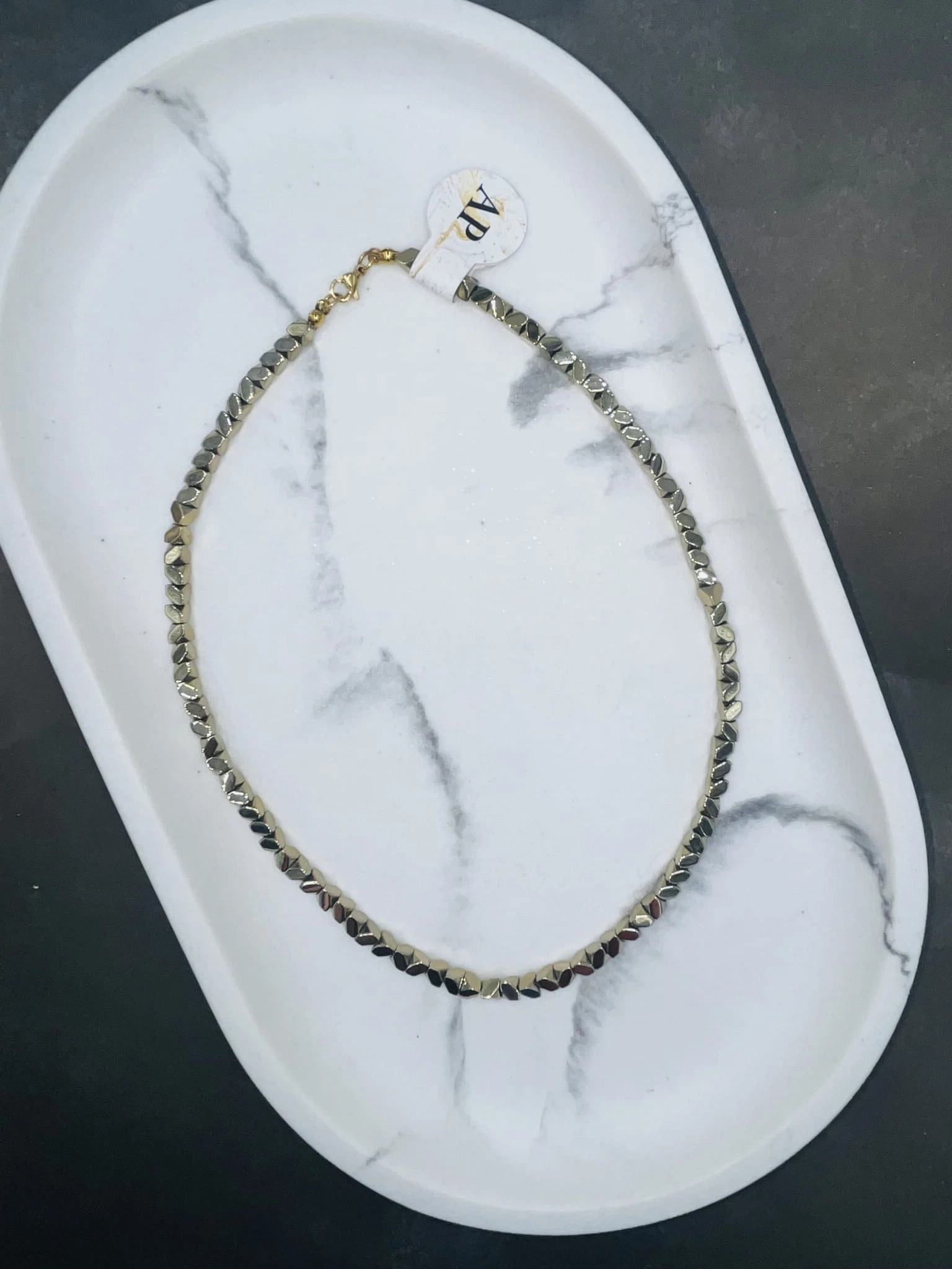 Ręcznie wykonany naszyjnik z hematytu w kolorze złotym, o geometrycznej formie inspirowanej kształtem ściętej kostki. Minimalistyczna biżuteria o wyraźnym, nowoczesnym charakterze, która łączy prostotę formy z eleganckim połyskiem.