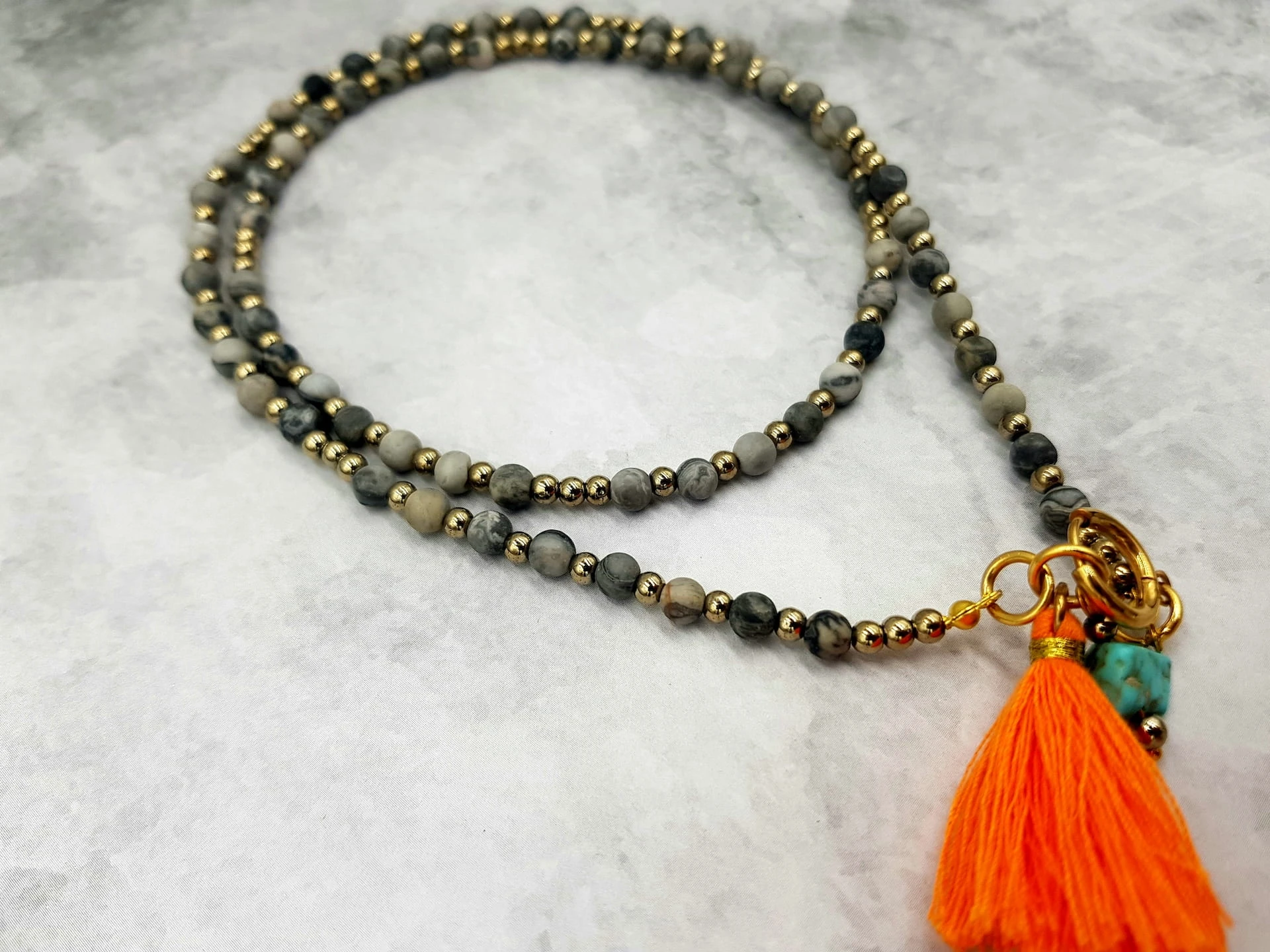 Ręcznie wykonany naszyjnik z jaspisu Picasso, złotego hematytu i nieregularnego turkusu, uzupełniony wyrazistym chwostem w kolorze intensywnego pomarańczu. Naturalna biżuteria o artystycznym, a jednocześnie wyważonym charakterze.