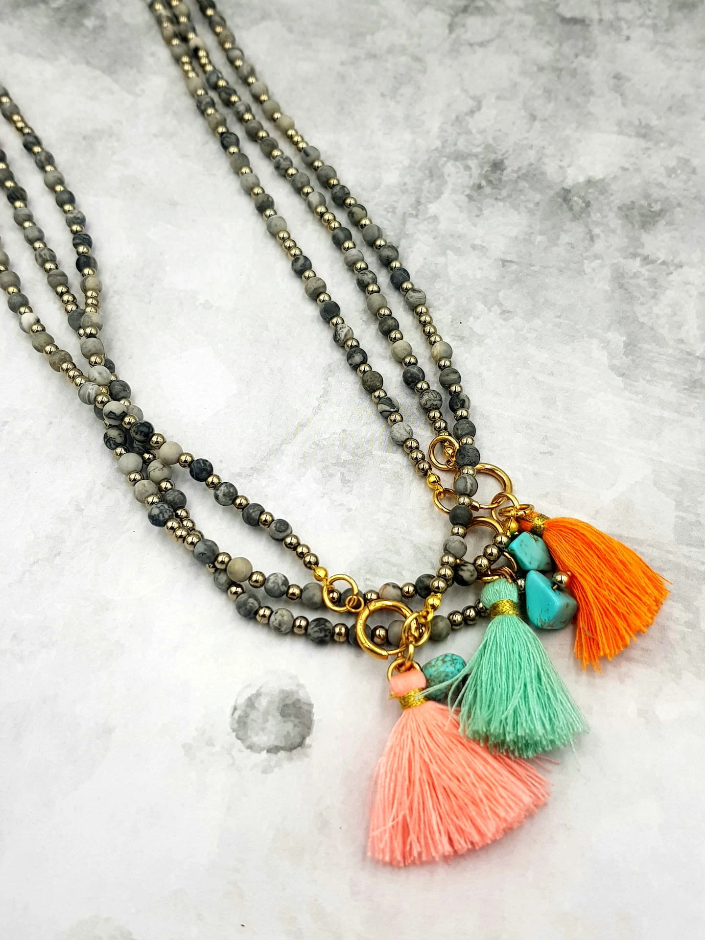 Naszyjnik z jaspisu Picasso, turkusu i chwostem w odcieniu pomarańczowym