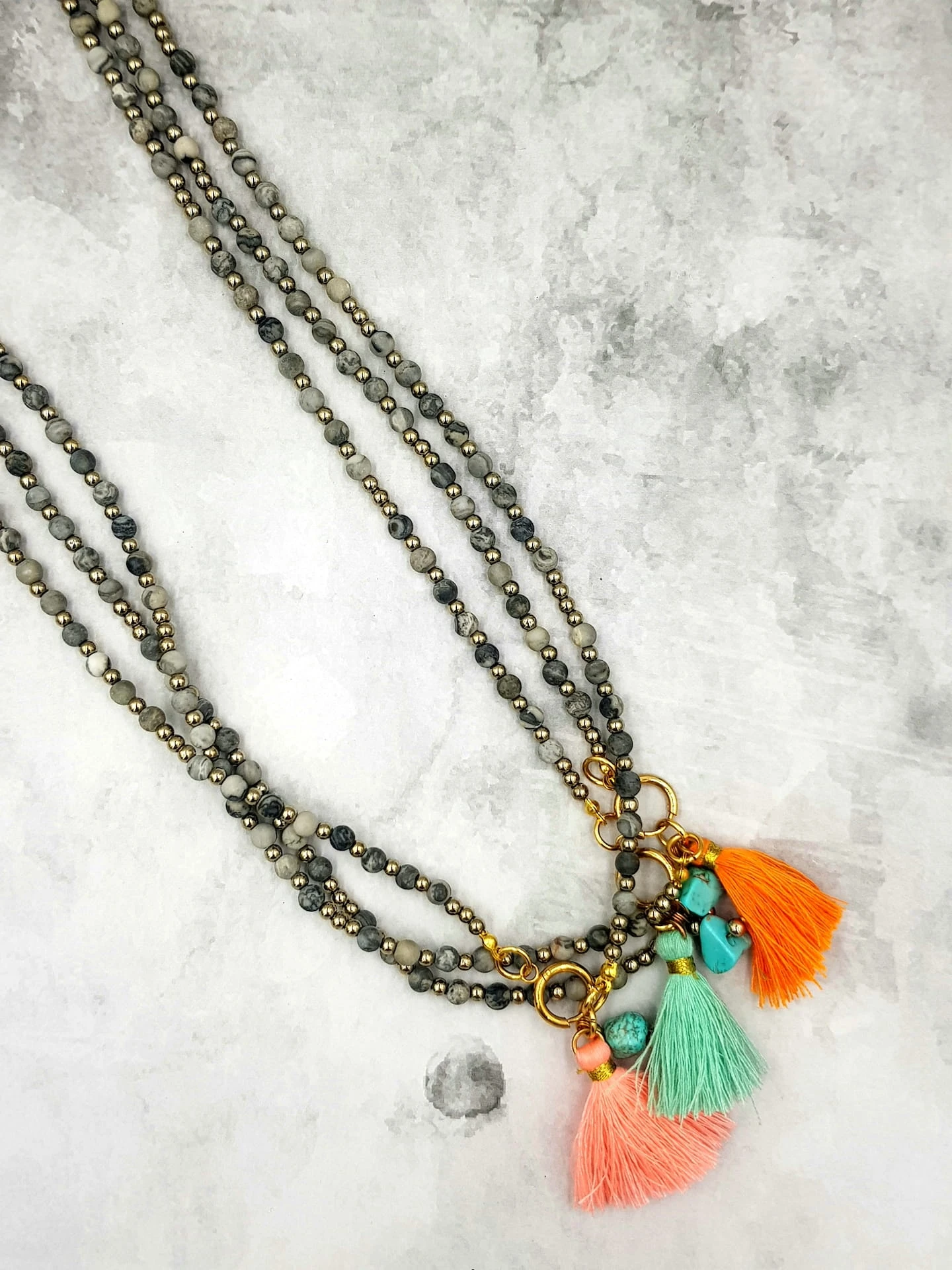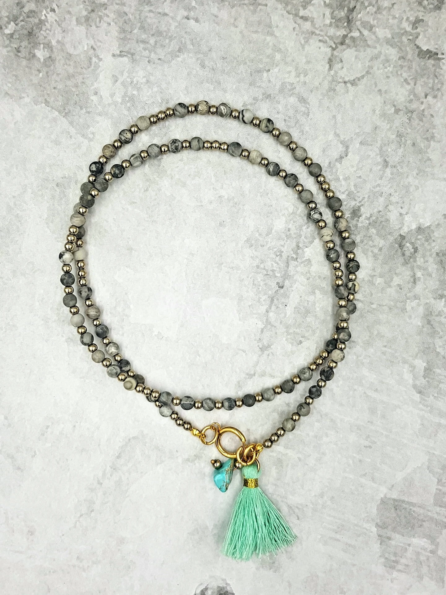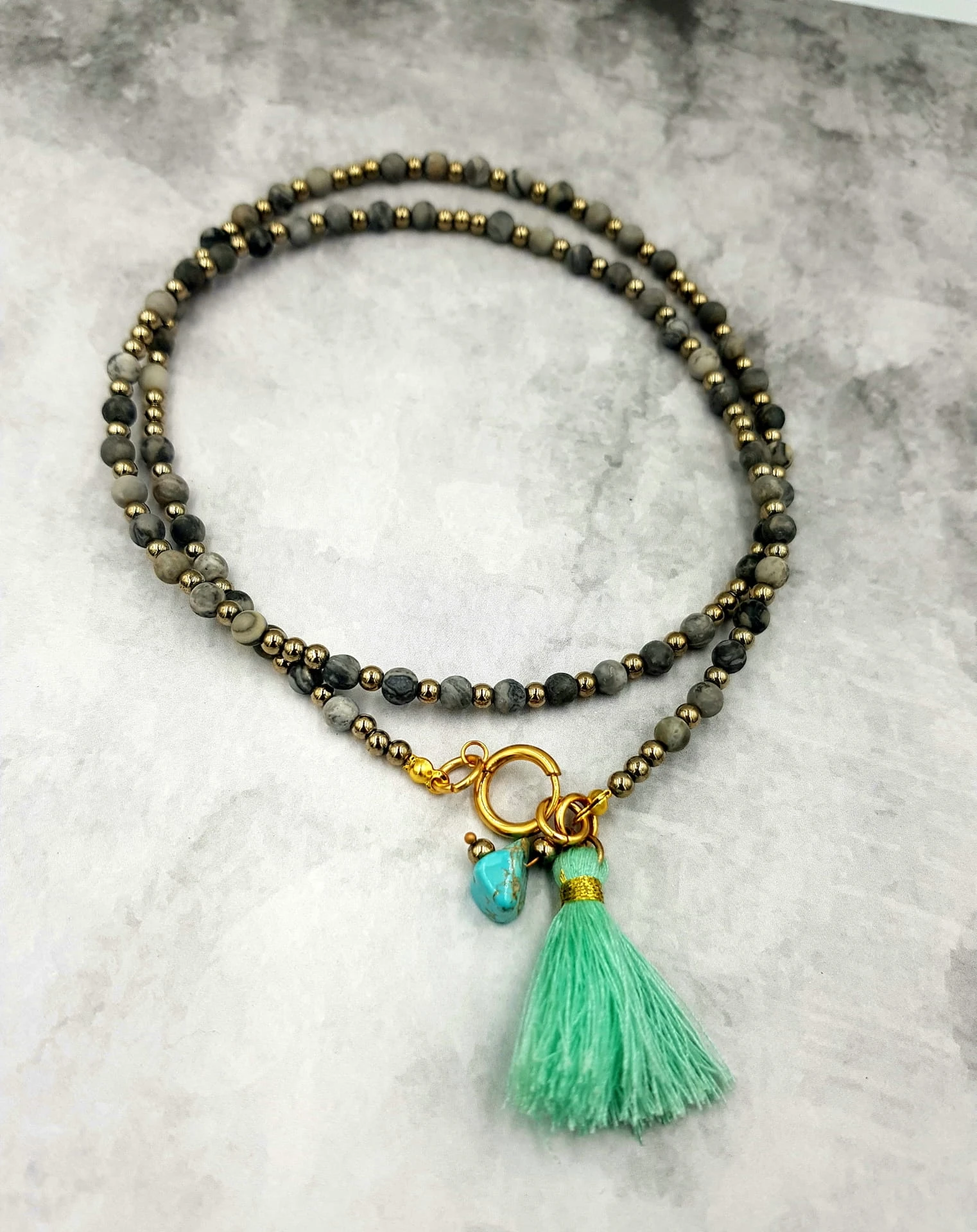 Naszyjnik z jaspisu Picasso, turkusu i chwostem w odcieniu turkusu
