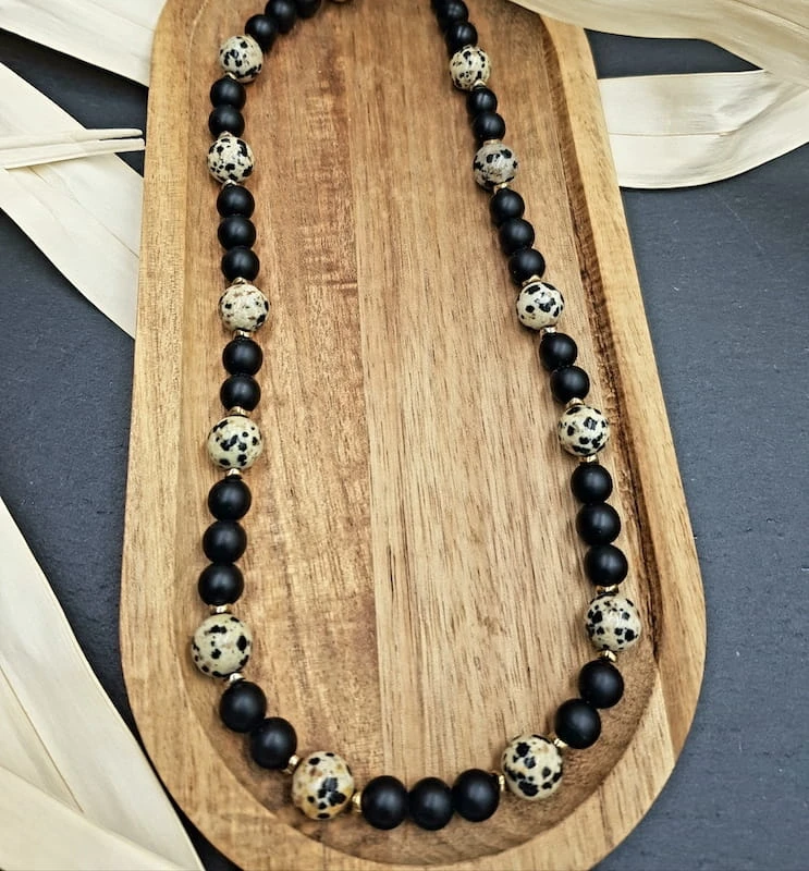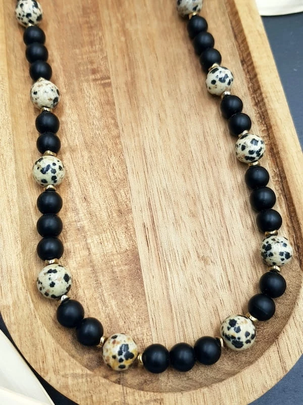 Naszyjnik z jaspisu dalmatyńskiego, lawy wulkanicznej i złotego hematytu to harmonijna kompozycja oparta na kontrastach wielkości i naturalnych faktur. Gładkie kamienie jaspisu dalmatyńskiego o średnicy 10 mm, z charakterystycznym, nieregularnym wzorem, stanowią wyrazisty, ale nadal stonowany element całości. Towarzyszą im kulki lawy wulkanicznej o średnicy 8 mm, które wprowadzają surowy, naturalny akcent.