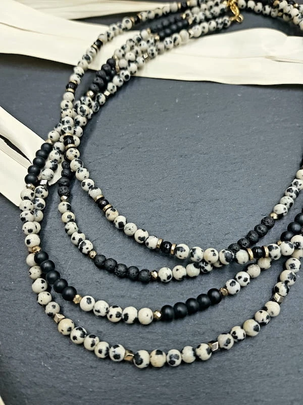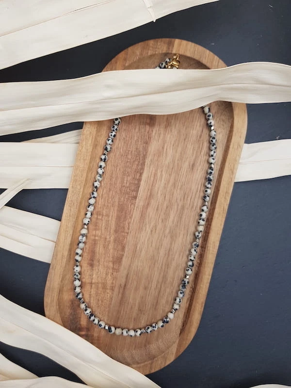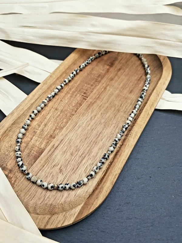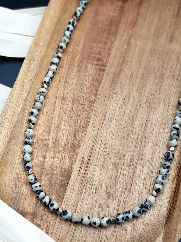 Naszyjnik z jaspisu dalmatyńskiego i złotego hematytu to delikatna kompozycja oparta na naturalnym rysunku kamieni i prostych formach. Gładkie kulki jaspisu dalmatyńskiego o średnicy 4 mm, z charakterystycznym, nieregularnym wzorem, tworzą lekką i harmonijną bazę naszyjnika.