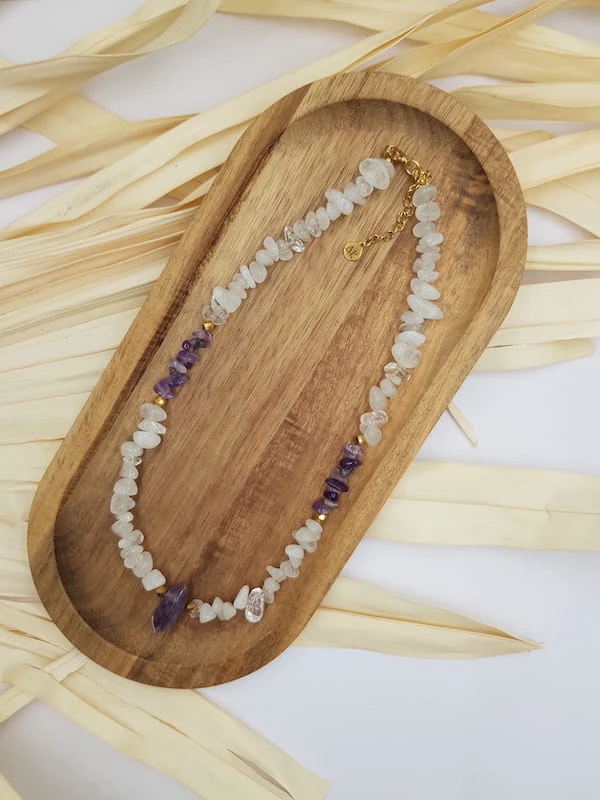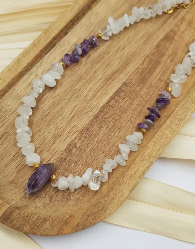 Naszyjnik z kryształem górskim i ametystem to kompozycja oparta na naturalnej formie kamieni i ich niepowtarzalnej strukturze. Sieczka kryształu górskiego i ametystu tworzy lekką, nieregularną linię, którą dopełnia fasetowany hematyt w złotym kolorze. Centralnym elementem naszyjnika jest grot ametystu o długości 21 mm, nadający całości wyraźny, ale nadal stonowany charakter.